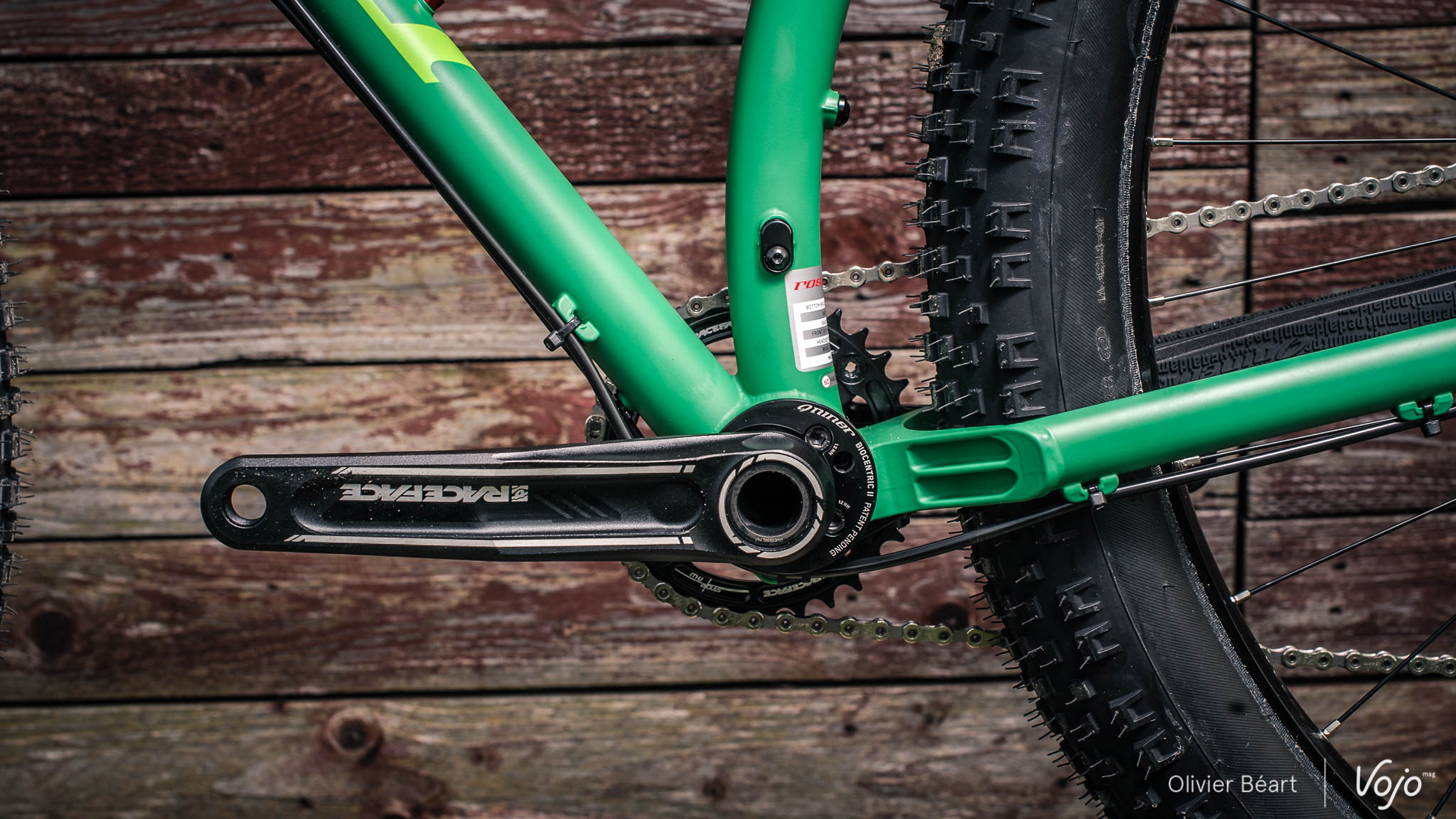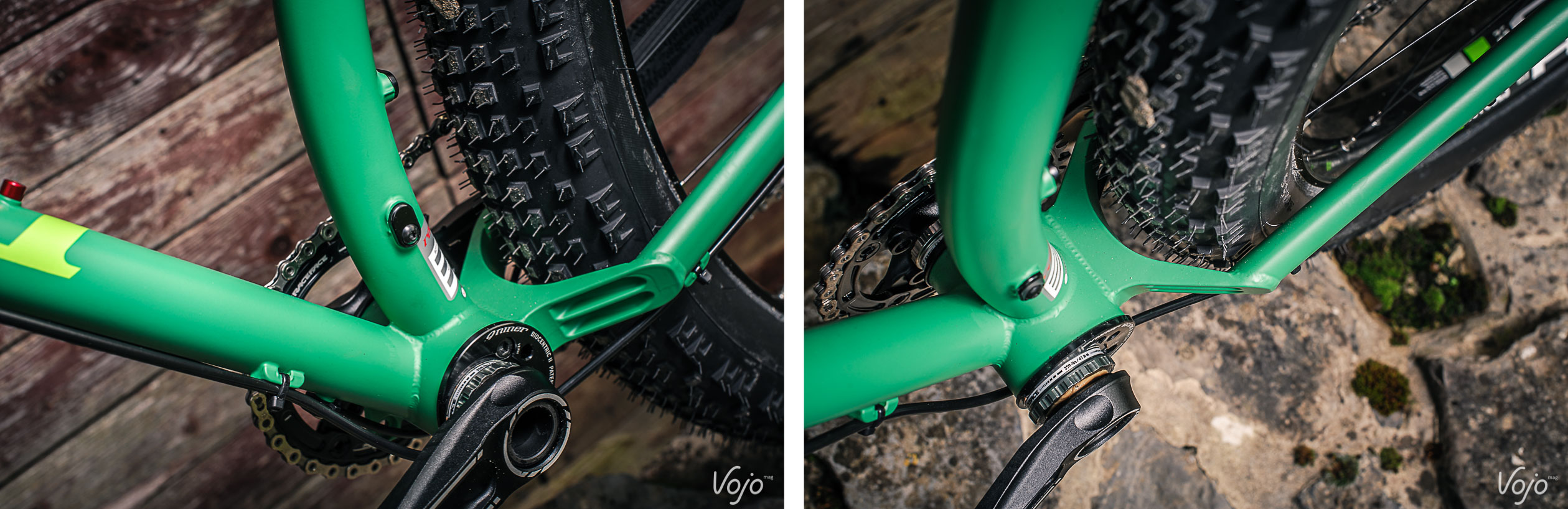 Certes, c’est 25mm de plus que le Trek Stache mais seulement 6mm de plus qu’un Niner Air9 RDO de XC, ou 18mm de plus qu’un Ros 9 pour pneus classiques. Le tout, en plus, avec un boîtier de pédalier BioCentric 2 qui permet de régler la tension de chaîne en cas de montage en singlespeed, ou simplement d’ajuster la position de son pédalier pour, par exemple, abaisser son centre de gravité en cas d’usage avec des vitesses.