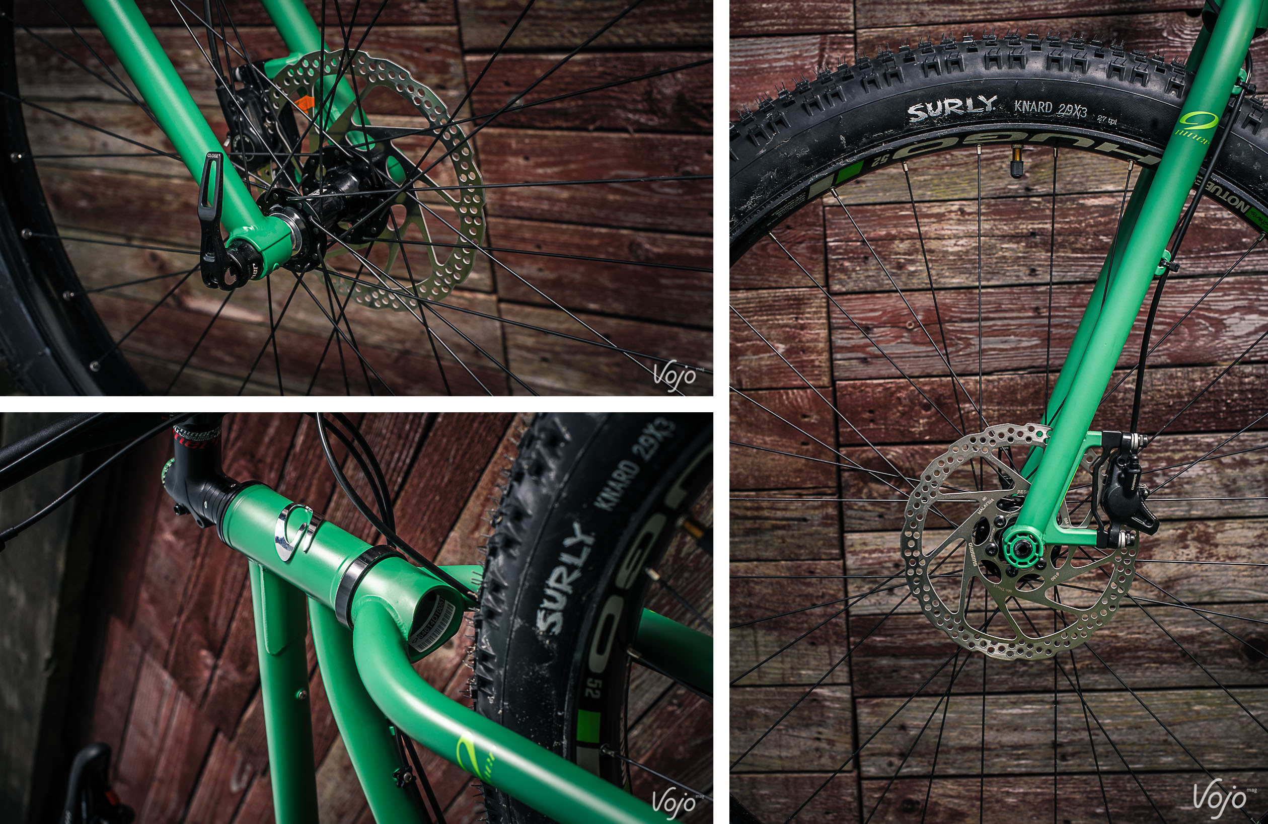 L’offre en pneus 29 Plus est aussi très réduite et cela ne semble pas prêt de changer, puisque les premières grandes marques qui ont annoncé leurs gros pneus 2.8 et 3.0 » (comme Schwalbe ou Specialized) ne proposent que du 27,5 ». Seuls Trek (Bontrager) et Maxxis ont choisi aussi de proposer un modèle de pneu en 29+… et Surly, qui était également un précurseur du « Plus » (comme du fatbike d’ailleurs) et qui a l’habitude de produire ses propres pneus. Ici, on trouve un modèle Knard doté de multiples petits crampons assez rapprochés.