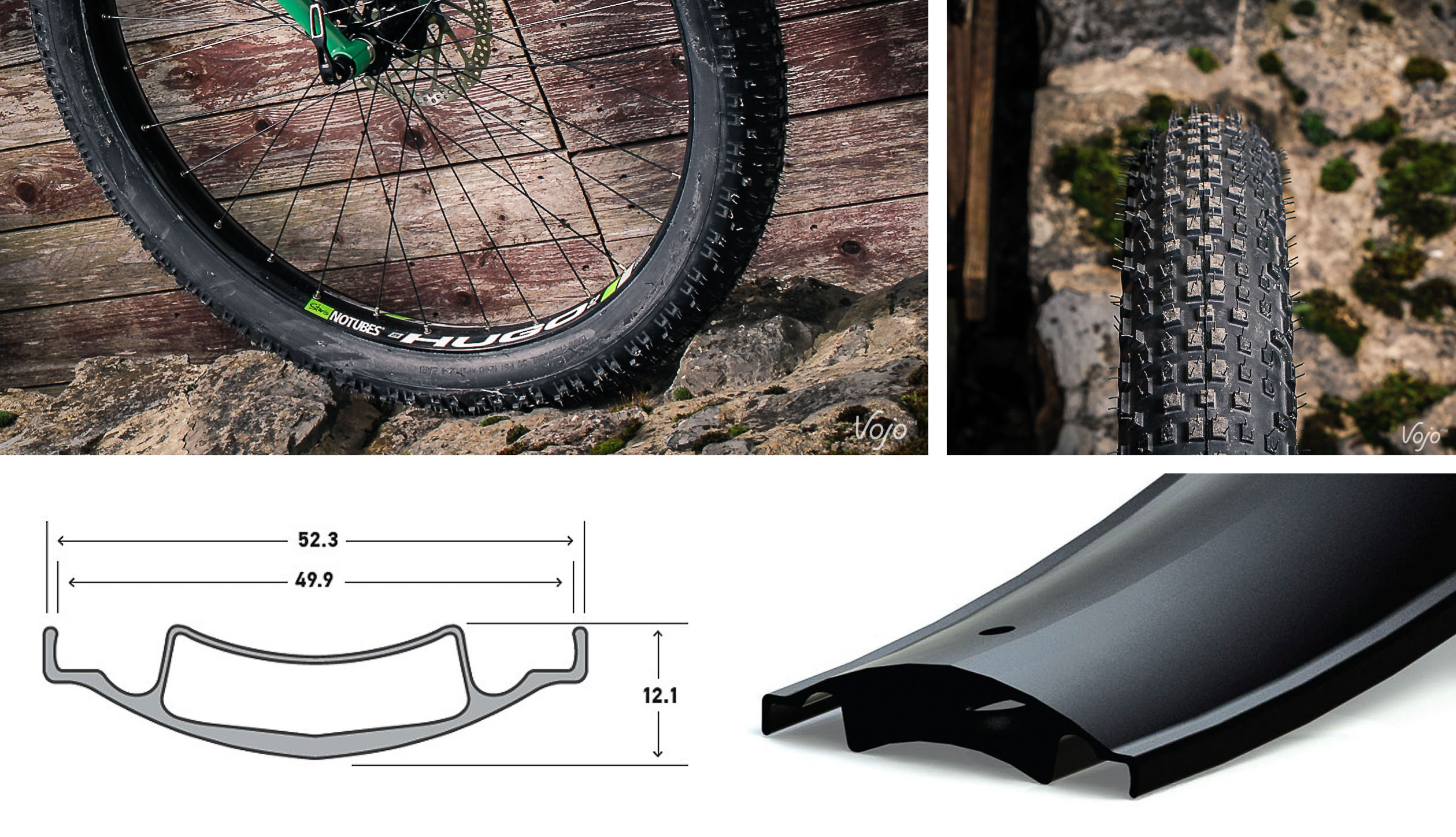 Puis, on laisse le meilleur pour la fin, il y a évidemment les roues et les pneus ! Les roues proviennent de chez NoTubes, qui a également été, après Surly bien sûr, un précurseur avec ses jantes Hugo en 52mm de large (50mm interne) au profil très particulier. Très plates, elles sont constituée d’un tunnel central qui assure la rigidité, couplé à des crochets particulièrement fins et déportés. Cette technique permet de préserver un poids raisonnable de 630g pour la jante seule, alors que la paire de roues pèse 2100g.