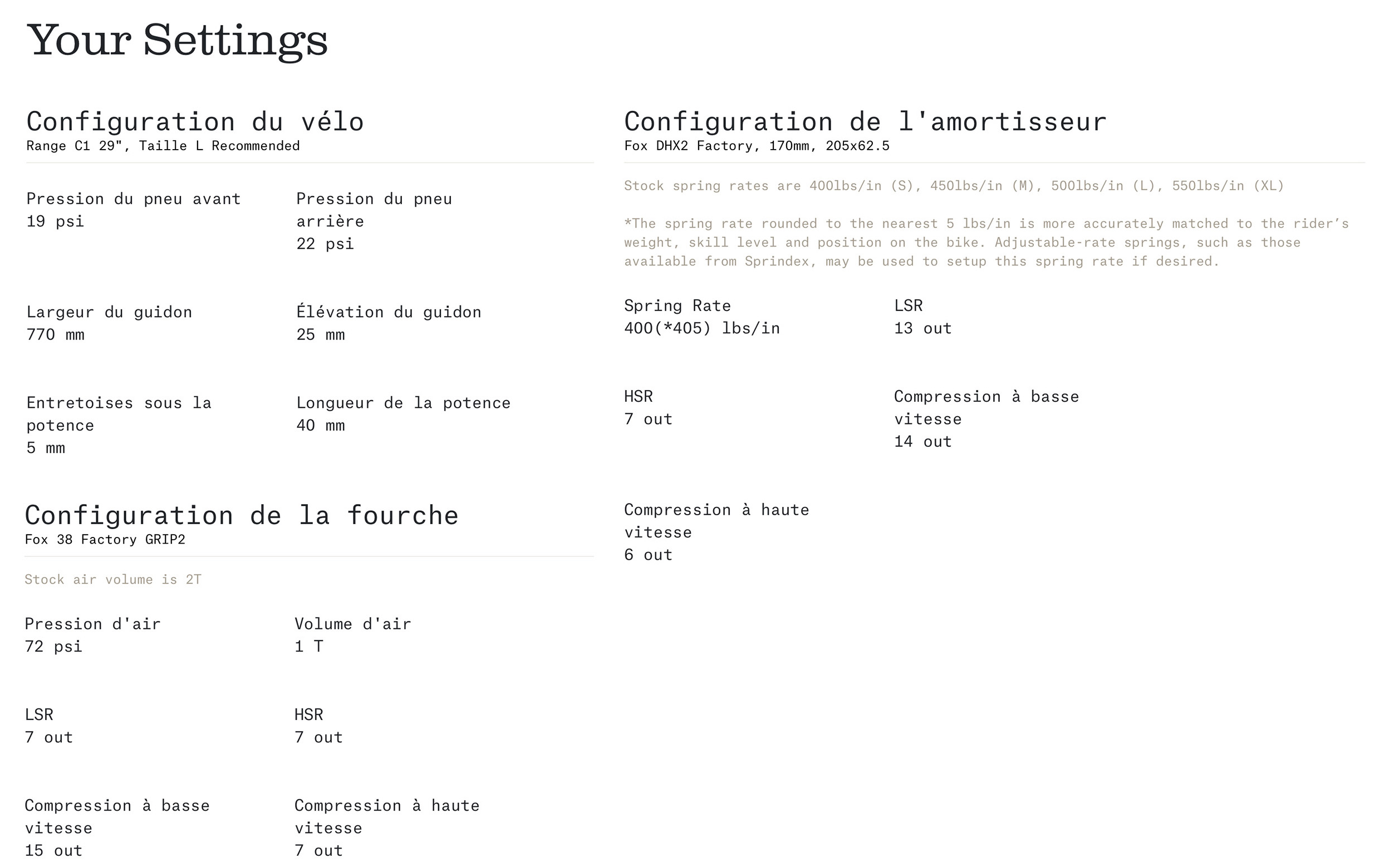 On notera enfin, sur notre modèle, des débattements de tige de selle généreux : 150 mm en taille S, 180 mm en taille M et 210 mm en taille L/XL. Toutefois, le Ride Aligned ne s’arrête pas là. Sur son site, Norco propose un guide de configuration interactif qui permet d’avoir une base de réglage très complète avant de monter pour la première fois sur son vélo. Indiquez votre poids, votre taille, votre niveau de pilotage et votre position (plutôt sur l’avant ou sur l’arrière) et voici tout ce que vous obtiendrez :