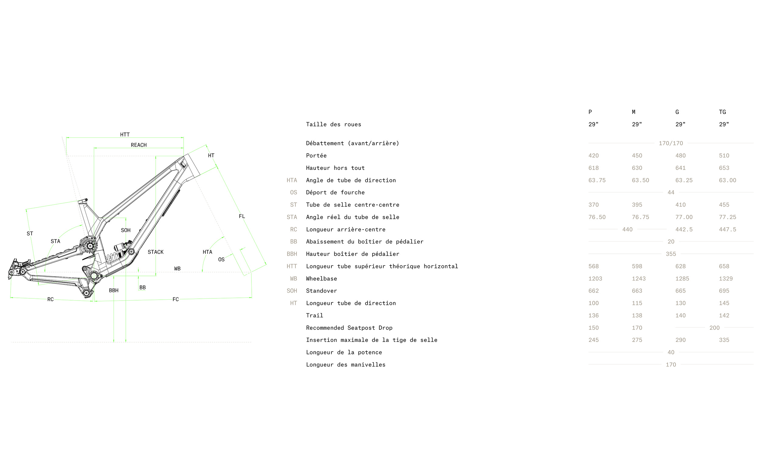 « Qu’est-ce que vous nous racontez-là, tout le monde fait pareil, c’est le principe même d’avoir plusieurs tailles », nous direz-vous. Sauf que la marque canadienne pousse les choses un peu plus loin : elle adapte l’angle du tube de selle (de 76,5 à 77,25°, plus droit sur les grandes tailles pour compenser le recul plus important) et la longueur des bases (de 440 à 447,5 mm) comme on le voit chez d’autres marques, mais aussi l’angle de direction (de 63,75 à 63°, plus droit sur les petites tailles) afin d’éviter « d’enfermer » les pilotes les plus petits dans un angle trop couché pour eux.