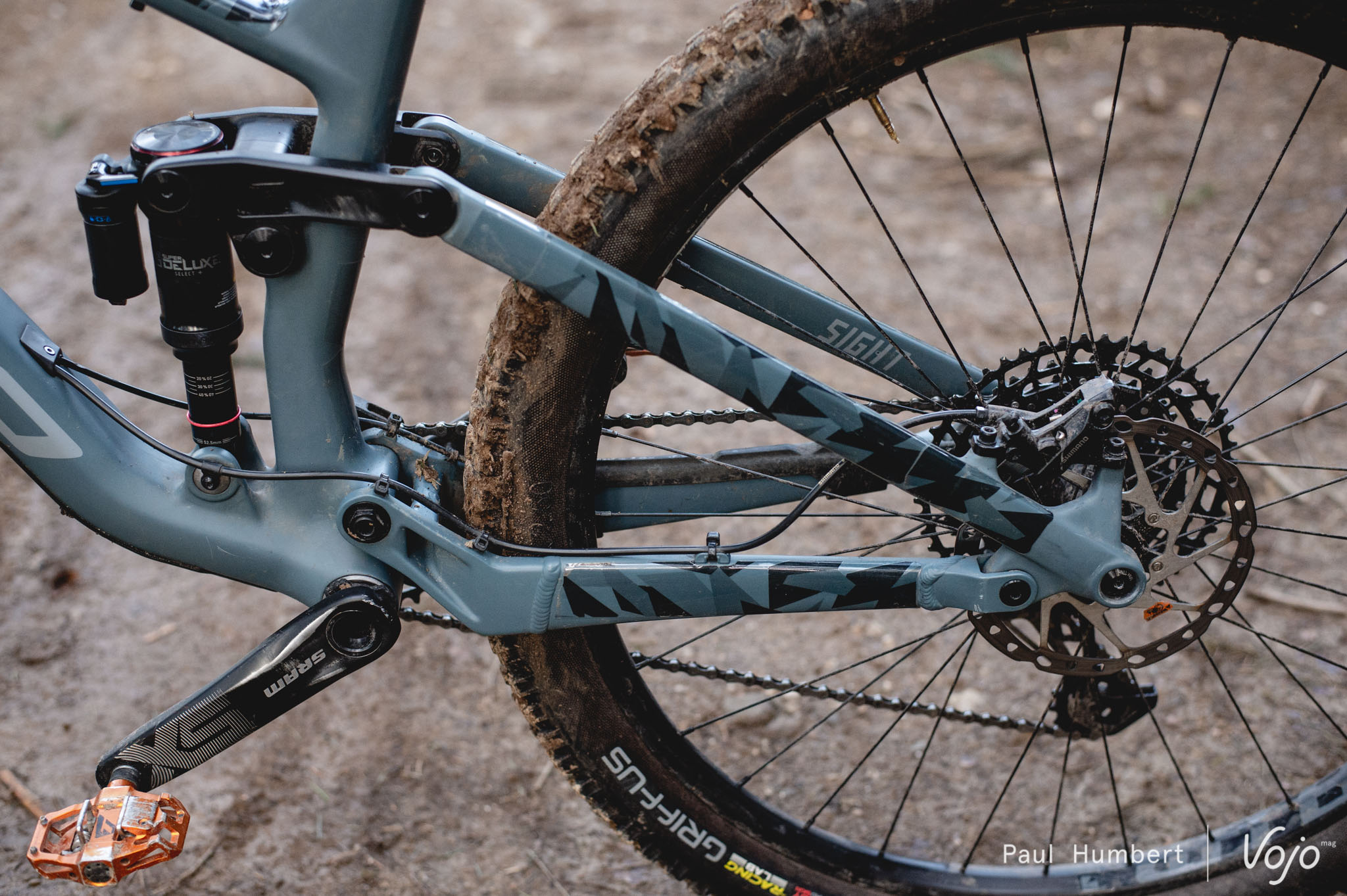 C’est très amusant de tirer tout droit dans les sections les plus chaotiques qu’on connaisse mais tous les chemins ont des virages, et au bout d’un moment, il va bien falloir ralentir ou tourner et c’est là que les problèmes font leur apparition. D’abord ceux liés à la plateforme et à la géométrie : le Sight est un vélo plutôt long, avec un angle de direction très couché et un offset court. Encore maniable à basse vitesse, il devient sous-vireur dans les virages serrés quand on va un peu plus vite et il faut un pilotage assez actif pour ne pas se laisser embarquer et finir dans le décor en sortie de virage.