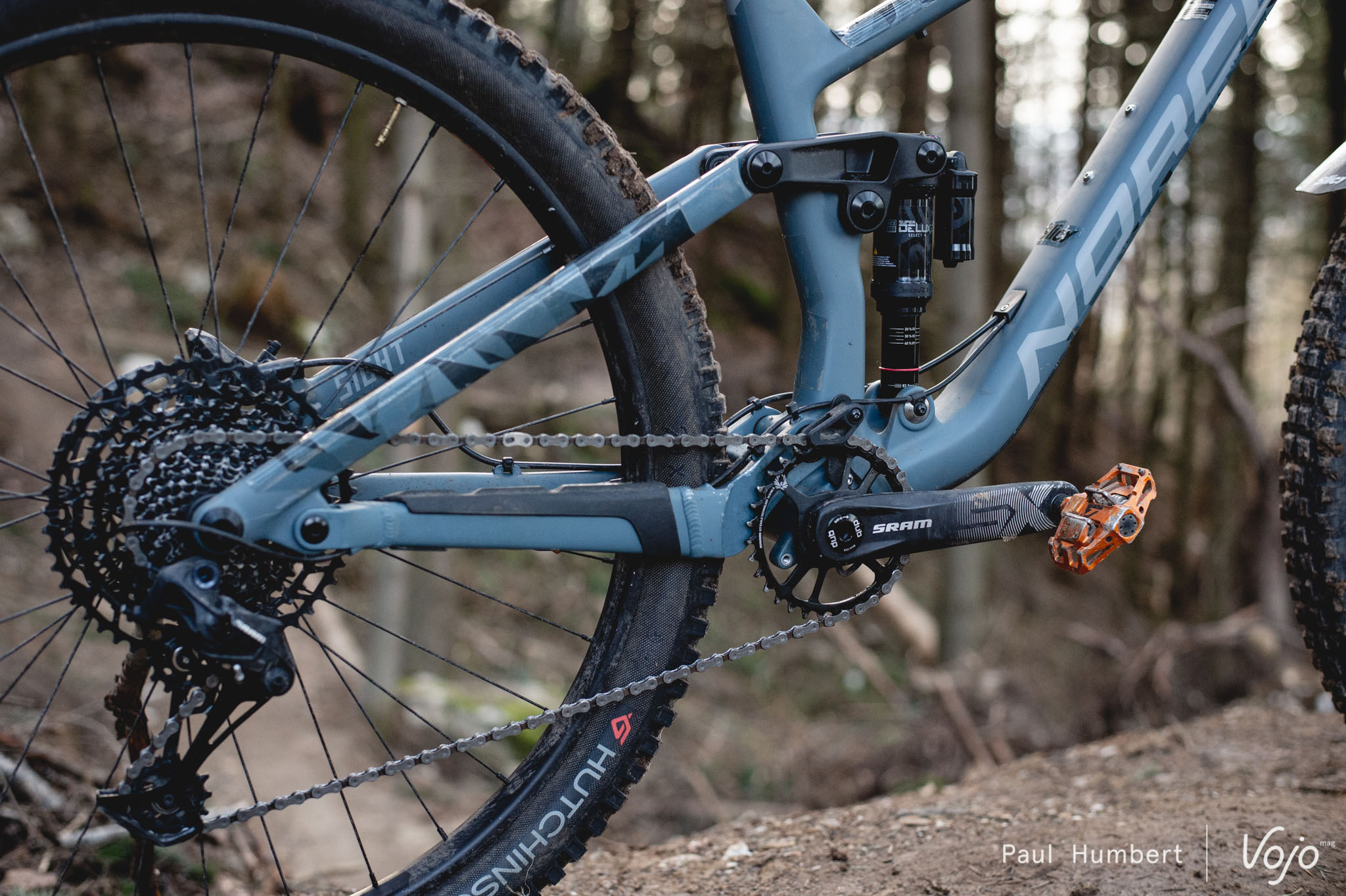 Enfin, on notera que le vélo est plutôt bruyant, entre les roues qui résonnent à chaque choc et le protège-base qui protège ce qu’il peut mais ne réduit absolument pas le bruit des impacts de la chaîne sur le cadre. On s’y fait mais il y a clairement quelque chose à revoir de ce côté, les longs pavés adoptés par Norco semblent bien moins efficaces que les petites lamelles choisies par beaucoup d’autres marques.