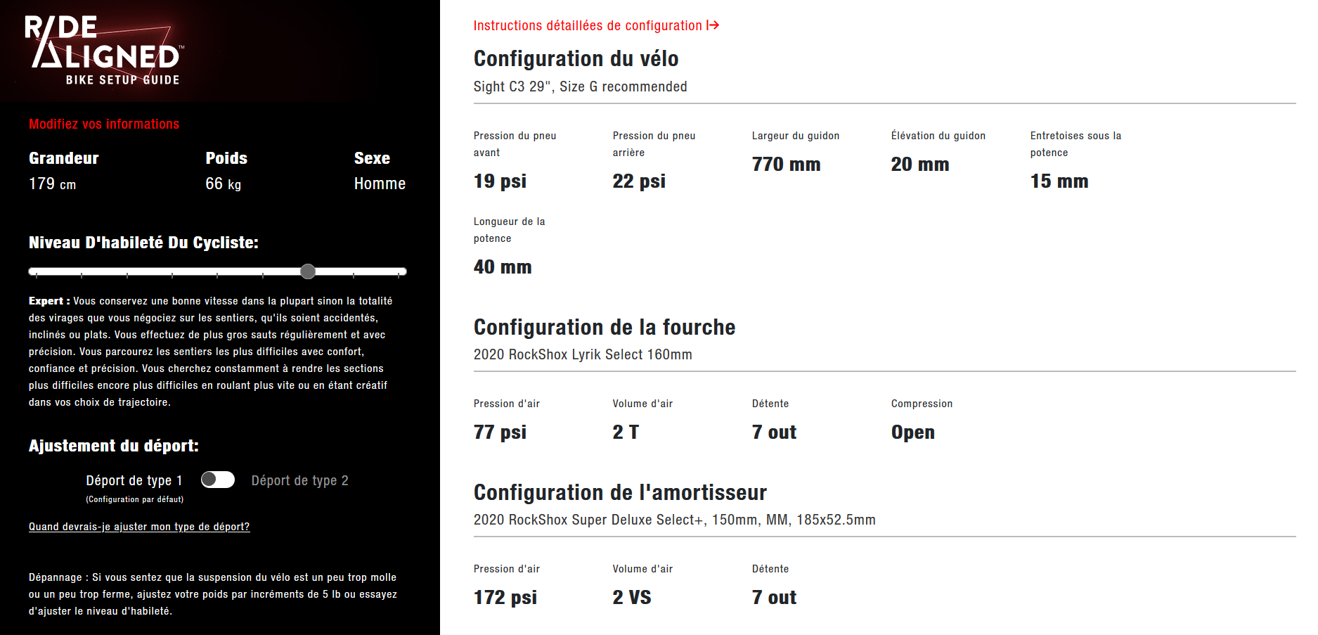 Pour vous aider dans vos premiers réglages, la marque propose sur son site le Ride Aligned Setup Guide, un outil très complet qui vous indiquera vos pressions de pneus et de suspensions, les réglages de rebond ou encore le nombre de tokens à ajouter suivant le modèle précis de vélo, votre taille, votre poids, votre sexe et votre niveau de pilotage. Trop pressés d’aller rouler, nous n’avons découvert l’existence de ce guide qu’après le test et nous ne pouvons donc pas nous prononcer sur la justesse des recommandations mais les valeurs paraissent cohérentes pour une base de travail.