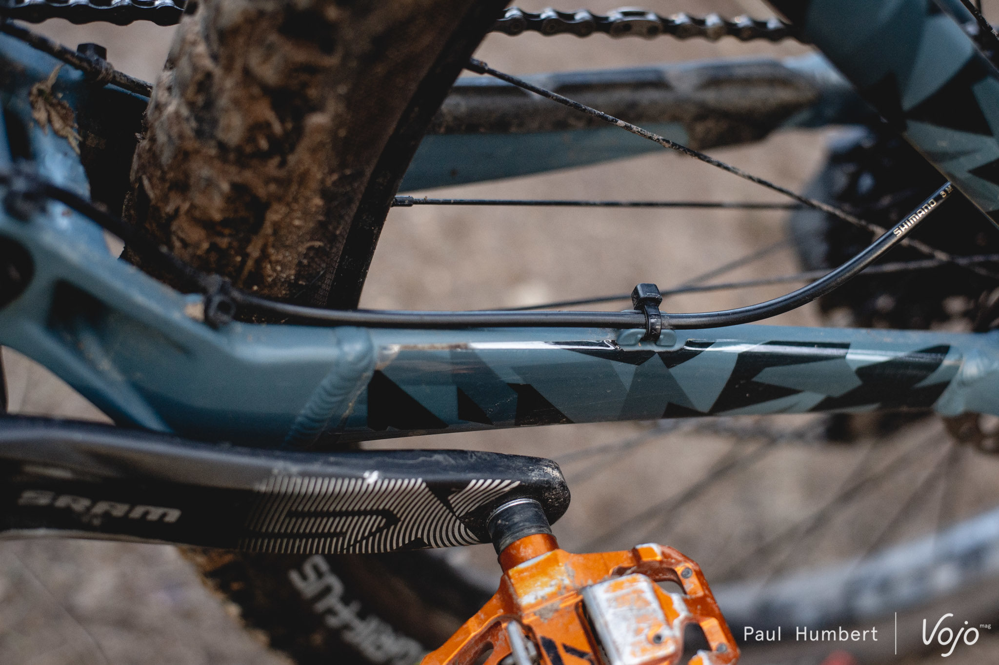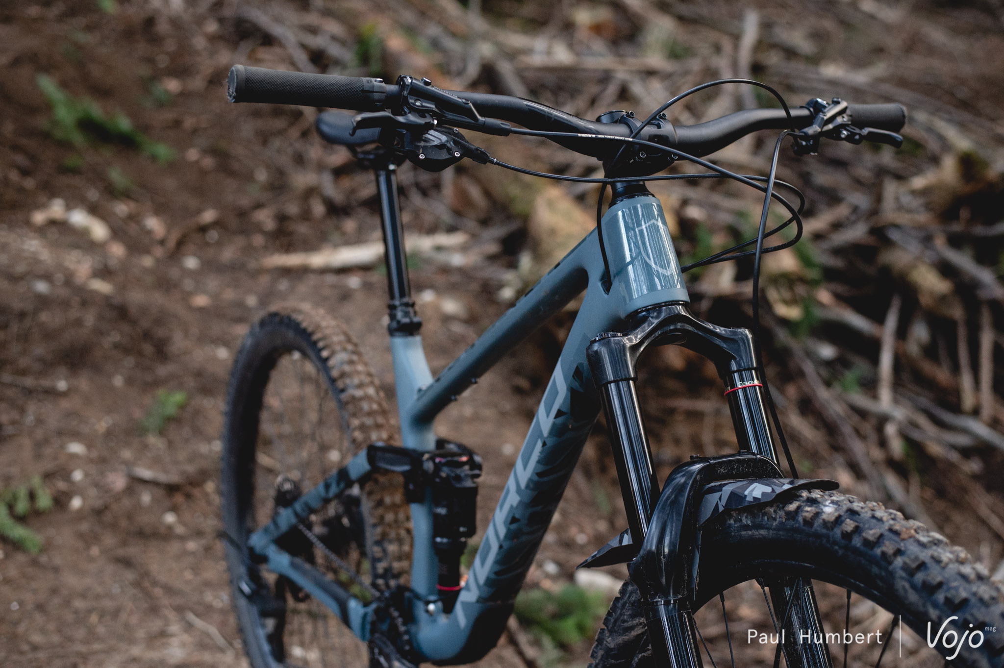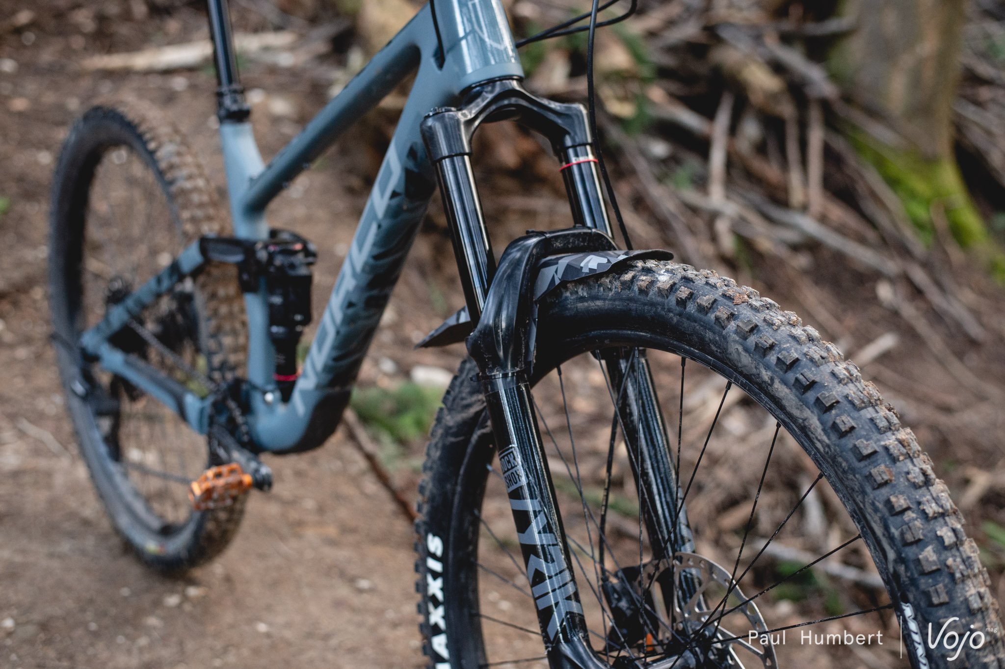 On ne vous cache pas que pour ce prix, on aurait aimé voir un peu mieux, au moins sur un poste en particulier (suspension, freins, transmission ou roues). Ici, rien ne se détache et certains éléments paraissent un peu hors programme, comme les pneus Maxxis en carcasse Exo, très souple et légère et pas vraiment à sa place sur un vélo avec une telle géométrie et autant de débattement. Comme vous pouvez le voir sur les photos, nous avons d’ailleurs essayé d’autres pneus sur le vélo (Hutchinson Griffus et Specialized Butcher notamment), pour mieux cerner le comportement de la plateforme, sans être limité par les gommes.