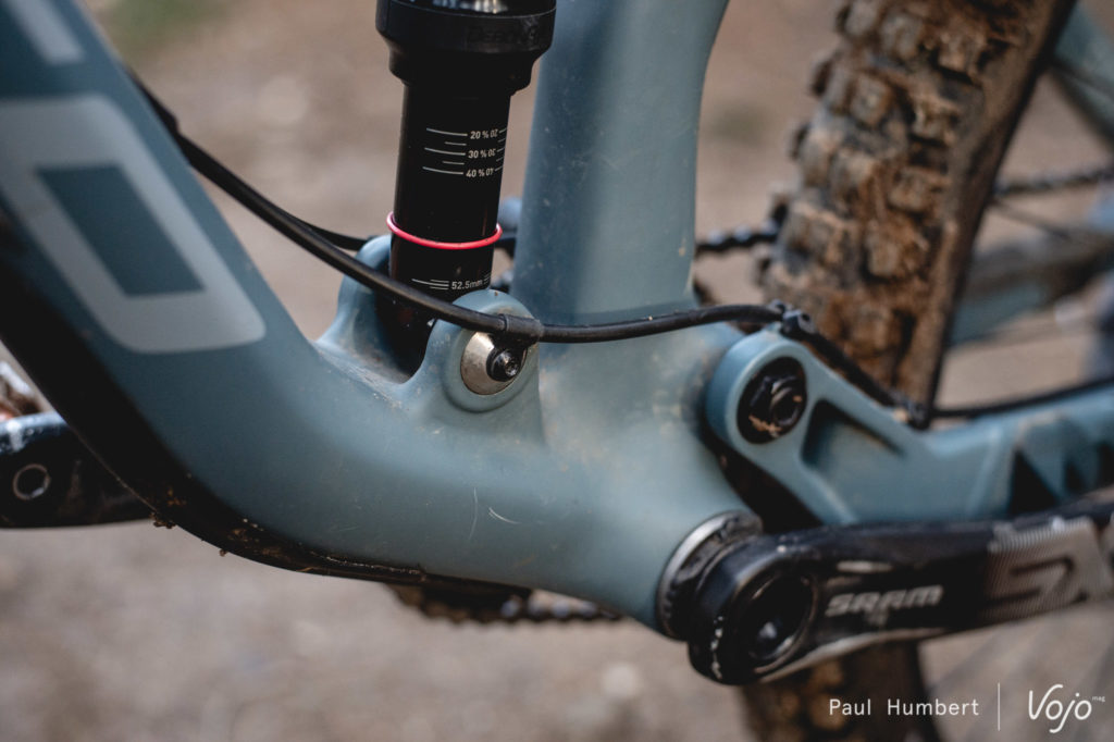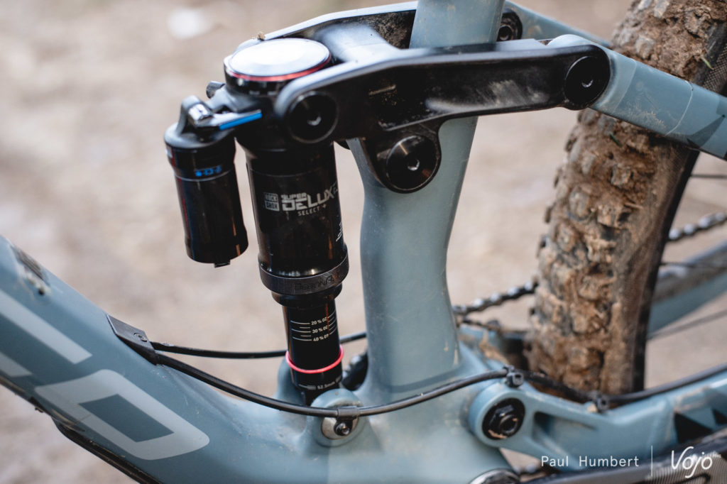 Sur le papier, la suspension affiche des ratios assez élevés (de 3,22 en début de course à 2,62 en fin de course) et paraît plutôt linéaire, avec environ 18,5 % de progressivité. C’est moins que le nouveau Transition Sentinel par exemple, assez similaire dans sa conception mais qui affiche 25 % de progressivité. Traduit en termes terrain, cela signifie qu’on s’attend à avoir un vélo pas spécialement dynamique et plutôt posé, du genre à encaisser tout ce qu’on lui présente en gardant les roues au sol : avec un bras de levier important, la suspension devrait pouvoir se compresser facilement sous les actions du pilote et face aux obstacles.