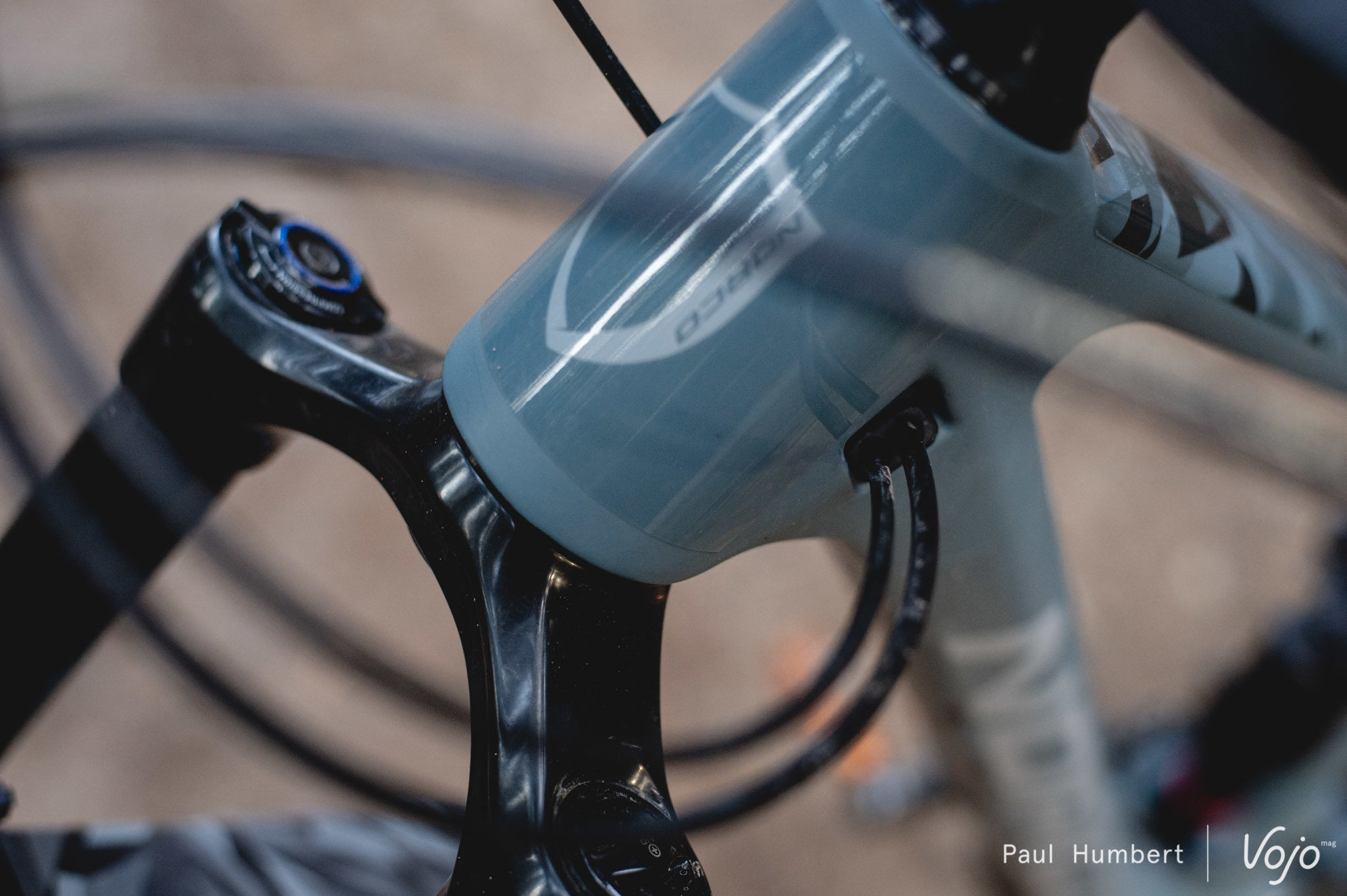 Lorsqu’on s’approche un peu plus, on remarque néanmoins plusieurs petits détails intéressants qui montrent qu’on est bien sur un nouveau cadre et pas un simple « recyclage » de l’ancienne plateforme. On pense notamment aux trajets de gaines et de Durits, toujours en interne et non guidés dans le triangle avant, mais qui passent désormais au-dessus du boitier de pédalier plutôt qu’en dessous, là où ils étaient exposés aux chocs. Pour les maintenir en place, Norco a opté pour une solution connue mais toujours appréciée, avec des petits guides montés directement sur le point d’ancrage de l’amortisseur.