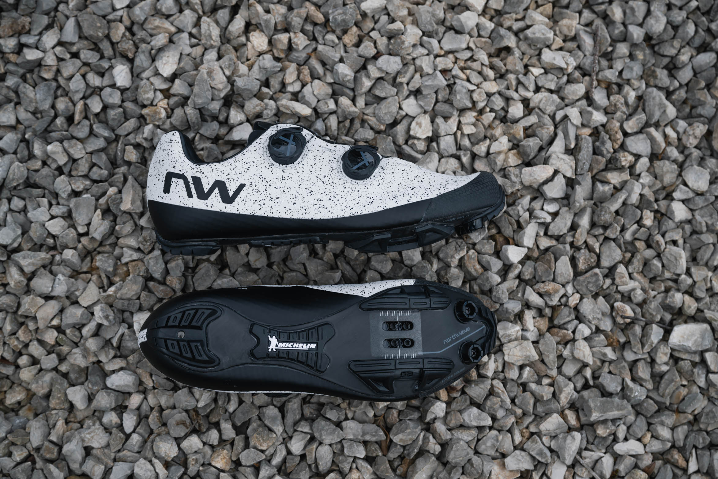 Annoncées à 329,99€, les Northwave Extreme XC 2 sont véritablement des chaussures haut de gamme, et un cran au-dessus encore des Rebel 3 qui affichent un tarif inférieur de plus de 100€. Celles-ci sont disponibles en noir ainsi qu’en blanc et moucheté comme sur les photos de cet article. Sur la balance, les Extreme XC 2 affichent un surpoids d’environ 50 g par rapport aux Rebel 3 (365 g contre 317 g).