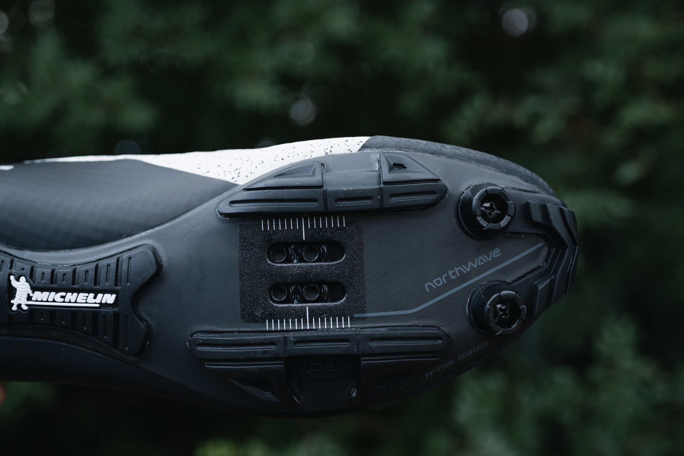 De l’autre côté du pied, la semelle est en carbone/composite et offre un indice de rigidité de 12 sur 14 chez Northwave. Le carbone est apparent et renforcé au niveau de la zone où se place la cale, sur l’avant du pied. Elle est recouverte d’inserts en caoutchouc pour offrir une meilleure accroche. Comme de coutume sur ce genre de chaussure, on peut également y adjoindre deux pointes en métal ou en caoutchouc sous l’avant-pied, pour plus d’accroche dans les conditions difficiles. On note aussi que la plage de réglage de la cale est assez importante, ce qui est appréciable.