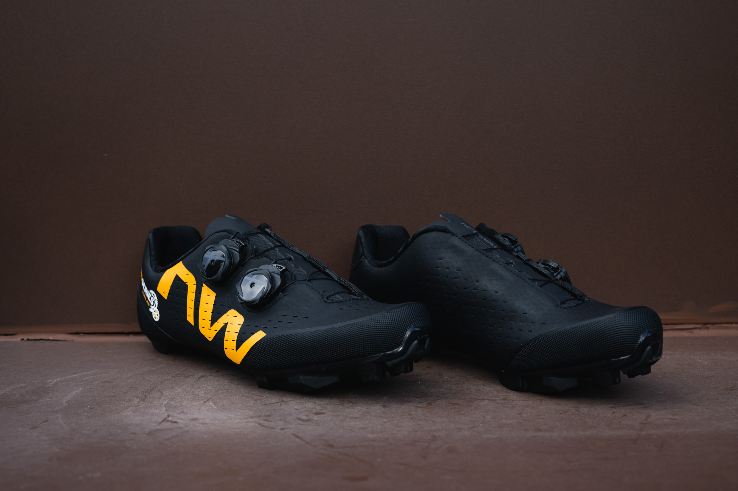 Quand on prend possession de ces deux paires, difficile de dire d’emblée laquelle est la plus haut de gamme. Par contre, on voit clairement qu’on est en présence de modèles très raffinés et de qualité : panneaux principalement thermo collés sur la partie haute, renforts judicieusement placés, semelle en carbone apparent et système de fermeture de type « Boa » (euh, pardon, X-Dial SLW3),… il y a tous les ingrédients pour faire des chaussures performantes pour un usage XC sportif/compétitif et aussi gravel.
