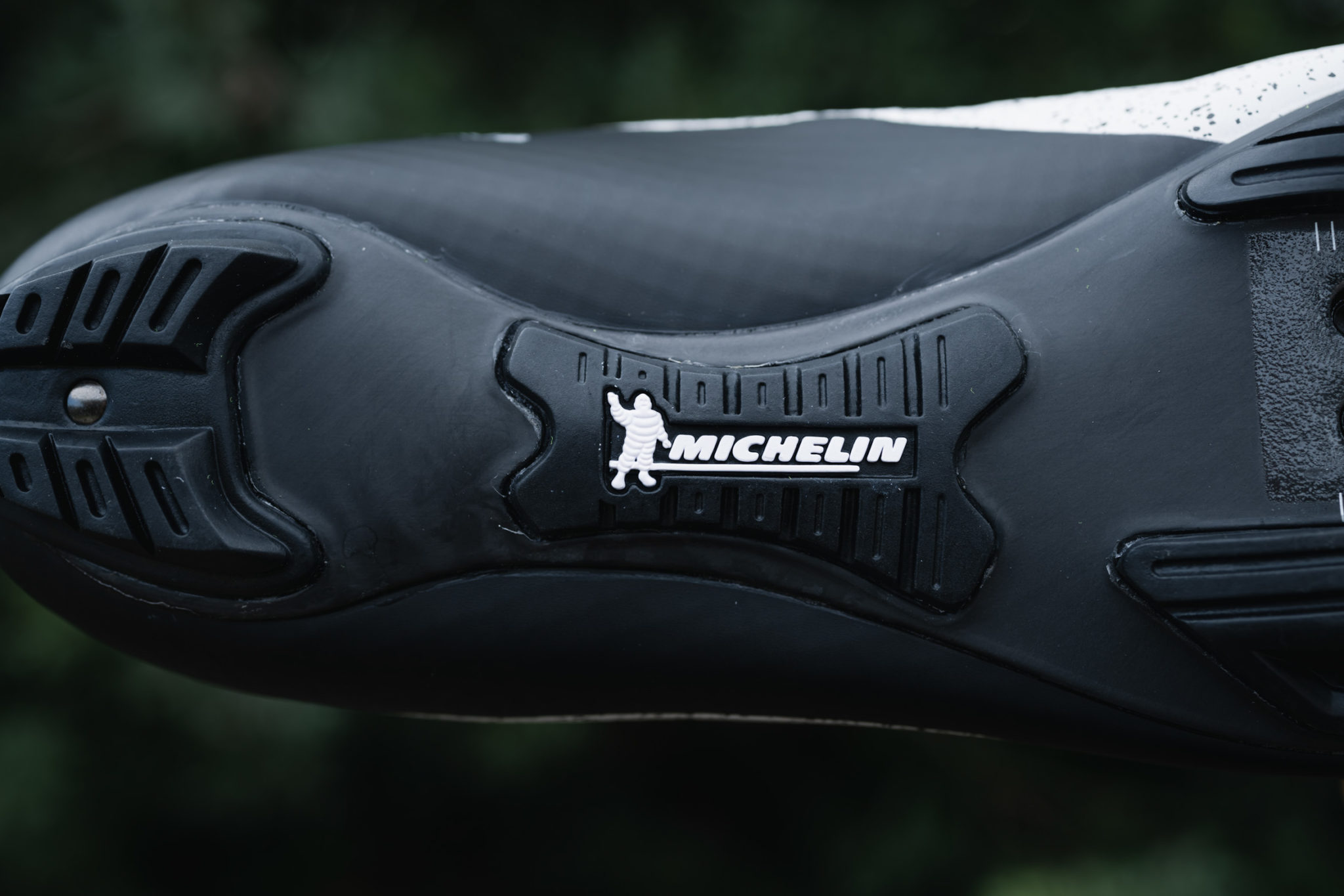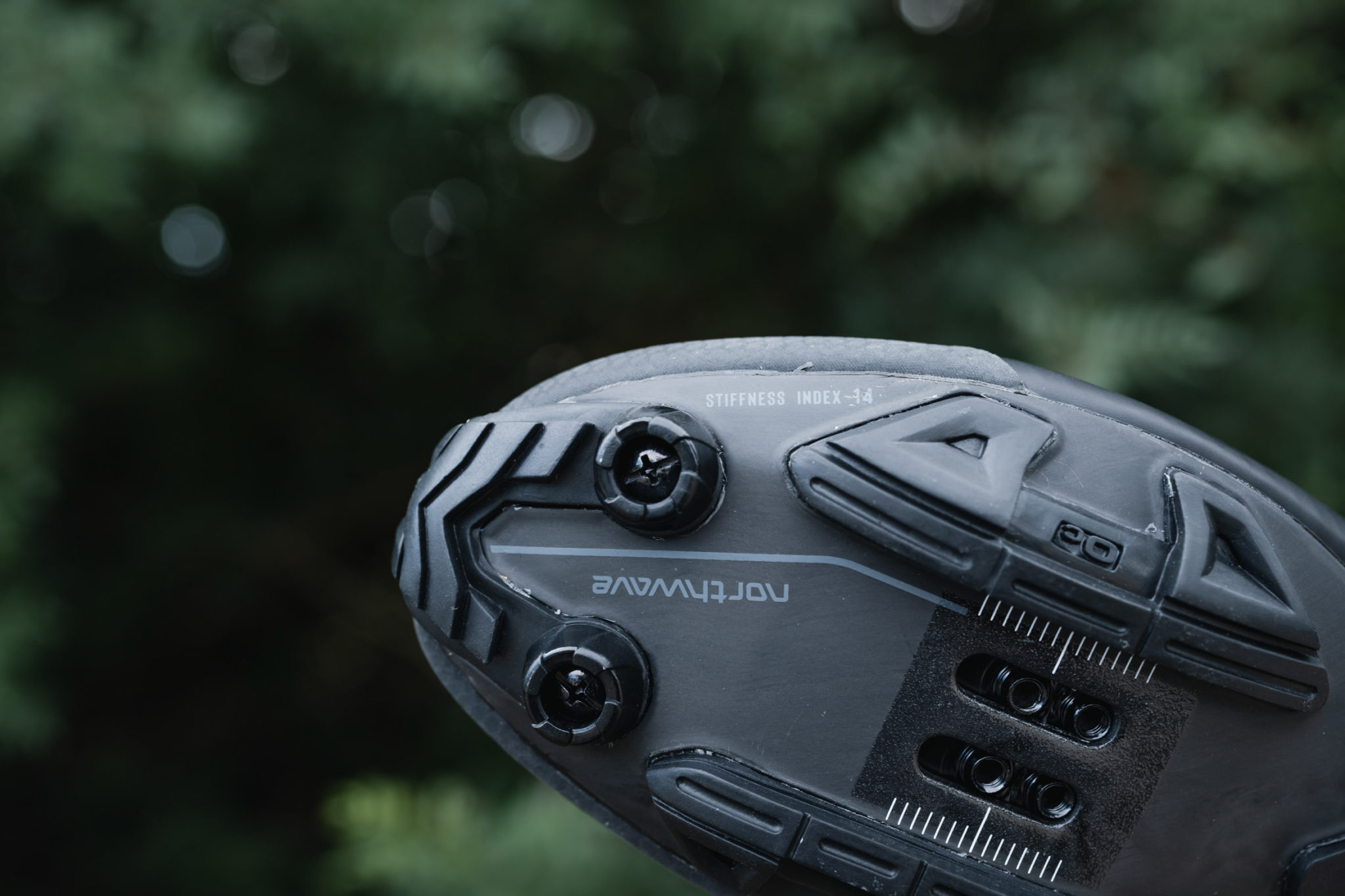 De l’autre côté du pied, la semelle est en carbone/composite et offre un indice de rigidité de 12 sur 14 chez Northwave. Le carbone est apparent et renforcé au niveau de la zone où se place la cale, sur l’avant du pied. Elle est recouverte d’inserts en caoutchouc pour offrir une meilleure accroche. Comme de coutume sur ce genre de chaussure, on peut également y adjoindre deux pointes en métal ou en caoutchouc sous l’avant-pied, pour plus d’accroche dans les conditions difficiles. On note aussi que la plage de réglage de la cale est assez importante, ce qui est appréciable.