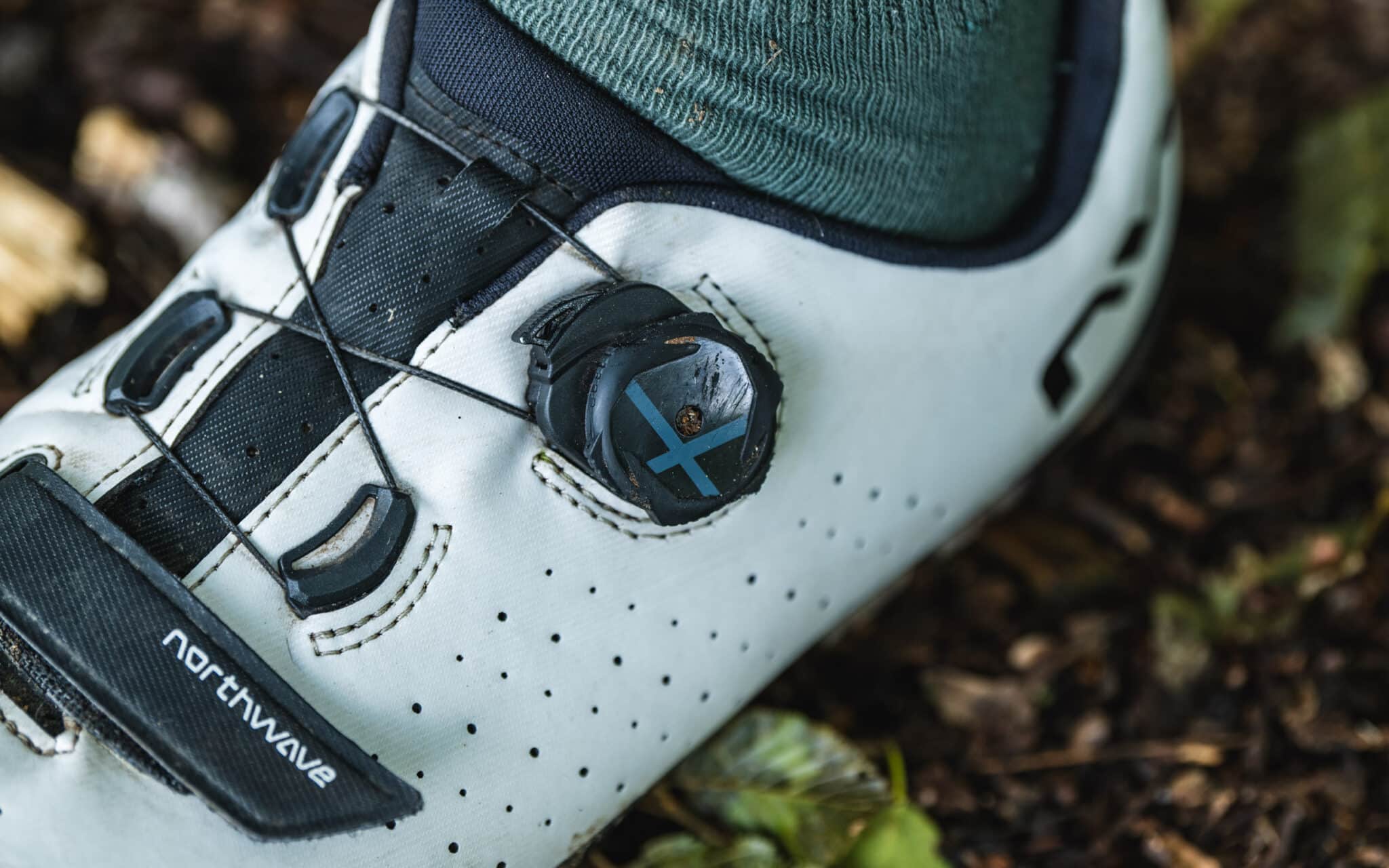 Pour le serrage, pas de BOA comme d’habitude chez Northwave mais un autre système imaginé par X-Dial, le SLW3. Il combine une molette à un petit bouton et fonctionne de la manière suivante : pour serrer, on tourne la molette de façon habituelle et pour desserrer, on peut soit y aller clic par clic en poussant sur le bouton (pour un réglage précis), soit tout libérer d’un coup en le tirant dans l’autre sens. Ce système est associé à une bande velcro sur l’avant du pied.