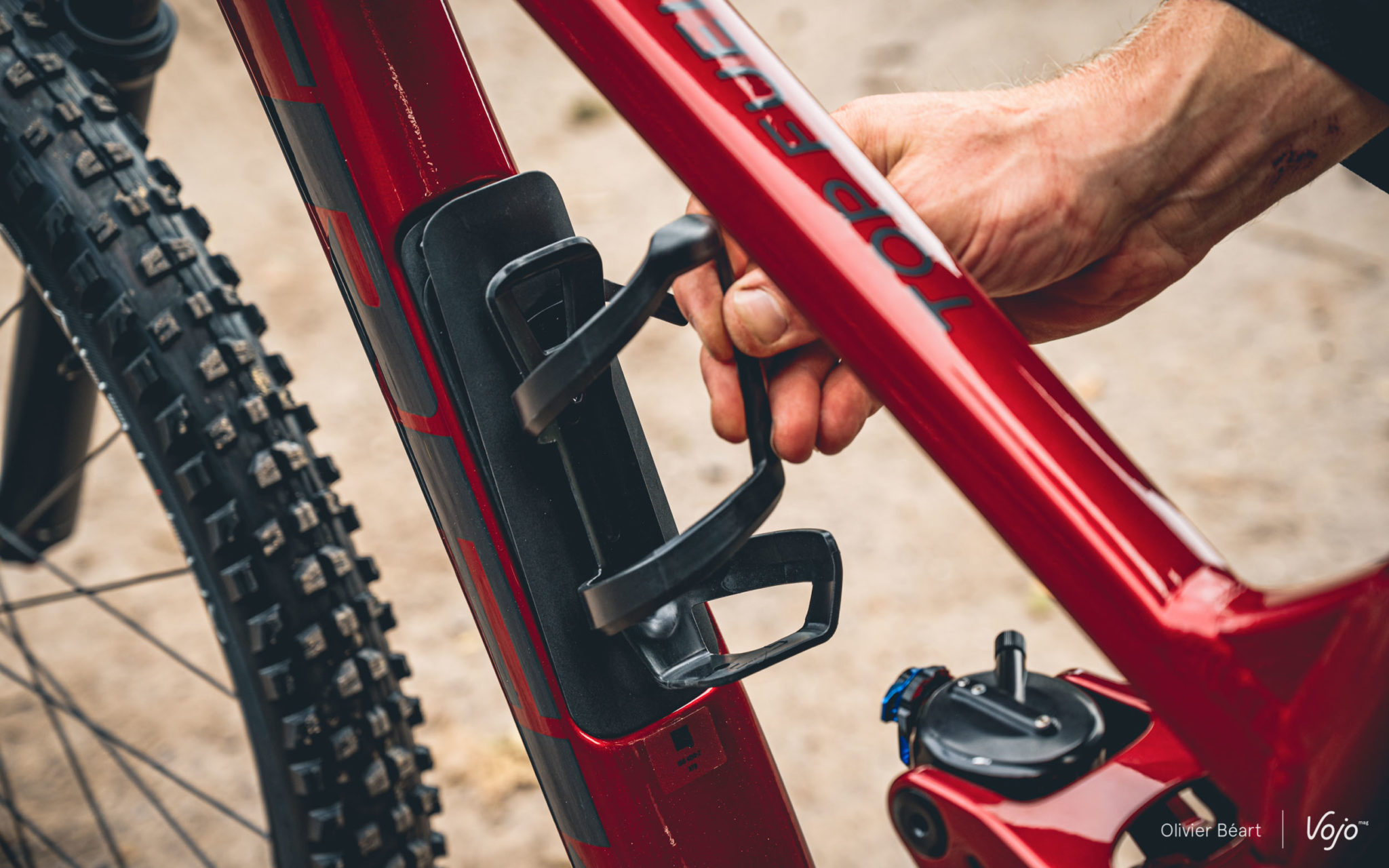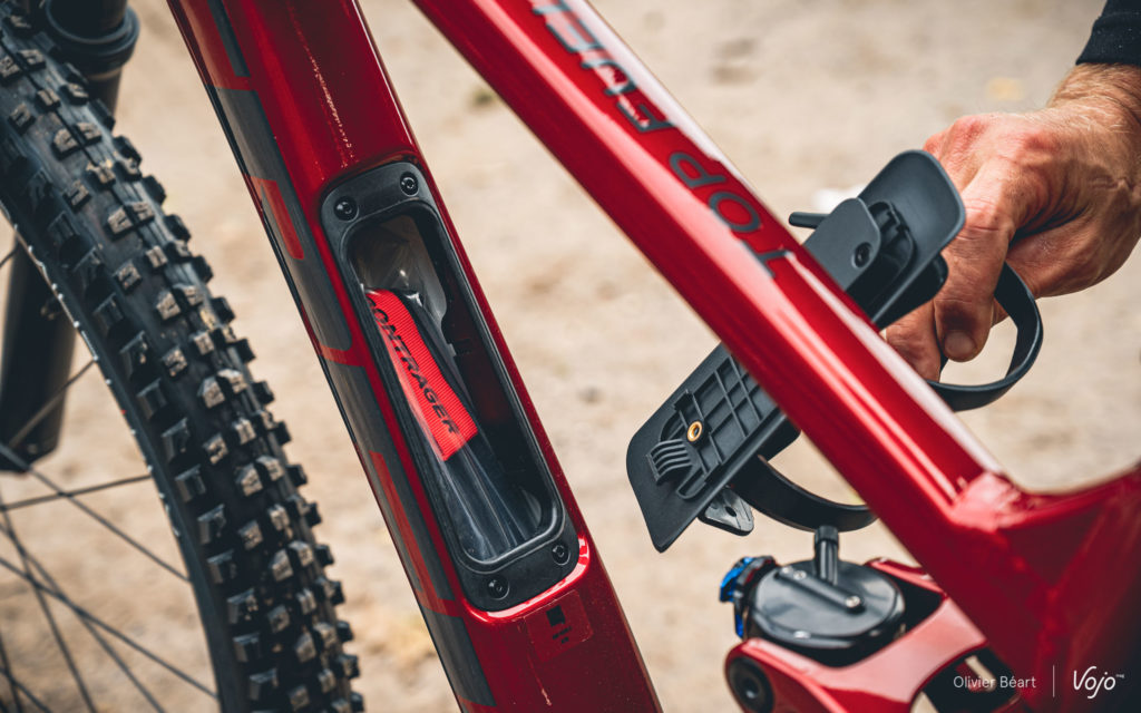 Les Américains ont également pensé au stockage. Ce n’est pas un nouveau concept chez Trek, mais maintenant toutes les versions, y compris les cadres en aluminium, ont un compartiment de rangement dans le tube diagonal. Un casse-croûte, des outils ou des vêtements de rechange, dans une certaine limite, peuvent ainsi être rangés dans le cadre. C’est un élément que nous connaissions déjà sur les cadres en carbone, mais sur les cadres en aluminium c’est rare compte tenu des modifications structurelles que cela implique. De manière générale, la finition de notre Trek Top Fuel 8 XT peut être qualifiée d’exceptionnelle.