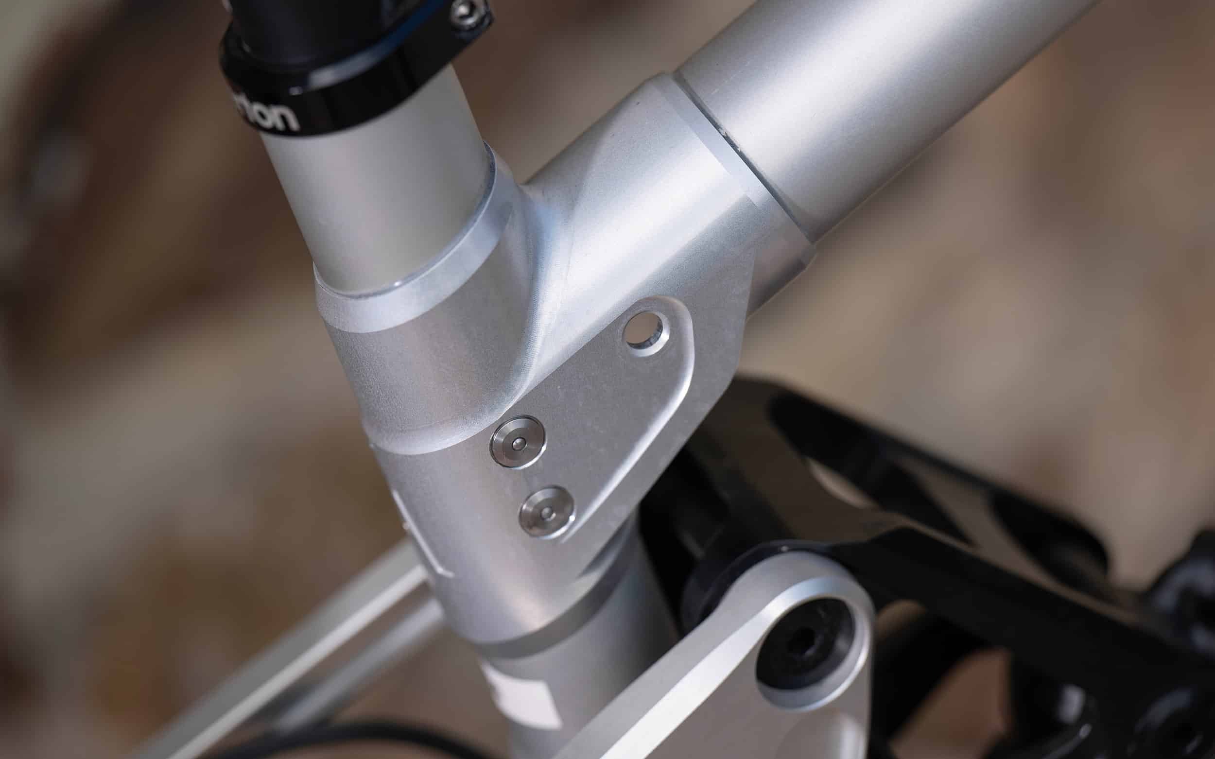 Les modèles S sont entièrement fabriqués en aluminium, et plus précisément en alliage 7075, connu pour sa robustesse et rarement utilisé dans le monde du VTT. La raison ? Le matériau est difficile à souder, car la chaleur générée pendant le processus peut le rendre cassant et compromettre l’intégrité de la soudure. Une difficulté qui importe peu chez Atherton Bikes puisque ceux-ci font fi des soudures.