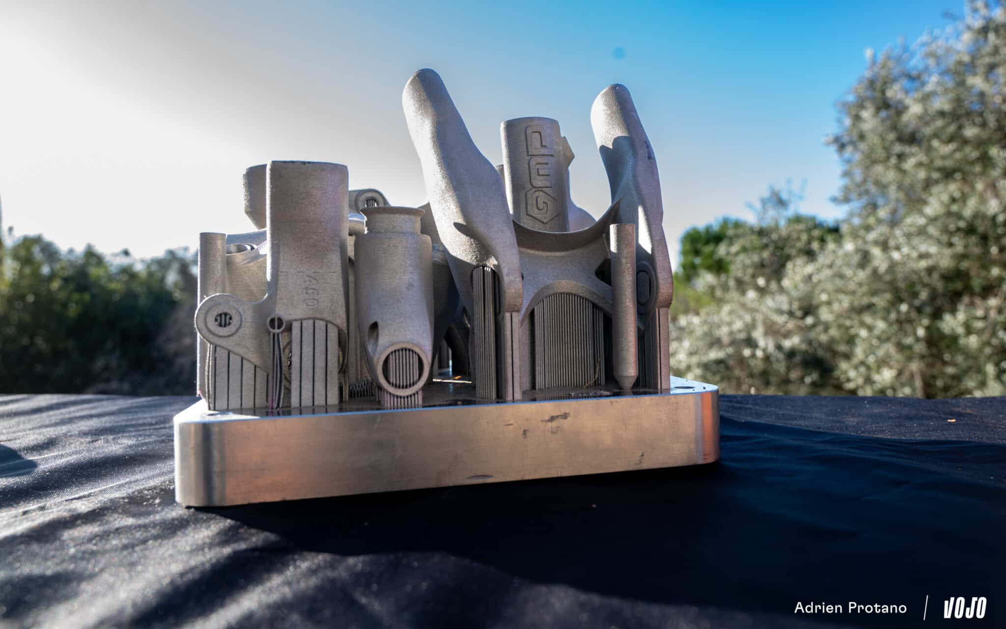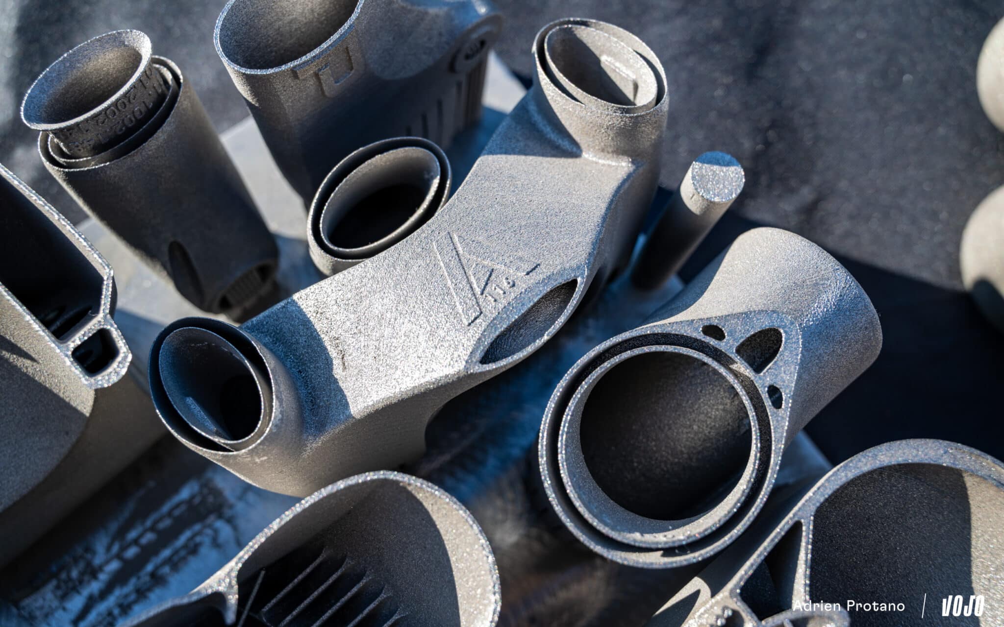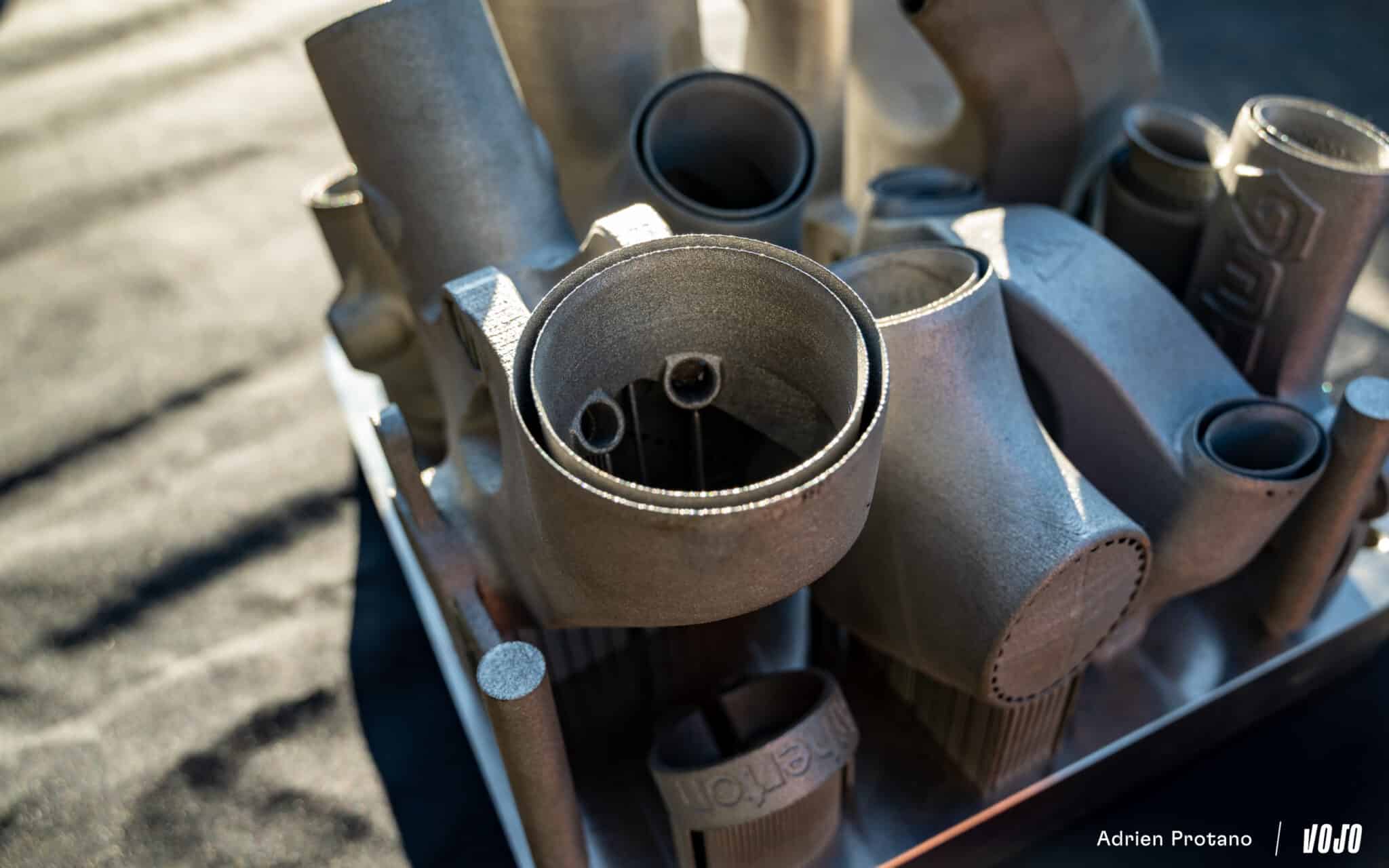 Ce bloc tout droit sorti de l’imprimante 3D permet de visualiser à quoi ressemblent les raccords bruts en titane. Après l’impression, un travail humain est encore nécessaire pour parvenir à la pièce finale. C’est notamment le cas pour ces filaments de part et d’autres qu’il faut retirer, ou encore pour le logo qu’il faut poncer. « C’est un vrai travail d’artisan, ça prends beaucoup de temps », explique la marque.