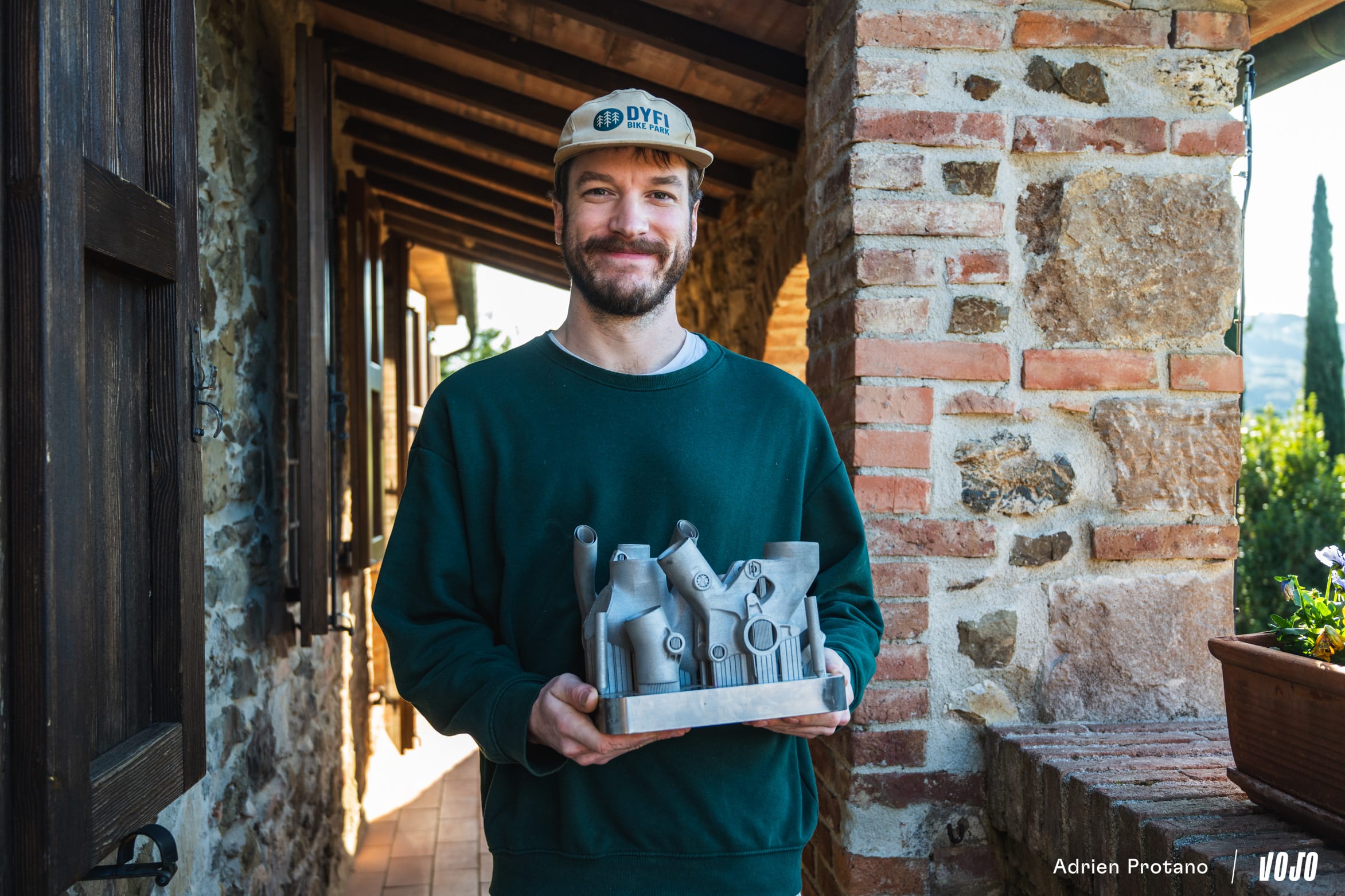 La marque a emmené de drôles de choses dans ses valises pour nous illustrer le processus de fabrication de ses cadres. C’est Jamie Kirkbride, responsable de la production, qui nous explique : « On a deux types de production : les modèles « A », qui signifie « Additif », et « S » pour « Soustractif ». Pour tous les modèles A, la matière est ajoutée par impression 3D, tandis que pour les modèles S, la matière est enlevée par usinage CNC. Cela permet aussi de déduire plus facilement le matériau utilisé puisque « A » fait référence aux modèles à tubes en carbone, tandis que « S » à ceux en aluminium. »
