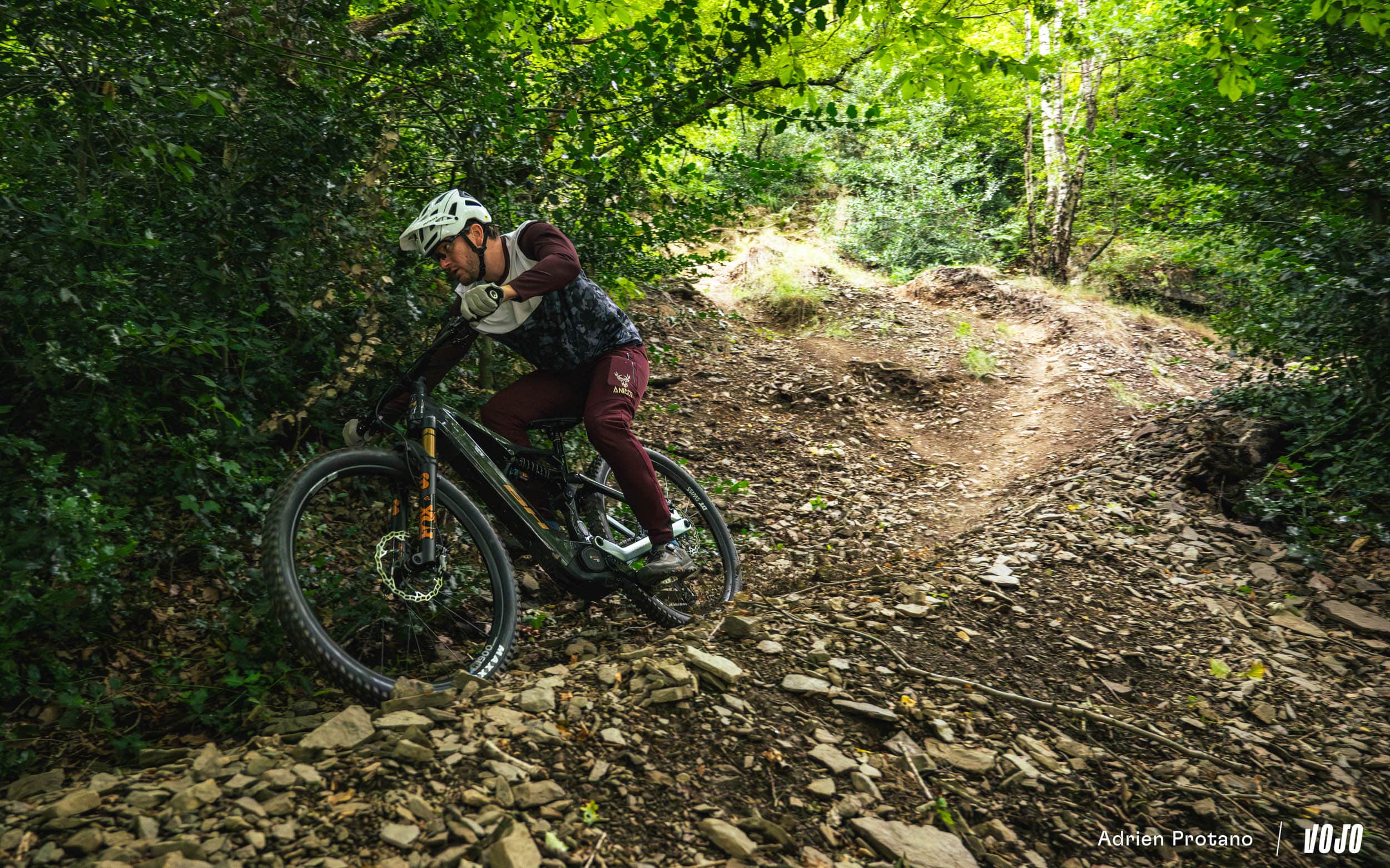 Cela met en lumière que le plus important sur une fourche, ce n’est pas son débattement, ni le diamètre de ses plongeurs, mais bien ce qu’il y a à l’intérieur. Et, ici, elle bride clairement les performances et l’agrément ressenti en descente. C’est dommage car le vélo marche déjà franchement bien tel quel et on a un large sourire quand on enchaîne les spéciales en descente, même si on sent que les bras fatiguent et que le châssis ne peut pas délivrer tout son potentiel. A propos du châssis, il faut souligner que le travail sur la rigidité du cadre est excellent : c’est assez rigide pour être précis et homogène, mais sans aucun excès, et on est sur un carbone conciliant qui filtre bien les vibrations sans verser dans la rigidité excessive.