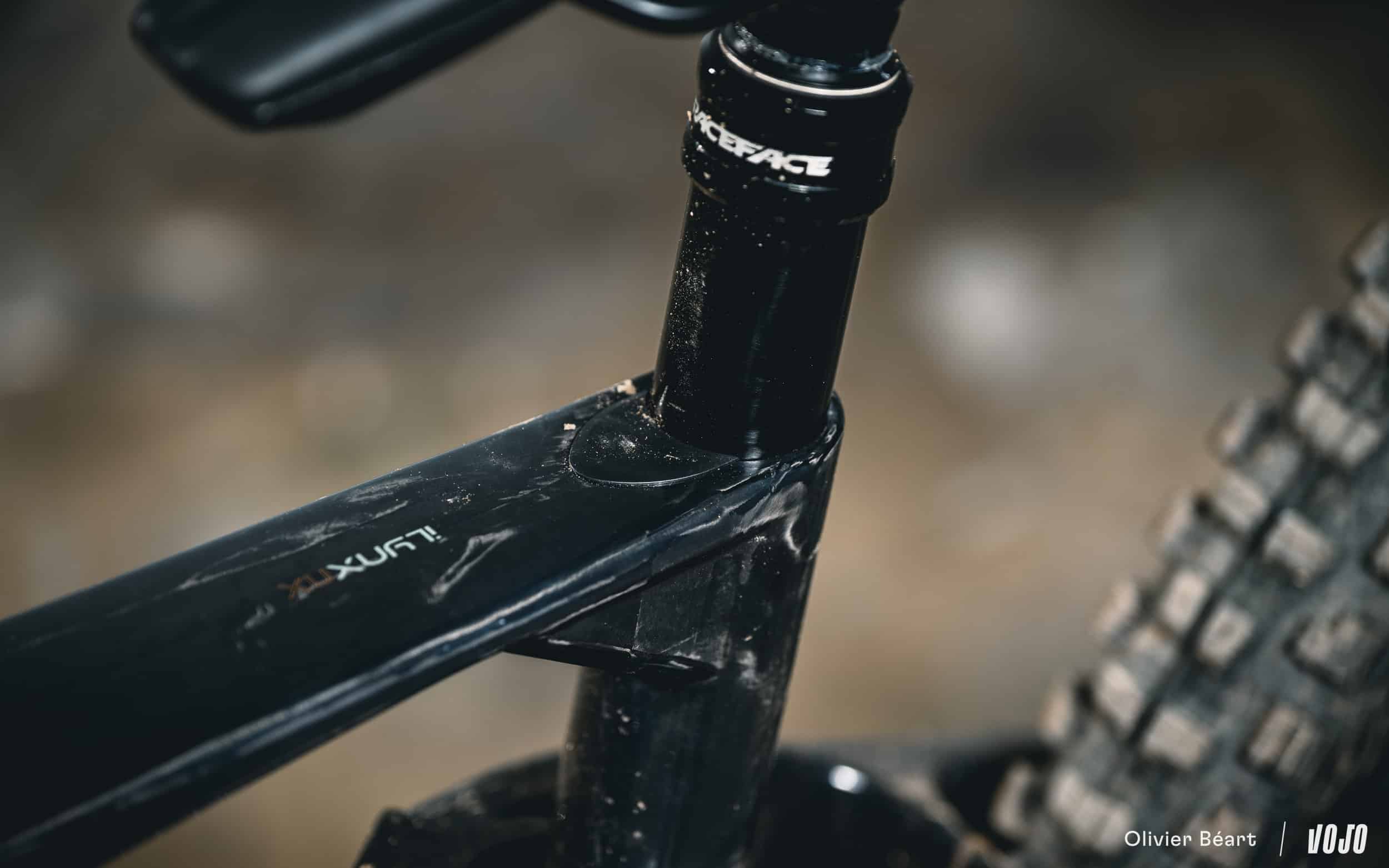 On notera également l’intégration du collier de selle ainsi que la présence d’un système de blocage de direction Acros pour éviter que le cintre vienne endommager le cadre en cas de chute.