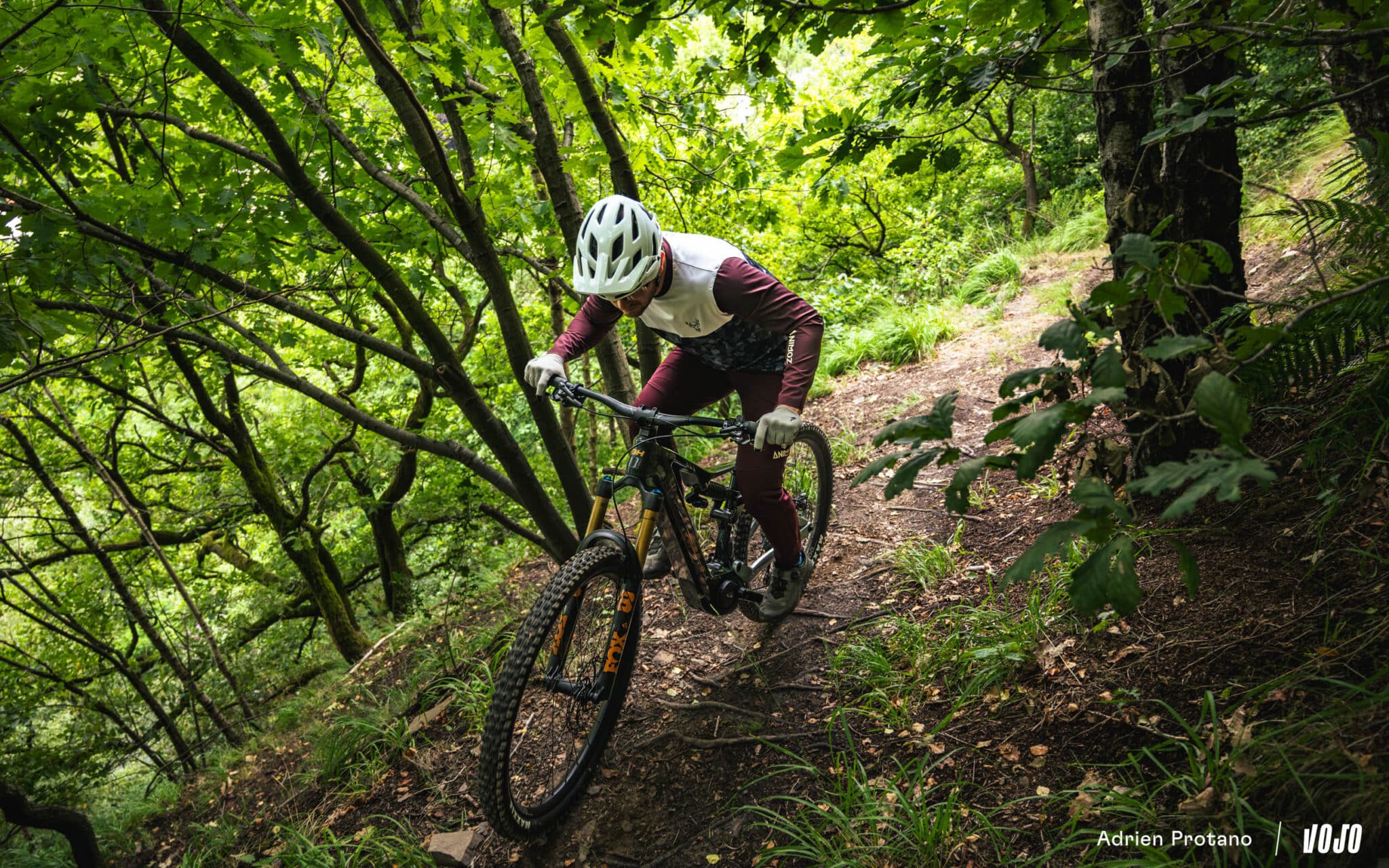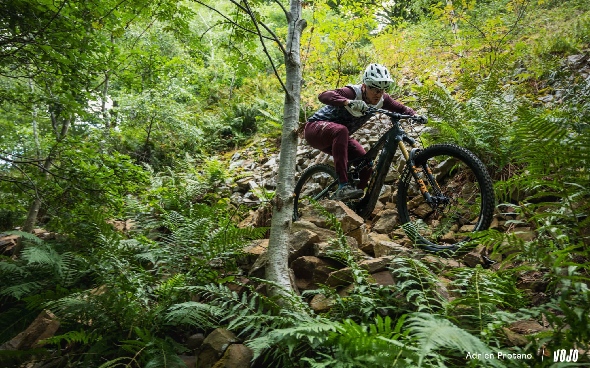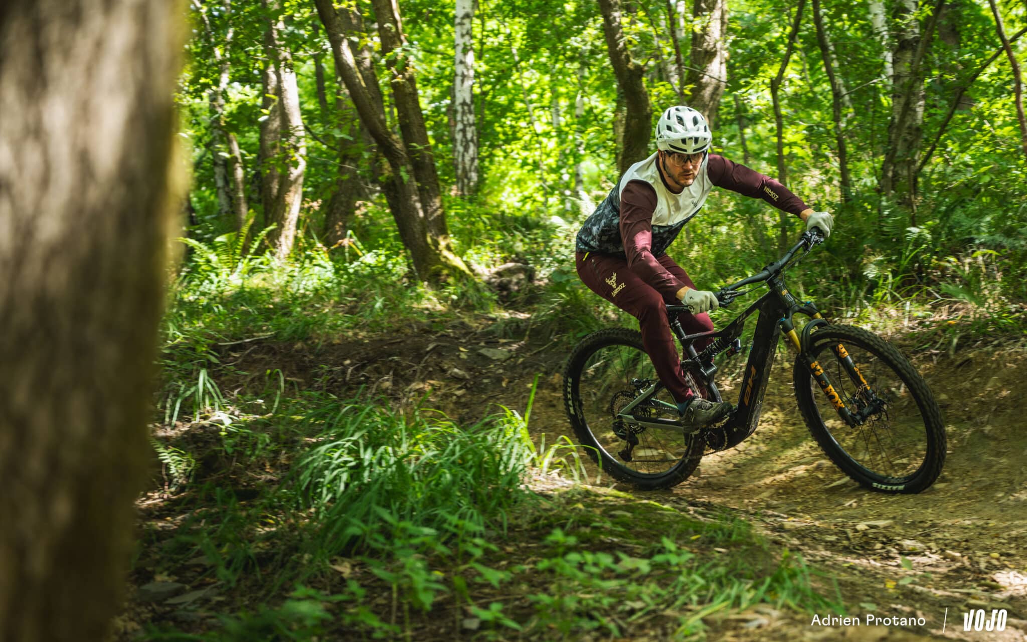 Cela met en lumière que le plus important sur une fourche, ce n’est pas son débattement, ni le diamètre de ses plongeurs, mais bien ce qu’il y a à l’intérieur. Et, ici, elle bride clairement les performances et l’agrément ressenti en descente. C’est dommage car le vélo marche déjà franchement bien tel quel et on a un large sourire quand on enchaîne les spéciales en descente, même si on sent que les bras fatiguent et que le châssis ne peut pas délivrer tout son potentiel. A propos du châssis, il faut souligner que le travail sur la rigidité du cadre est excellent : c’est assez rigide pour être précis et homogène, mais sans aucun excès, et on est sur un carbone conciliant qui filtre bien les vibrations sans verser dans la rigidité excessive.