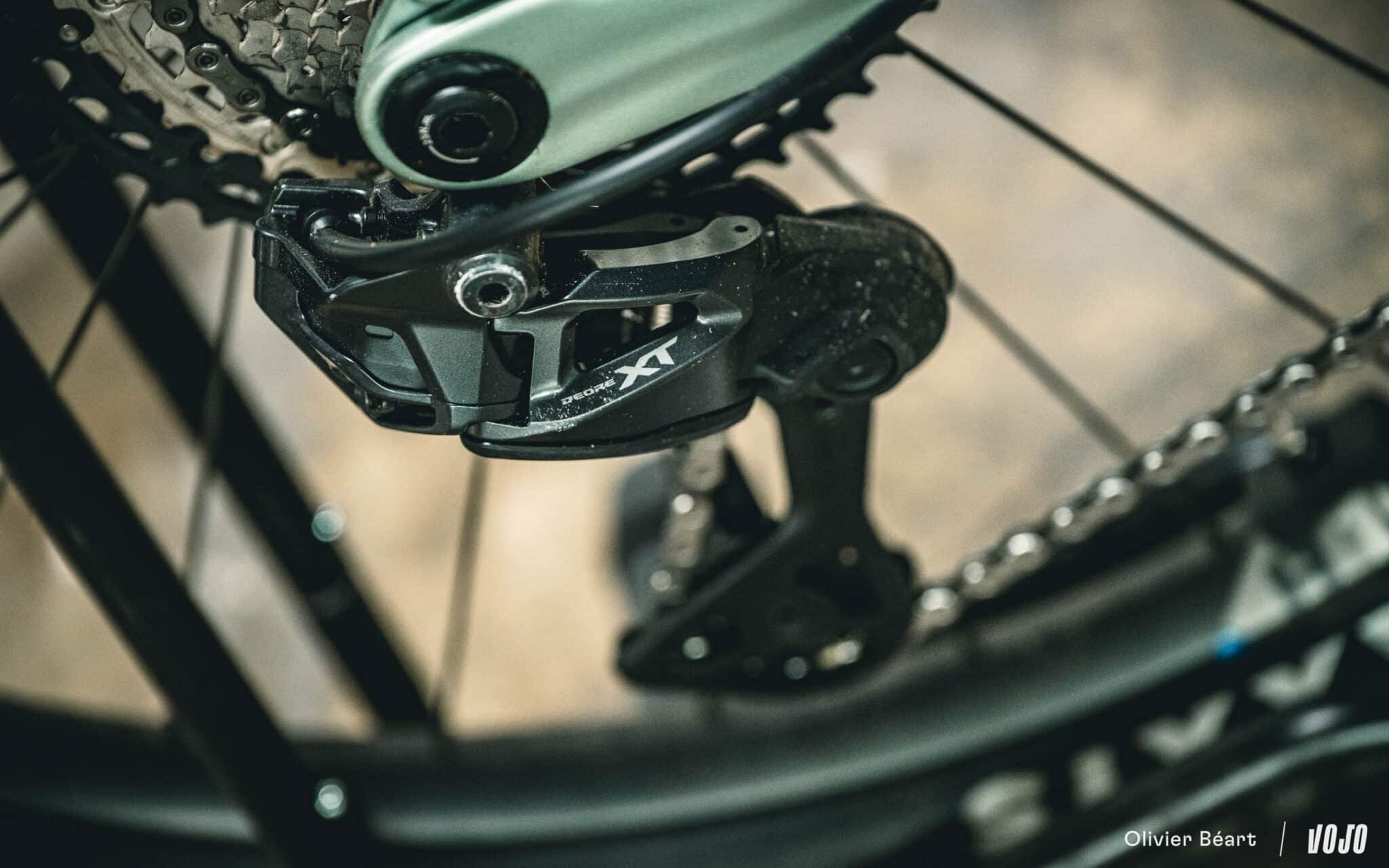 La transmission repose sur un ensemble Shimano XT Di2 12 vitesses (dérailleur, shifter, chaîne, cassette 10-51), associé à un pédalier E-Thirteen Helix Race. Le freinage est également confié à Shimano et ses XT 4 pistons, avec disques de 203 mm.