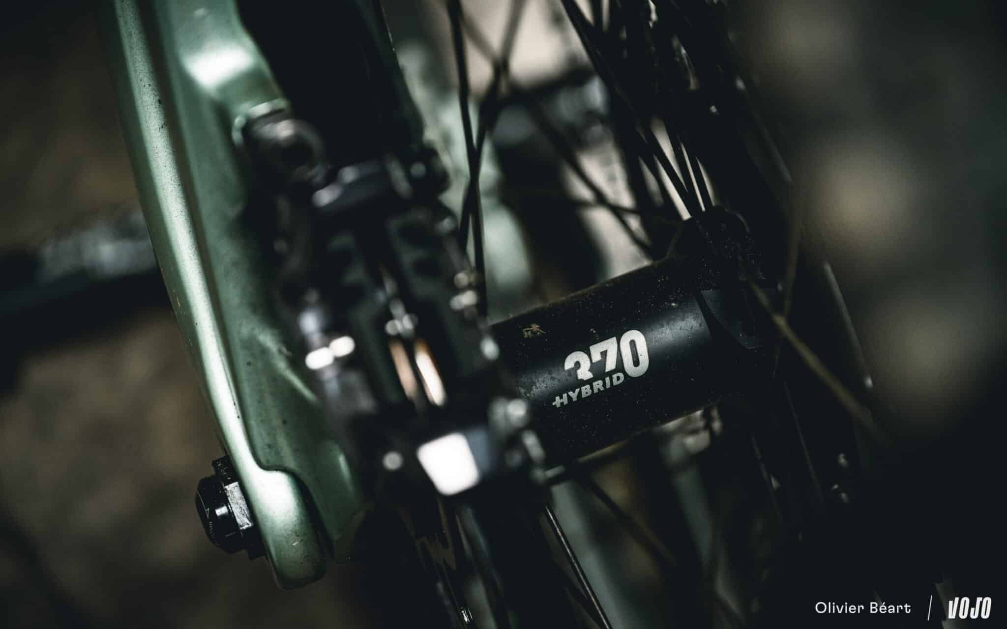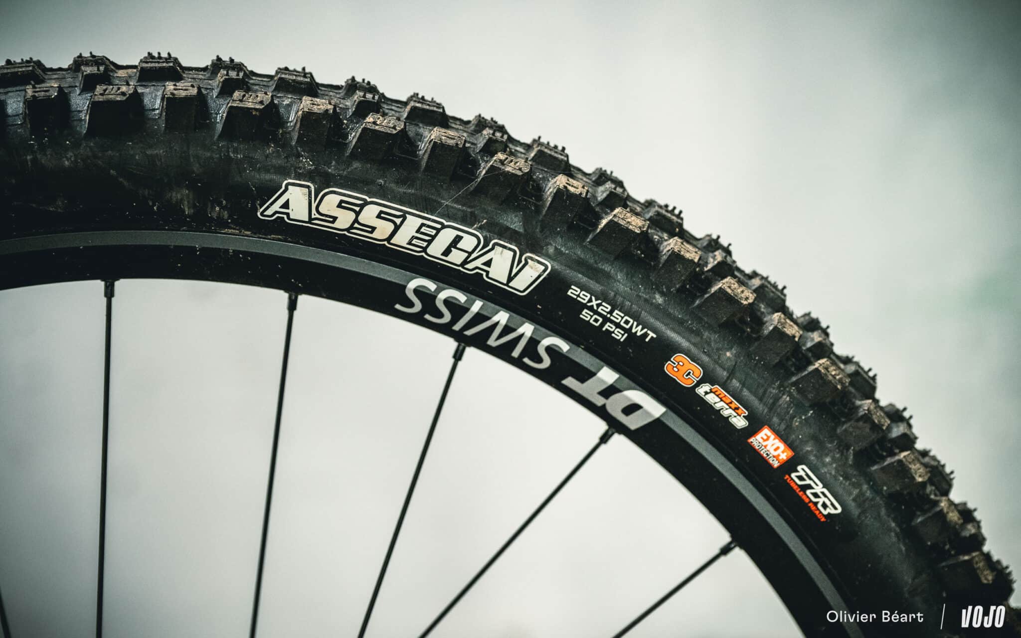 Les roues sont des DT Swiss H1900 TR, chaussées de pneus Maxxis Assegai / Minion DHR II EXO en 2.5/2.4″.