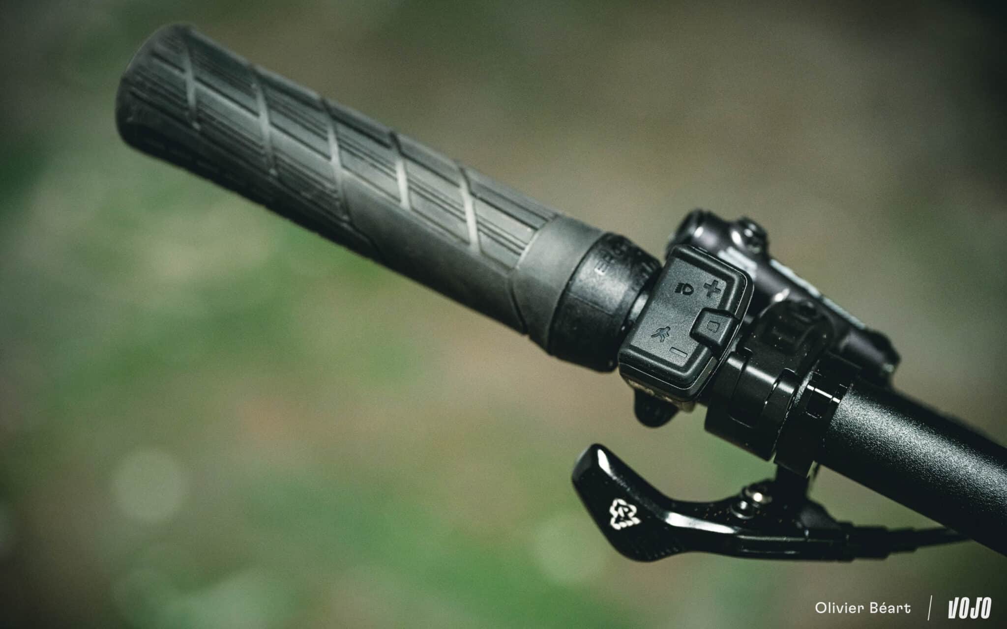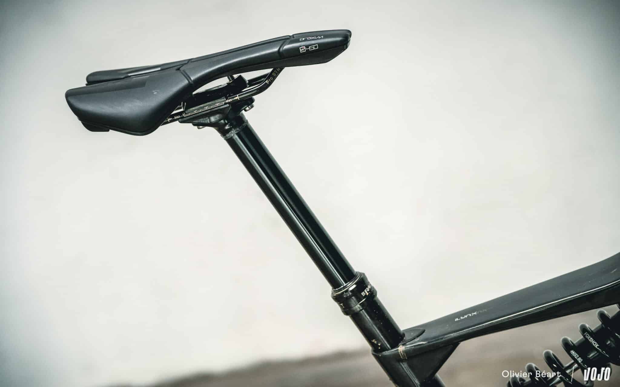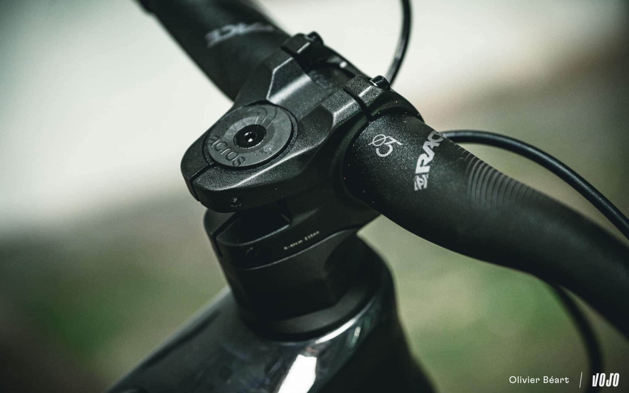 On notera également l’intégration du collier de selle ainsi que la présence d’un système de blocage de direction Acros pour éviter que le cintre vienne endommager le cadre en cas de chute.