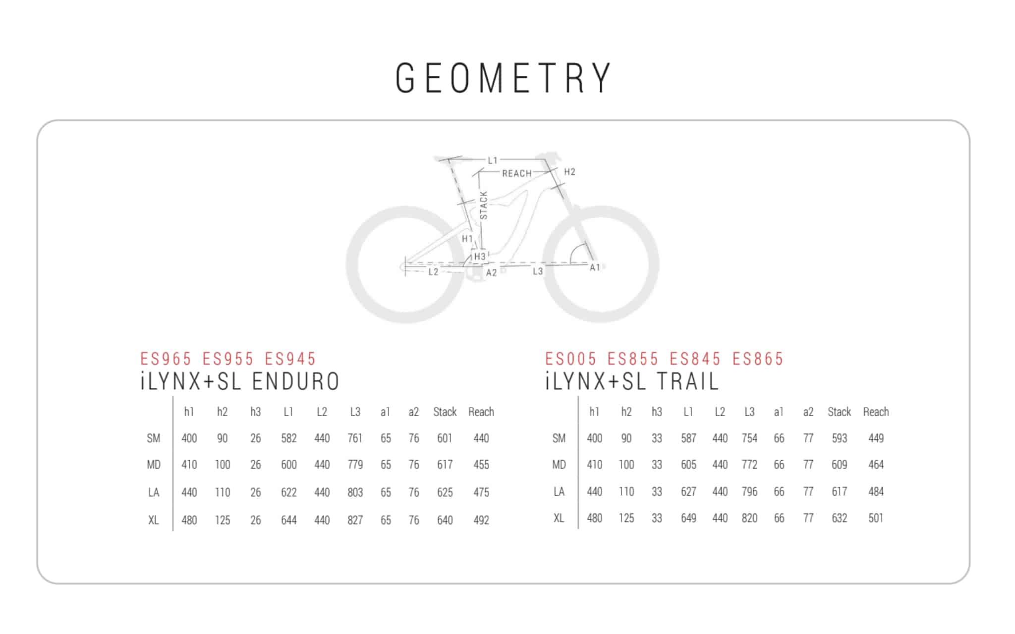 La version « Enduro » du iLynx + SL utilise le même cadre que la version « Trail », mais le passage de suspensions de 140 mm à 160 mm de débattement modifie la géométrie. L’angle de direction et celui du tube de selle se ferment d’un degré (à 65° et 76° respectivement), le reach se réduit de 9 mm (455 mm en taille M et 475 mm en taille L) et la hauteur de pédalier passe à 260 mm.