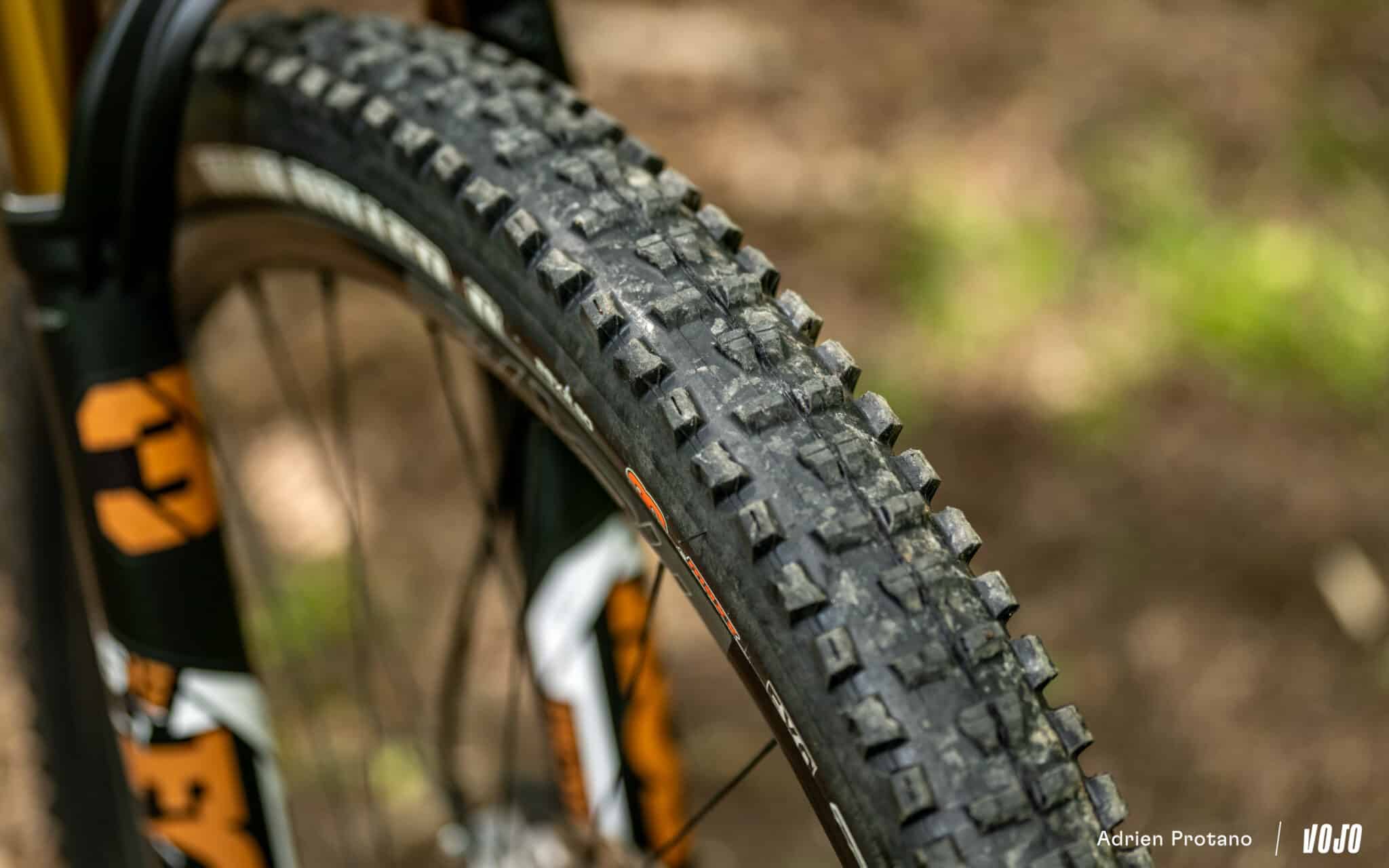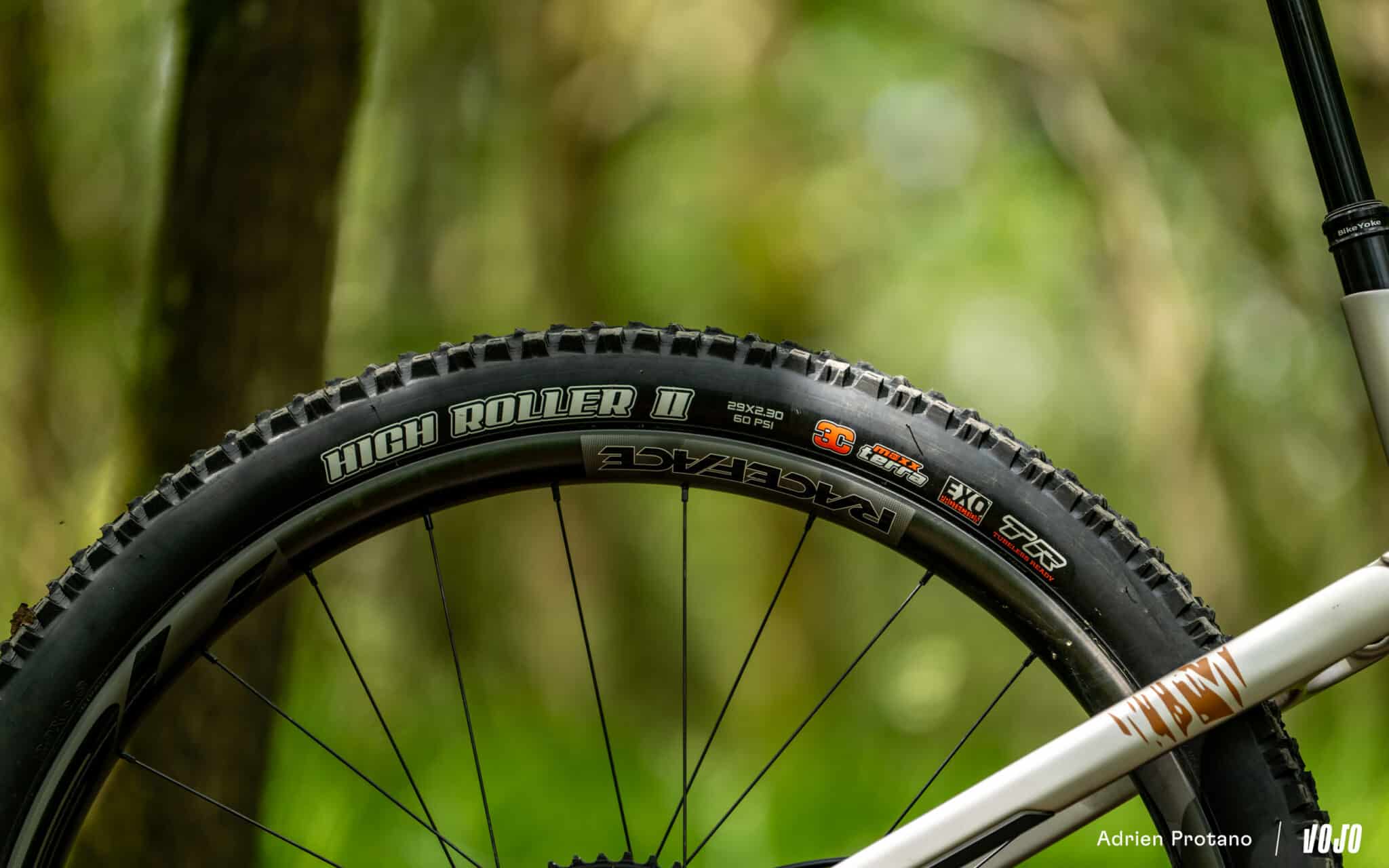 Le train roulant est composé d’une paire de Highroller II en 2.3 et dotés d’une simple carcasse EXO… Au vu du programme du vélo et de la maigre différence de poids entre les deux carcasses, on aurait plutôt opté pour du EXO+ (cf. Maxxis : le guide complet de la gamme de pneus trail / enduro ). Nous n’avons pas eu de crevaison en 200 km de test mais tout de même, l’Exo+ donne plus confiance.
