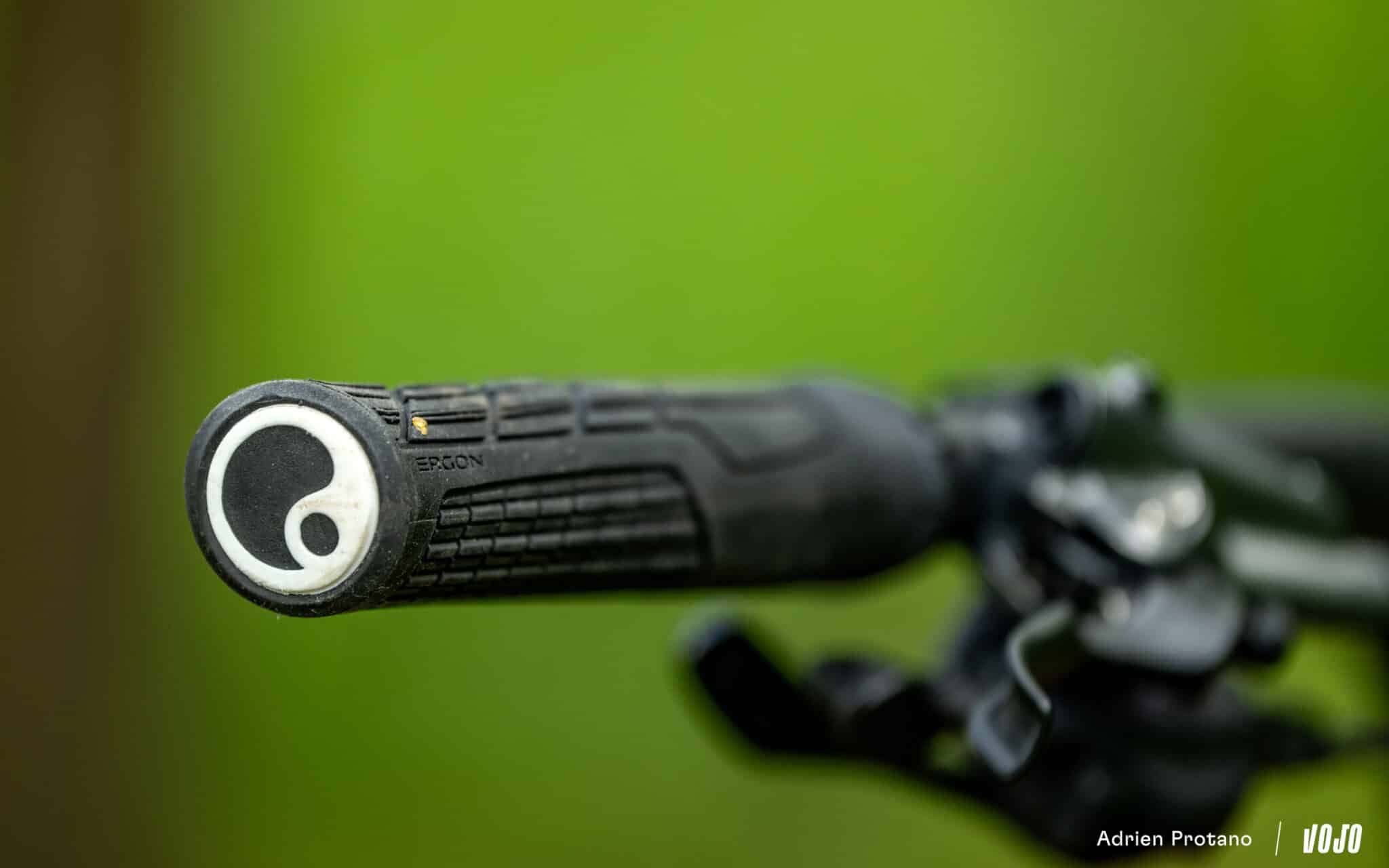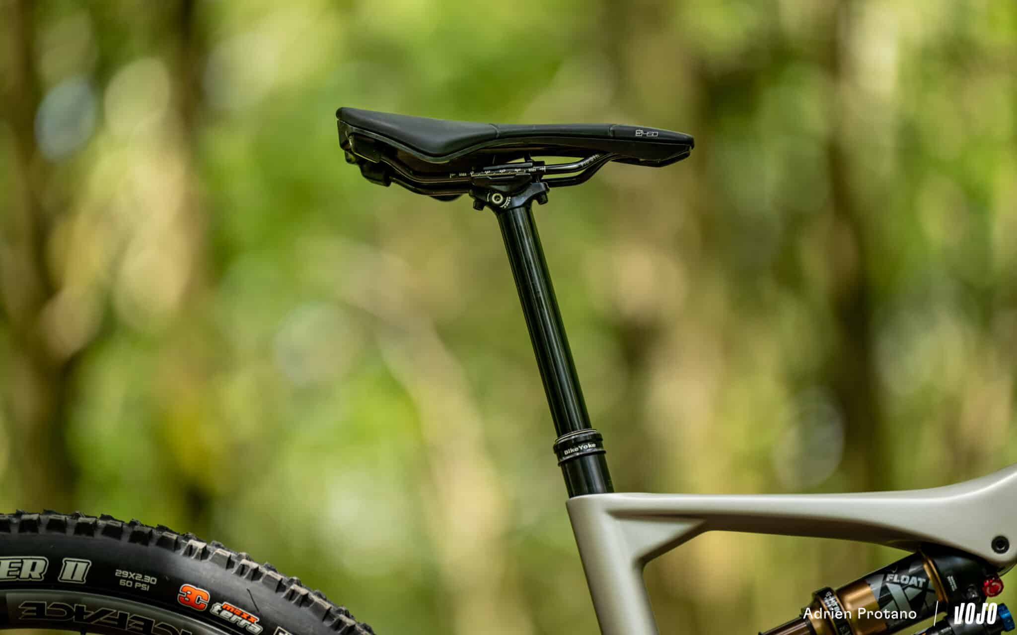 Pour le reste des périphériques, le poste de pilotage est maison avec un joli cintre carbone de 800 mm de large, la selle est une Prologo Proxim et les grips sont des Ergon GE10… Un ensemble cohérent, réfléchi et fonctionnel ! Un dernier mot sur l’excellente tige de selle télescopique BikeYoke, toujours très plaisante à utiliser, mais qui est hélas combinée à la version « haut du cintre » de la commande au guidon, alors qu’on a la place pour utiliser la version à gâchette qui se place sous le cintre et dont le fonctionnement est, pour nous, bien plus naturel. Encore un petit détail, pas vraiment grave en soi, mais qui chagrine dans les choix opérés par BH.