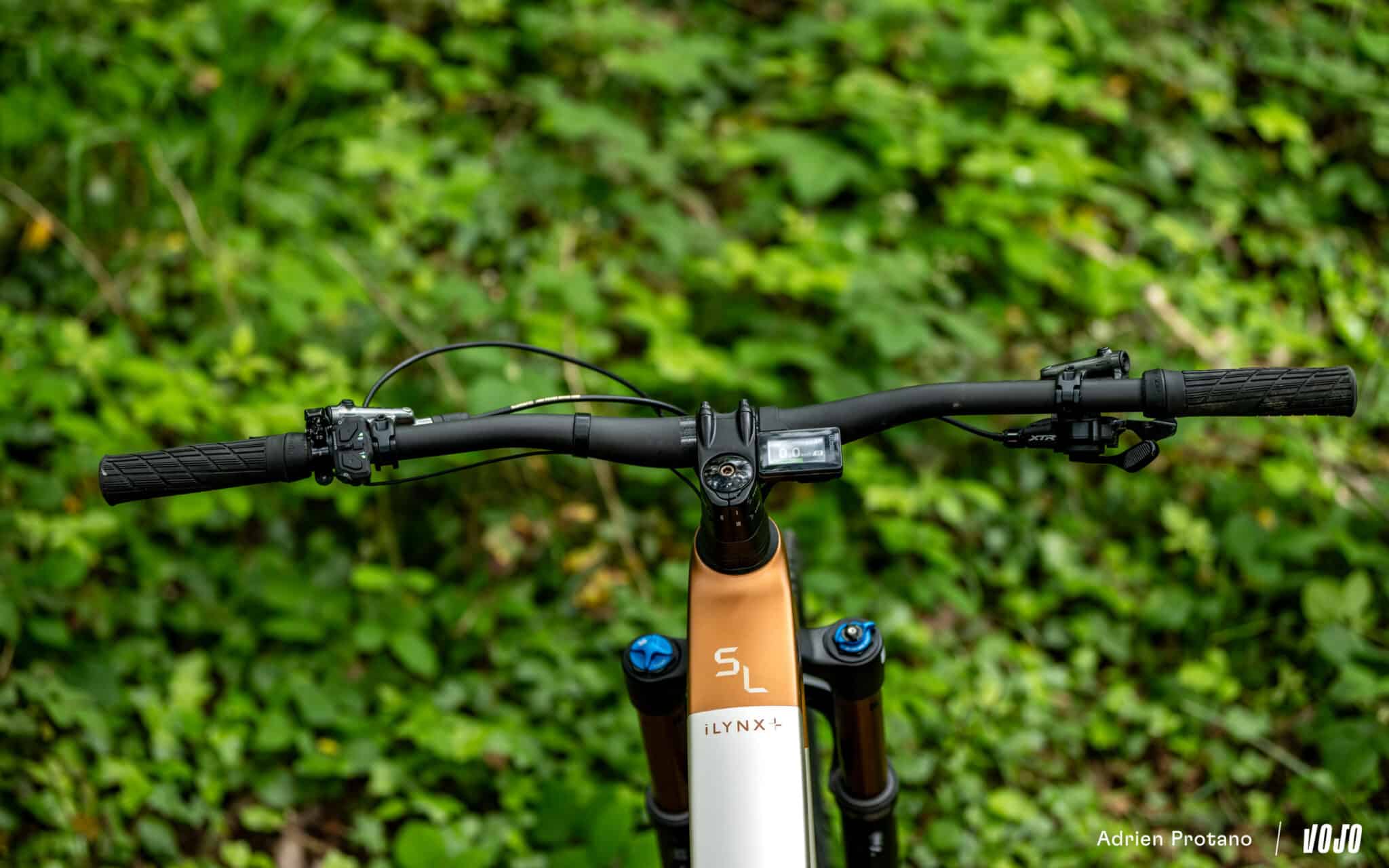 Comme pour les derniers modèles en date de la marque, l’intégration fait son bout de chemin sur le iLynx + SL. C’est notamment le cas au niveau du poste de pilotage, avec l’acheminement des gaines de câbles sur le côté du jeu de direction, avant d’être guidées au sein du cadre. Le jeu de direction est équipé du système BlockLock, une butée de direction conçue pour limiter l’angle de rotation du poste de pilotage et éviter d’endommager le cadre en cas de retour brusque du cintre suite à une chute. Une bonne idée, mais on peut toutefois regretter que l’angle de braquage soit tout de même un peu trop limité à notre goût.