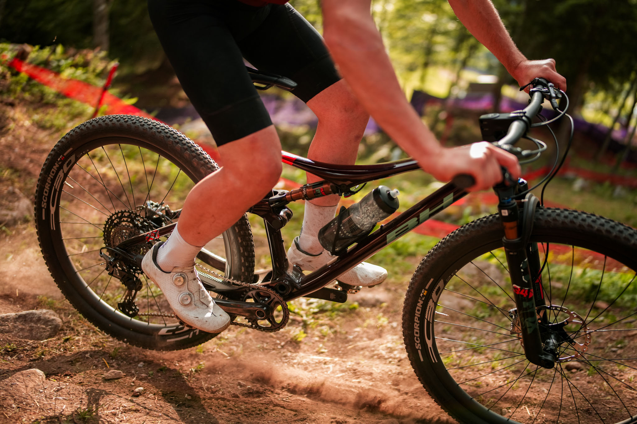 Au train, le Lynx Race se fait oublier. Peu importe l’allure, il répond présent et ne donne jamais l’impression d’être en retrait ou, à l’inverse, sur la retenue en attendant plus de watts. Si quelques passages se prêtent à passer les suspensions en position intermédiaire, notamment l’après-midi sur le parcours ultra-nerveux de la coupe du monde, on les laisse le plus souvent entièrement libres pour profiter du surcroît de confort et de grip. Les mouvements parasites sont suffisamment bien contrôlés pour qu’on ait l’impression de ne pas perdre trop d’énergie et, en position intermédiaire, l’affermissement fait perdre sensiblement en adhérence et capacité à avaler les obstacles. Ce n’est pas comme un Scott Spark RC par exemple, où cette position devient vite celle « par défaut » et où n’ouvre les suspensions que pour les descentes.