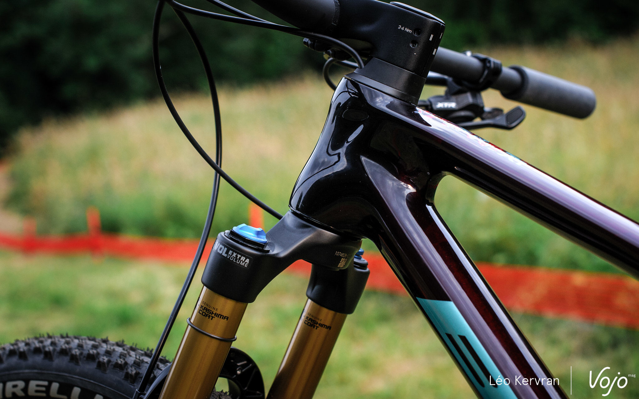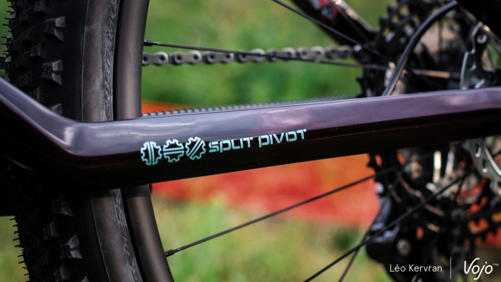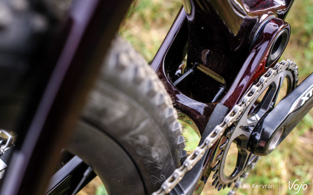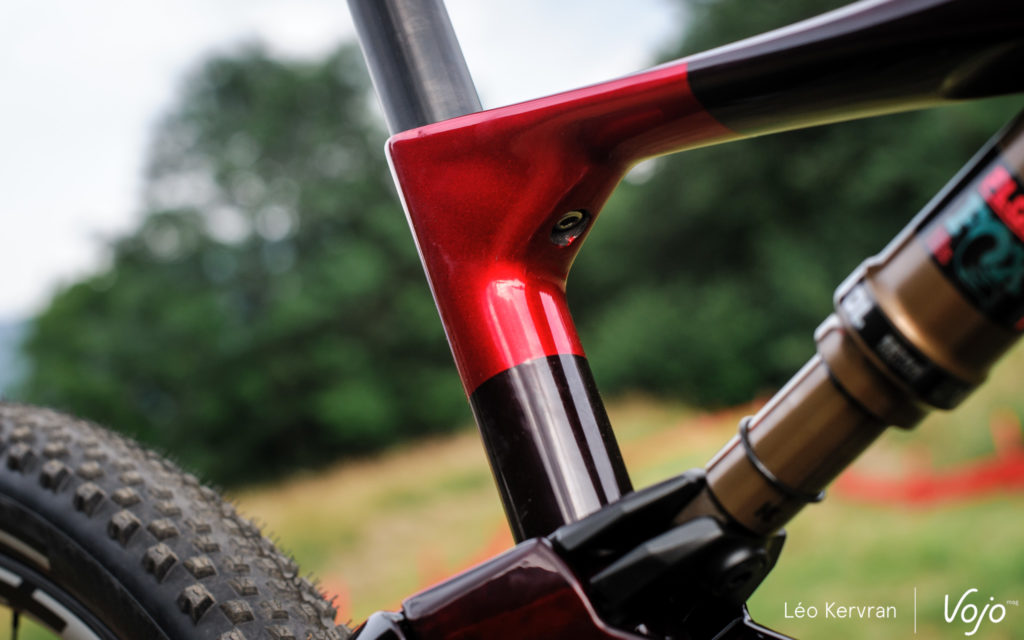 C’est la seule nouveauté majeure puisque le cadre conserve son jeu de direction Acros BlockLock avec butées et entrées de gaines intégrées, ainsi que le dégagement pour des pneus de 2,4″ de section. Comme souvent sur les vélos de XC, les gaines ne sont pas guidées dans le cadre mais simplement protégées par des fourreaux en mousse. Enfin, la sortie de la Durit de frein arrière sur la base a été légèrement décalée afin d’améliorer son trajet.