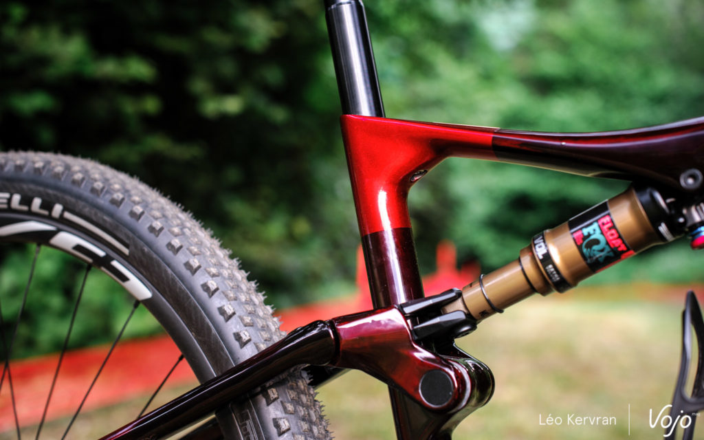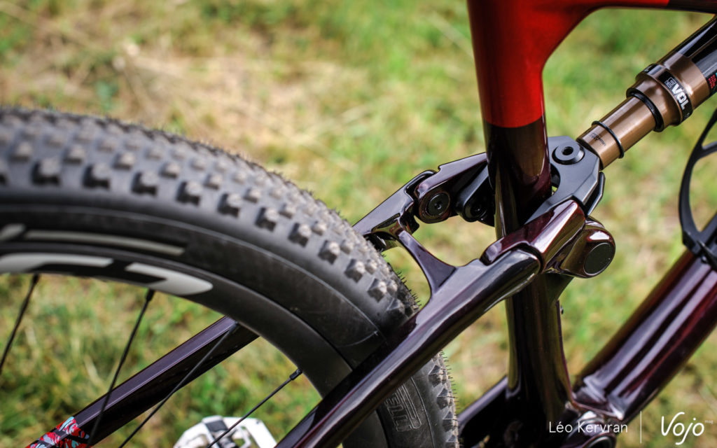 Celle-ci reste fidèle à l’architecture Split Pivot (on vous l’explique dans notre lexique), en grande partie responsable du caractère et de la réputation du Lynx Race dans le technique mais indubitablement plus lourde que le monopivot + biellette plébiscité par beaucoup de marques en XC. Comme sur l’ancien modèle, elle peut développer 100 ou 120 mm de débattement suivant l’amortisseur utilisé… mais cette fois, elle a été pensée avant tout pour du 120 mm, alors que c’était l’inverse auparavant. Ainsi, les équipes sponsorisées par la marque (BH Coloma, BH-Wallonie) roulent désormais sur la version 120 mm alors que ce n’était pas toujours le cas jusque-là.