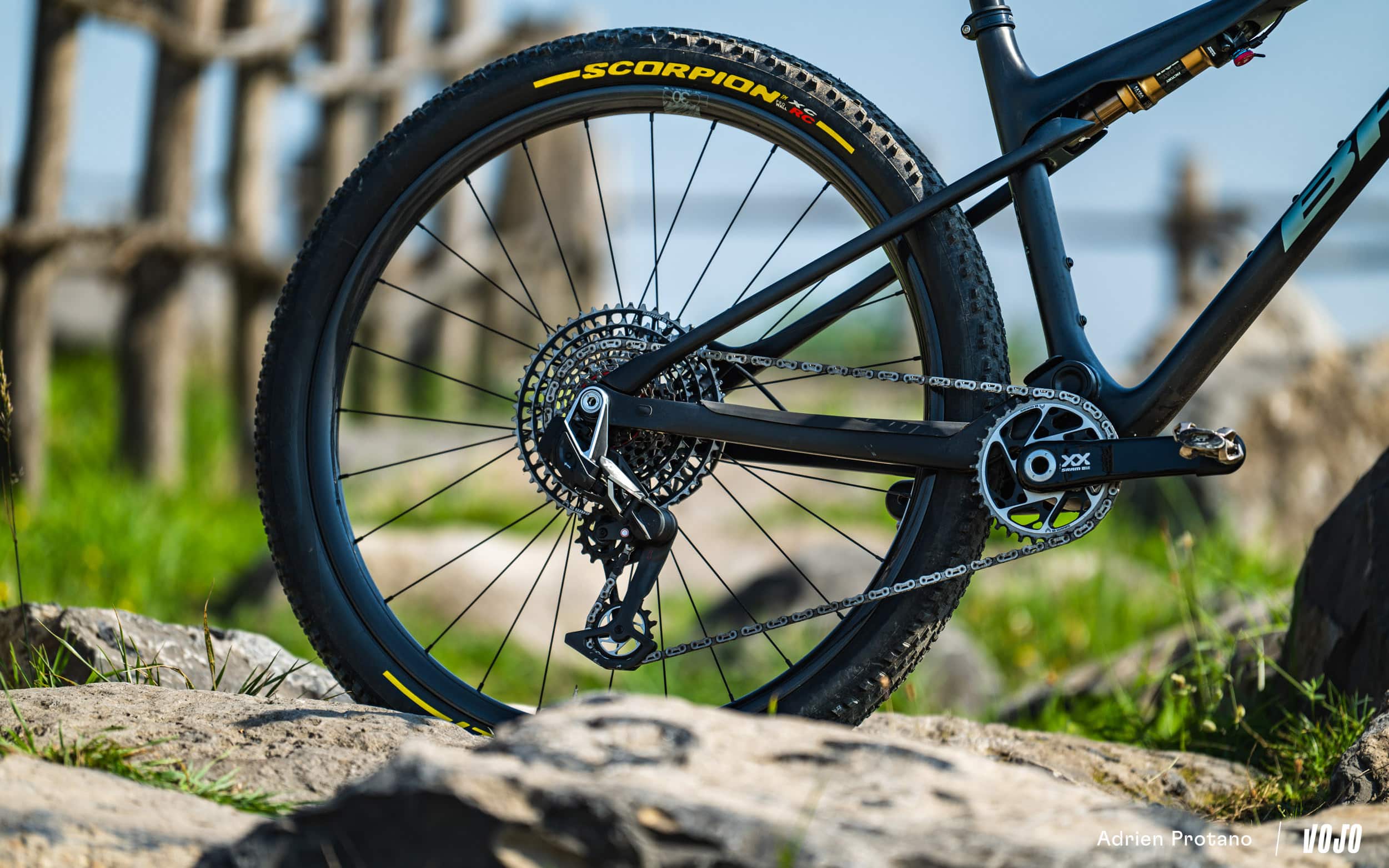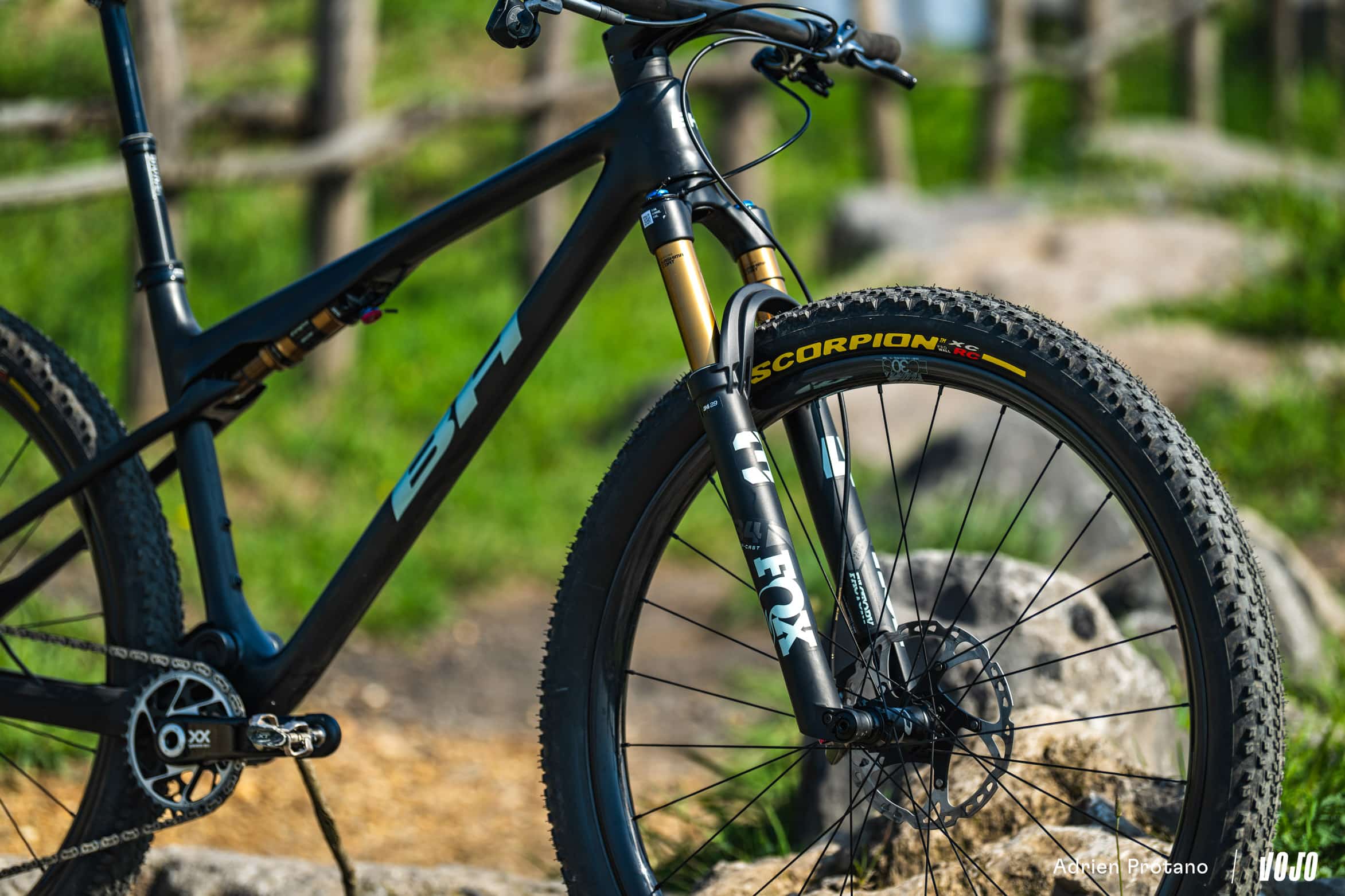 Le train roulant est maison avec une paire de roues estampillées BH, et plus précisément le modèle EVO carbon SL (28mm de hauteur, 30mm de largeur interne). Celle-ci sont chaussées de pneumatiques Pirelli Scorpion XC RC en 2.4 de section.