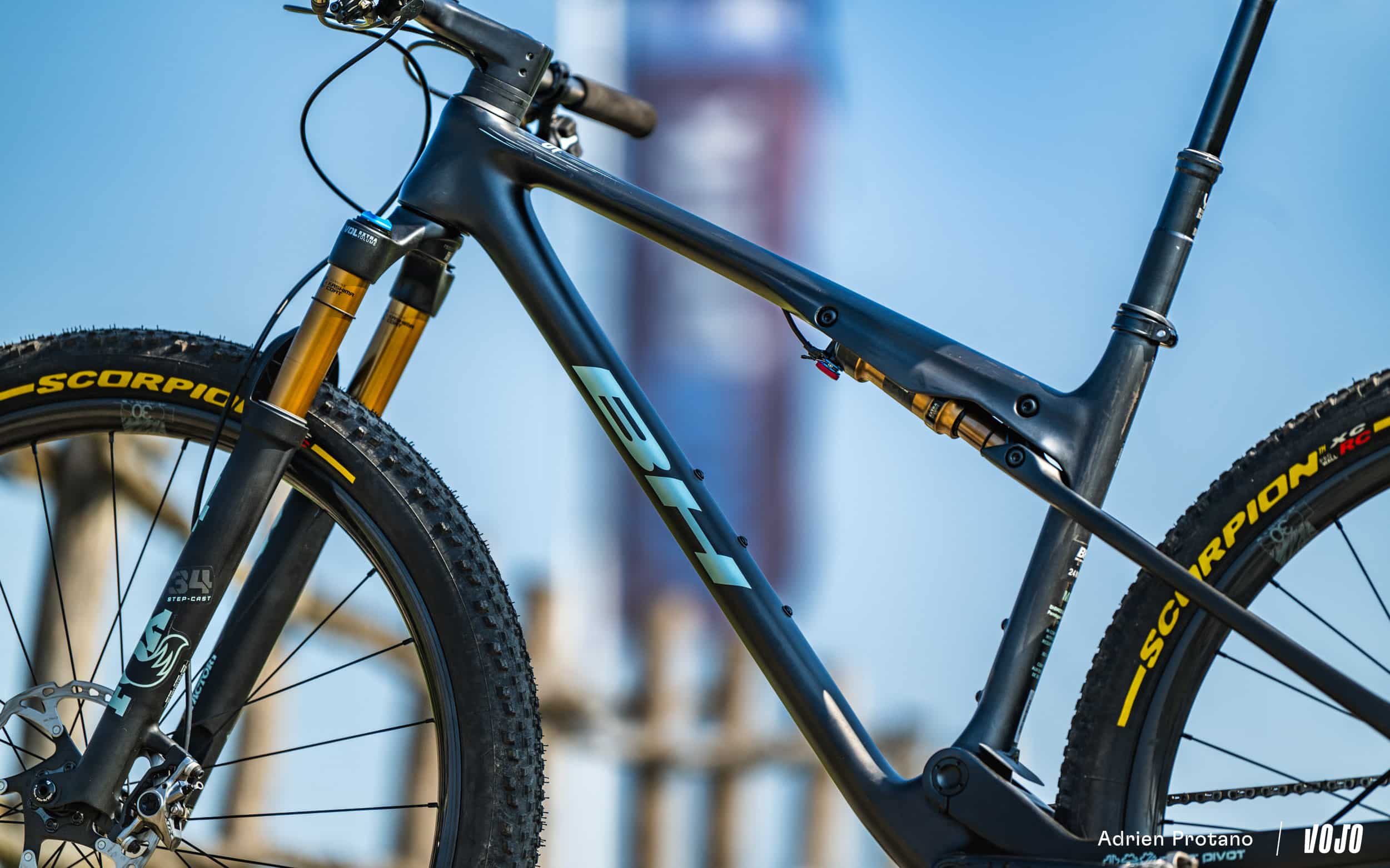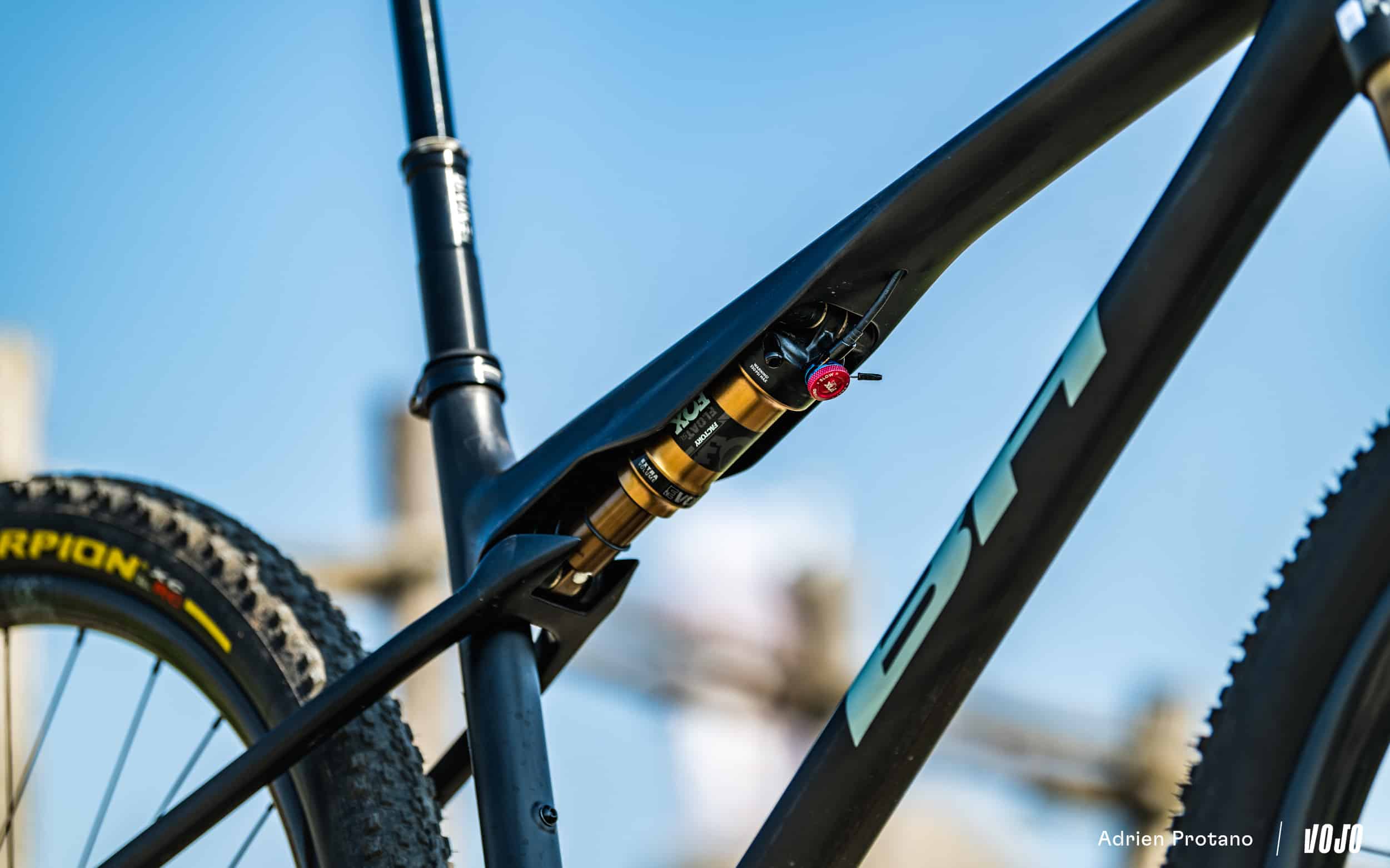 Au moment d’apercevoir ce prototype en mars dernier, nous nous étions questionnés sur la voie qu’allait suivre BH quant à cet amortisseur, à l’époque caché sous une chaussette en néoprène… Eh bien la marque espagnole a suivi sa propre voie, tout en restant dans un certain classicisme ! Elle n’a ni opté pour la philosophie du Trek Supercaliber et de sa conception inédite du tube supérieur (et du rôle structurel de son amortisseur), ni pour celle de Specialized avec une forme plus classique (mais une tentative de « réinventer » le fonctionnement de l’amortisseur qui est propre à ce modèle).