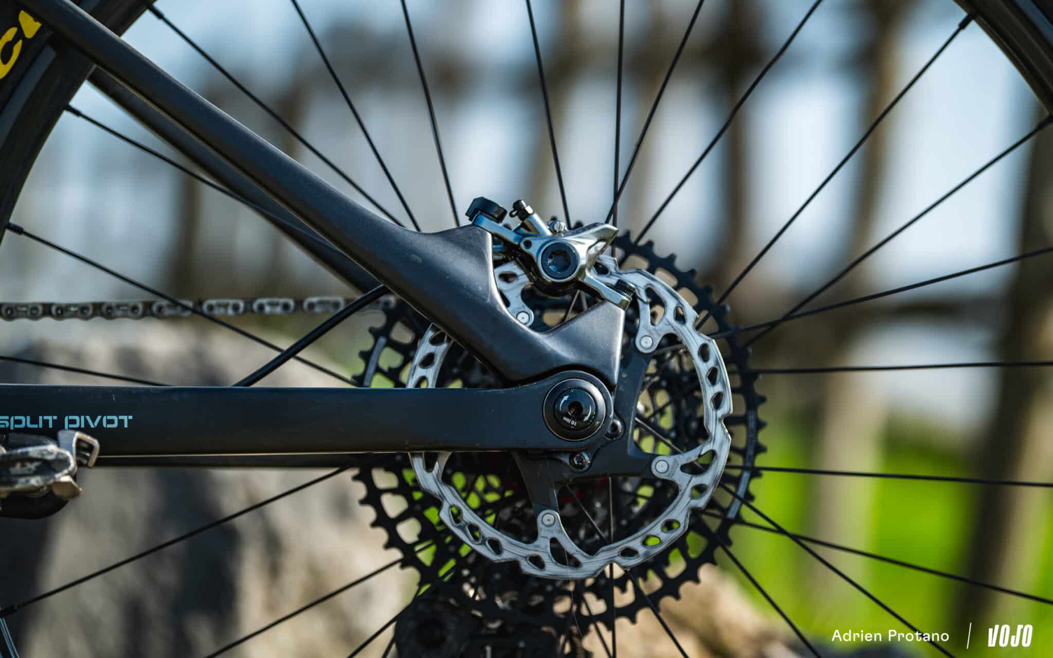 C’est la question qui était sur toutes les lèvres des gens que l’on a croisés au guidon de ce Lynx SLS : « Combien de débattement a-t-il à l’arrière ? » BH a opté pour un débattement arrière de 80 mm, associé au système Split Pivot (notez le point de pivot entre les bases et les haubans, concentrique à l’axe de roue arrière), comme tous les BH tout-suspendus, et non en monopivot + biellette.