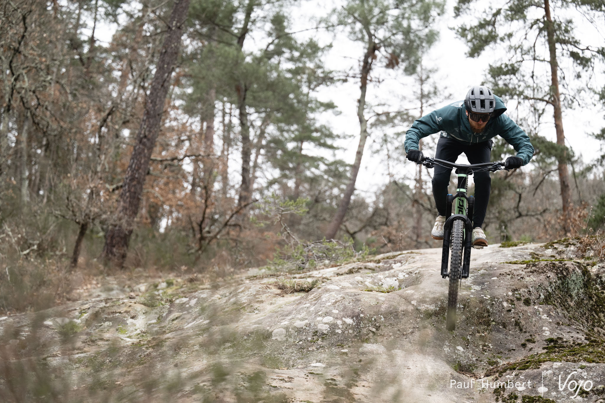 La mise en mouvement demande un peu d’énergie mais une fois qu’on est parti il n’y a plus qu’à dérouler et la machine surprend par la facilité avec laquelle elle s’emmène, on peut honnêtement envisager de longues journées à la pédale sans avoir peur de finir sur les rotules. Seule la roue avant demande parfois un peu de concentration, dans les passages raides ou dans les virages sur le plat notamment. L’association d’un stack dans la moyenne haute du segment, d’un angle de direction de 63,2° et peut-être d’une entretoise de trop sous notre potence à tendance à la rendre (très) légère dans ces situations et ça peut déconcerter au début, mais on s’y fait assez vite.