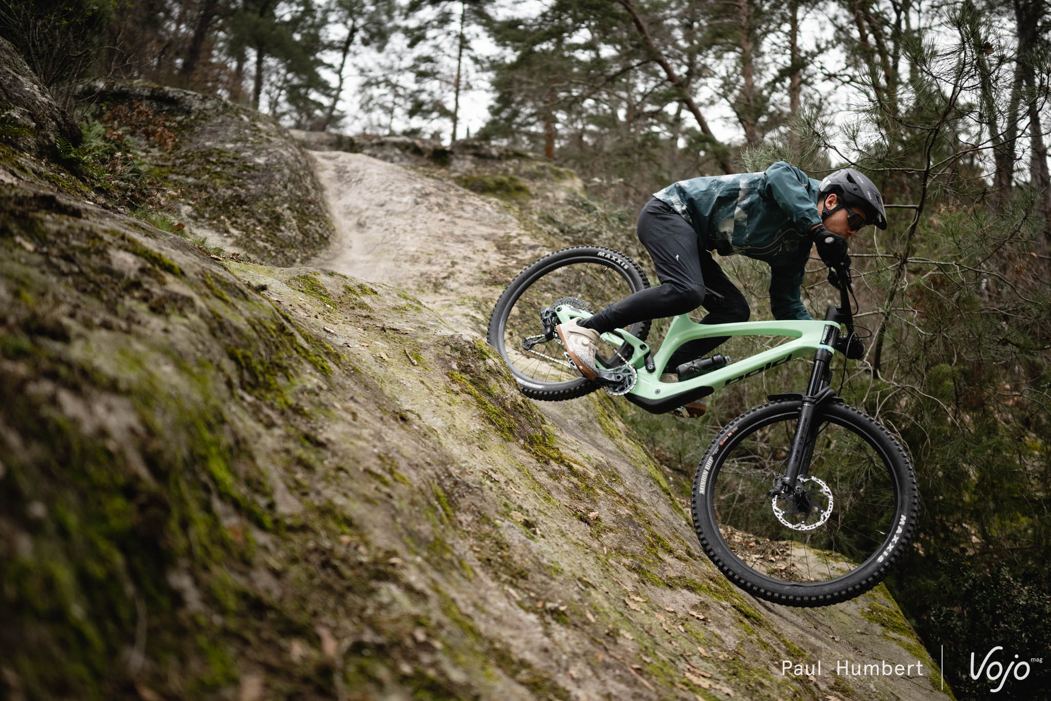 Pour finir, notez qu’avec cet angle de direction de 63,2° combiné à un stack dans la moyenne haute du segment, l’Unplugged est plus à l’aise lorsqu’il y a un minimum de pente. Lorsque le terrain est trop plat il peut être difficile de charger suffisamment la roue avant et le vélo tend alors au sous-virage… mais qui choisit un vélo en 160/170 mm pour rouler sur du faux plat ? Retourner les coupelles du jeu de direction pour passer à 64,5° d’angle permet probablement de corriger un peu cela mais nous n’avons pas encore pu essayer cette configuration.