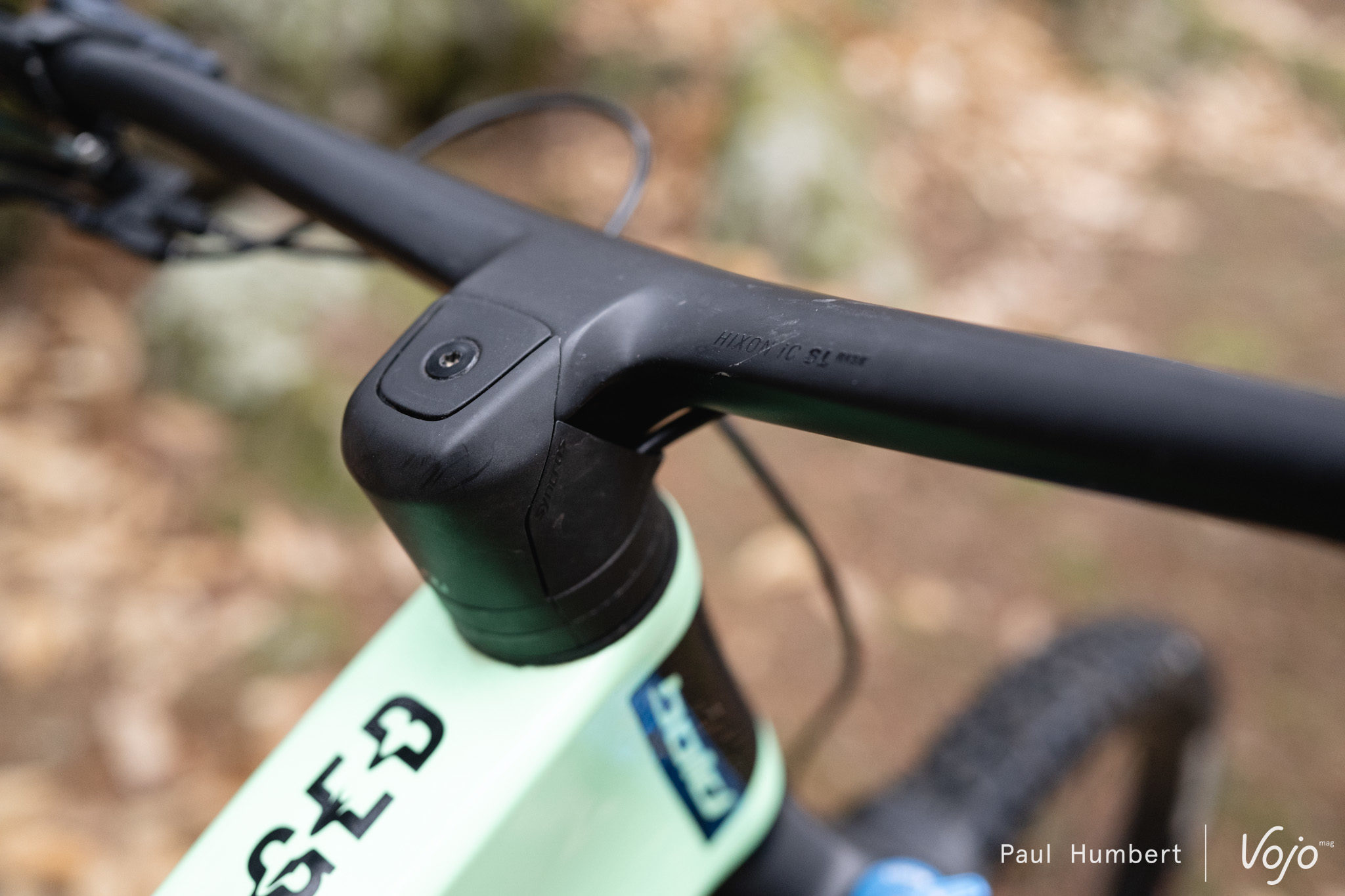Au passage, si vous souhaitez baisser la potence on vous souhaite bon courage : comme avec tout Scott ou Bold récent, l’Unplugged utilise des entretoises spécifiques sous la potence qui ne peuvent pas aller au-dessus. Dans l’esprit de ses concepteurs, le système est simple : si on descend la potence, on coupe le pivot. Alors oui, rien ne dépasse et certains trouveront ça joli mais quand on veut faire des essais pour trouver la bonne hauteur il faut se procurer des entretoises classiques pour aller au-dessus de la potence, retirer un cache en plastique et idéalement changer le capot de potence. Pratique.