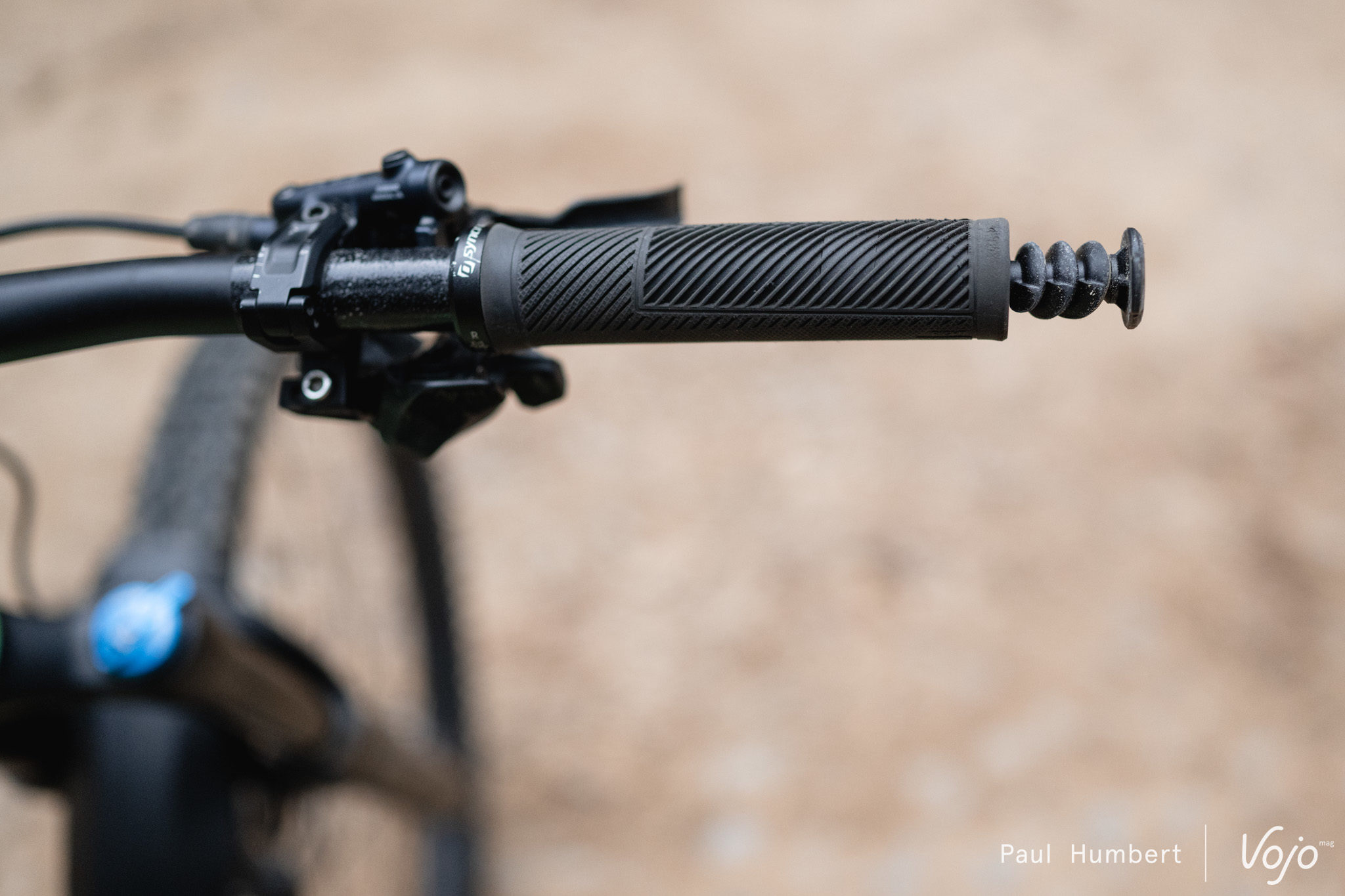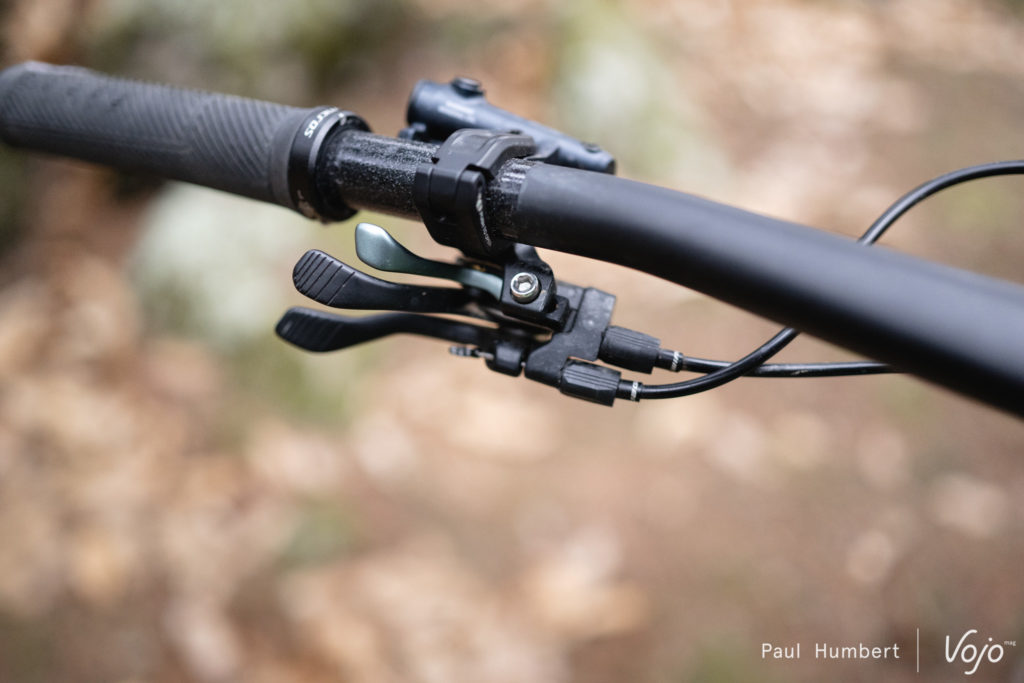 Enfin, on peut bien sûr le commander au guidon avec la commande TracLoc qui permet d’alterner entre trois positions : Descent (position par défaut), Ramp Control (volume d’air réduit mais compressions ouvertes) et Climb (volume d’air réduit et compressions fermées). Au-delà d’affermir la suspension arrière pour rendre la machine un peu plus réactive, le TracLoc a aussi une légère influence sur la géométrie puisque le vélo s’enfonce moins dans son débattement en mode Ramp Control qu’en Descent. Cela peut être intéressant en montée sur sentier, où l’on souhaite garder un peu de suspension pour le grip et le confort mais avoir aussi un tube de selle le plus droit possible pour gérer l’équilibre et la direction facilement.