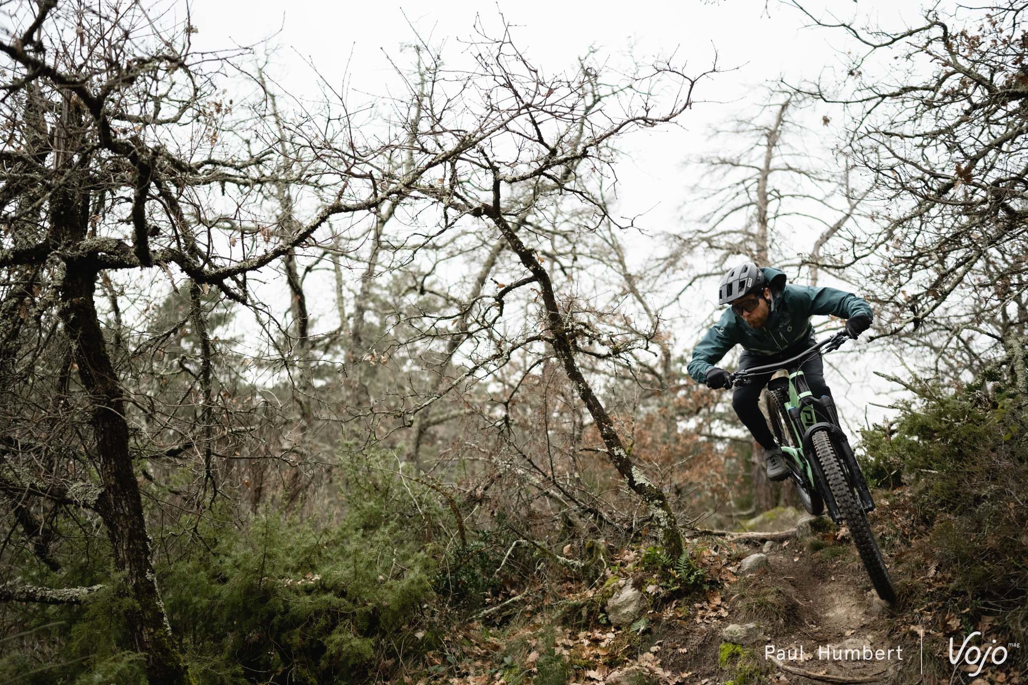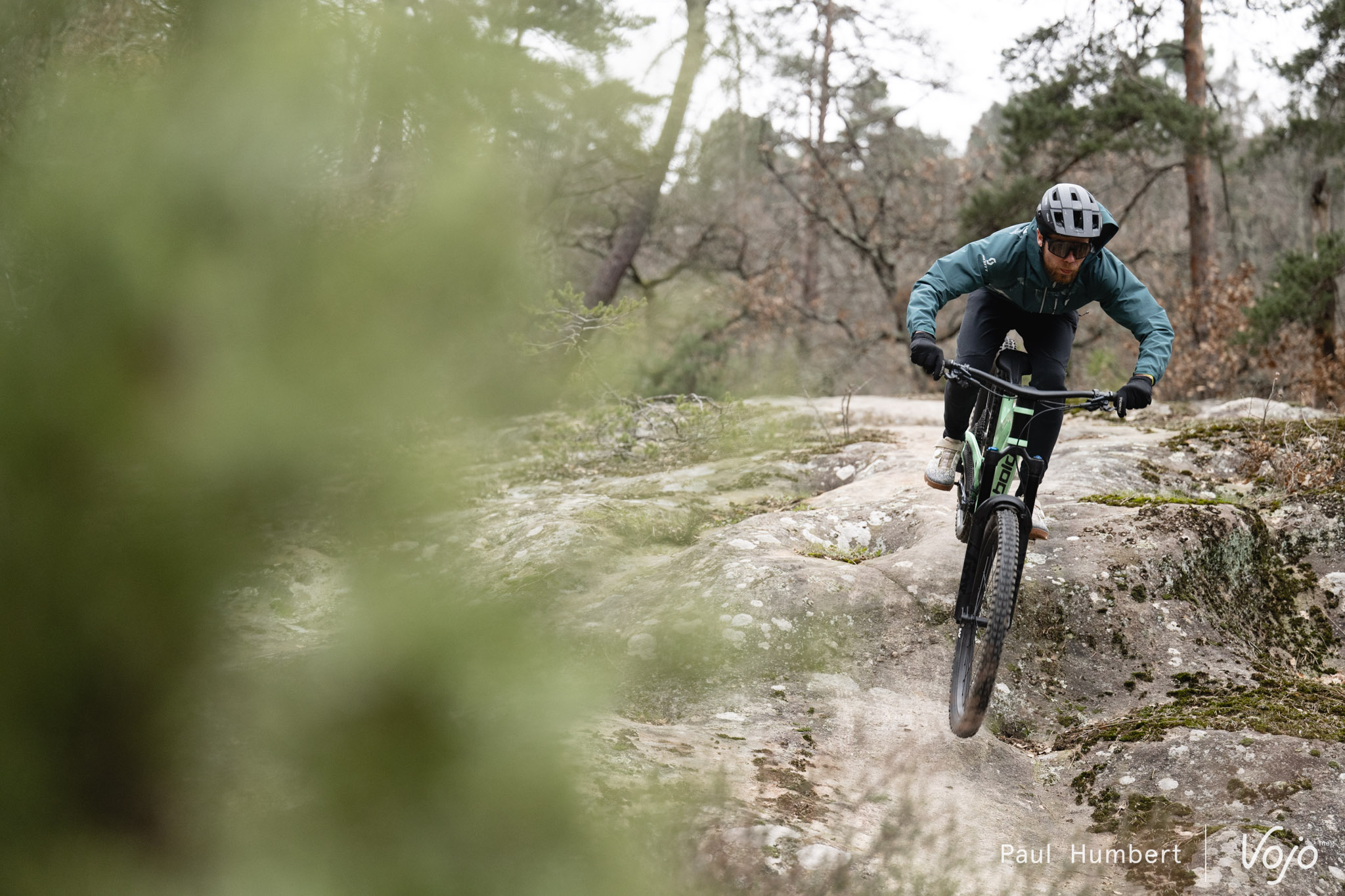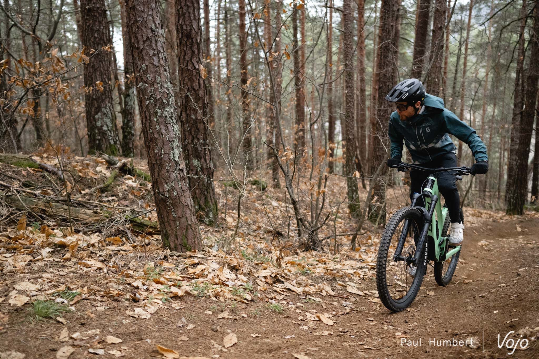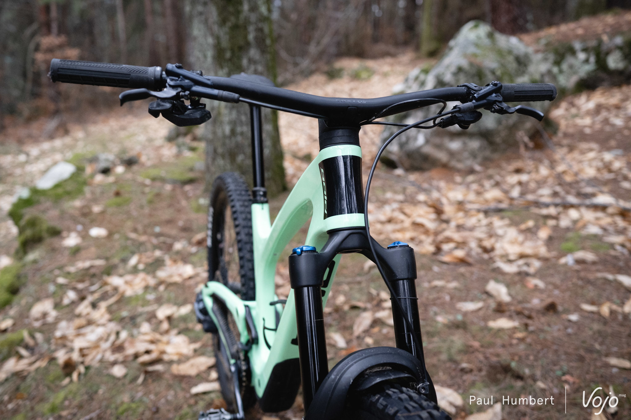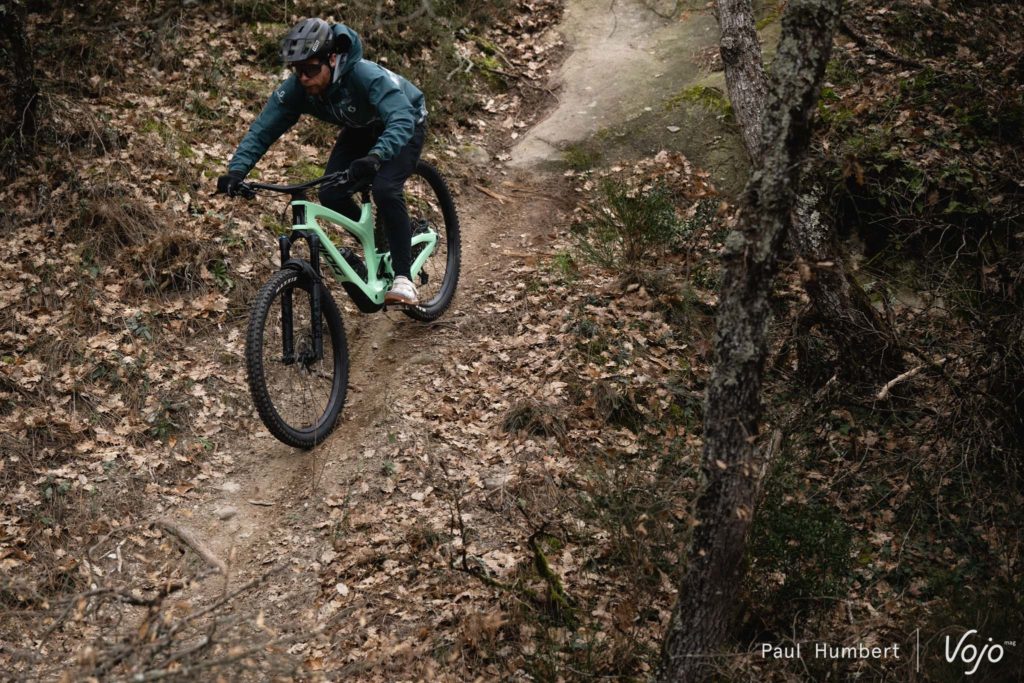 La mise en mouvement demande un peu d’énergie mais une fois qu’on est parti il n’y a plus qu’à dérouler et la machine surprend par la facilité avec laquelle elle s’emmène, on peut honnêtement envisager de longues journées à la pédale sans avoir peur de finir sur les rotules. Seule la roue avant demande parfois un peu de concentration, dans les passages raides ou dans les virages sur le plat notamment. L’association d’un stack dans la moyenne haute du segment, d’un angle de direction de 63,2° et peut-être d’une entretoise de trop sous notre potence à tendance à la rendre (très) légère dans ces situations et ça peut déconcerter au début, mais on s’y fait assez vite.