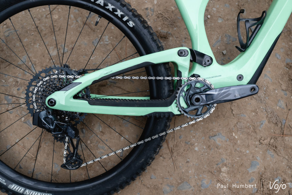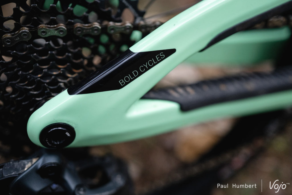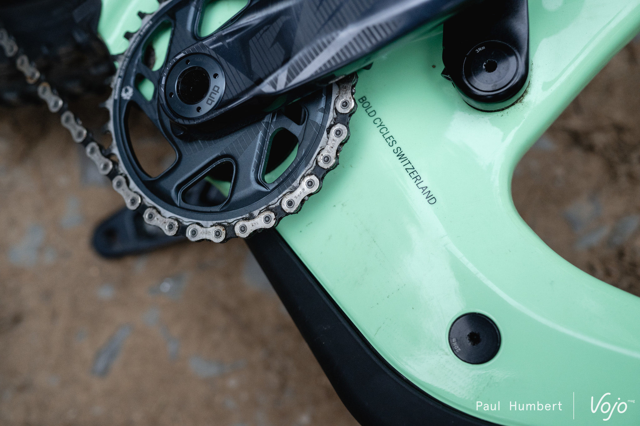 Le cadre n’est disponible qu’en carbone, version HMX s’il vous plaît (le carbone haut de gamme du groupe Scott dont Bold fait partie depuis 2019), mais surtout, il n’y a aucun passage pour un câble de dérailleur, qu’il soit classique ou électrique. En d’autres termes le cadre n’est compatible qu’avec les groupes Sram AXS, seules transmissions sans fil aujourd’hui sur le marché. Une position extrême, très rare dans le monde du vélo et encore plus en VTT. Quand on vous dit que Bold n’a pas peur de s’asseoir sur les conventions pour suivre ses idées…