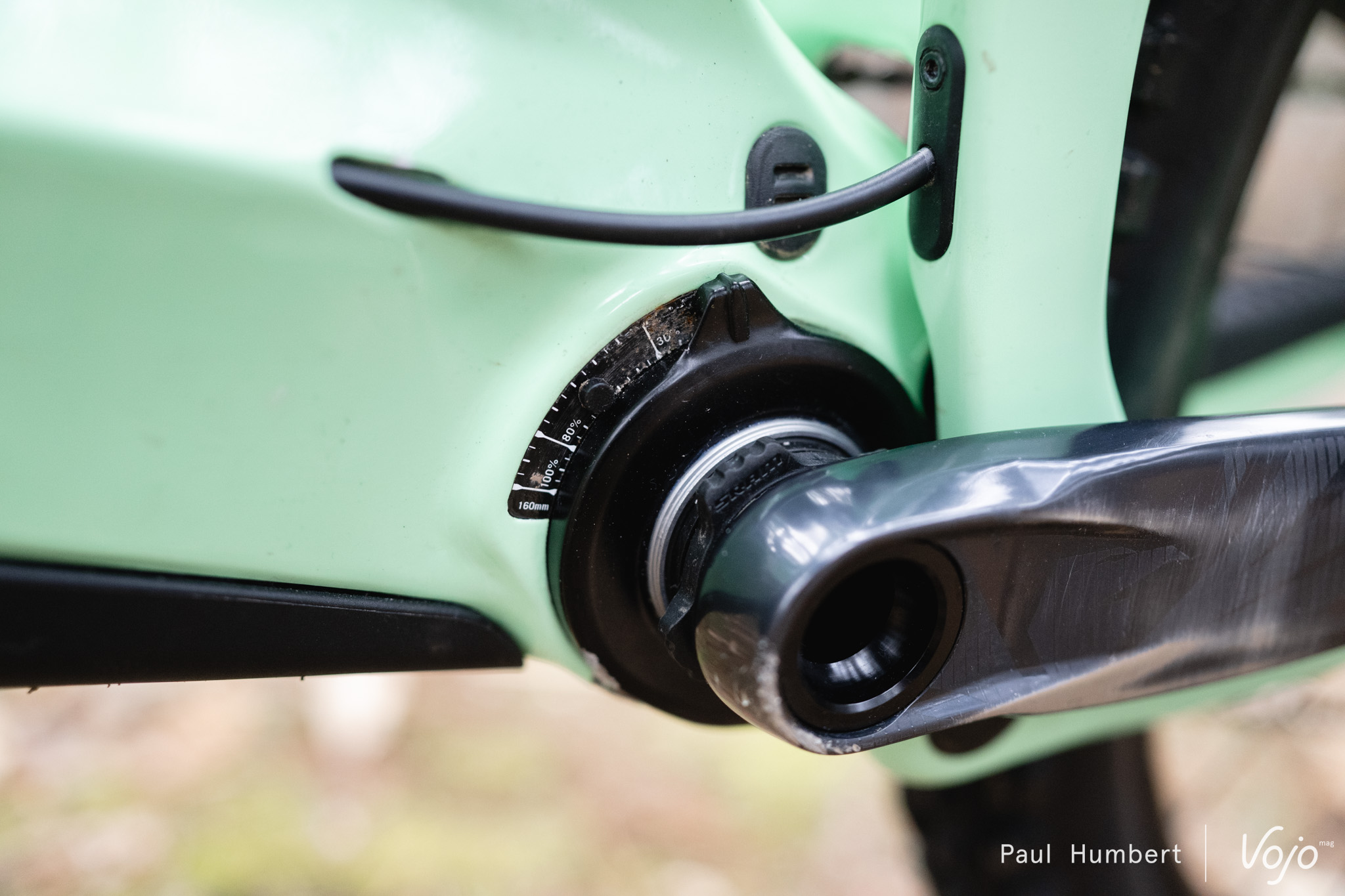 Pour les réglages de l’amortisseur, ça se passe sur le côté et en dessous. A gauche, juste au-dessus de la manivelle, on a une piste graduée qui représente le débattement et un petit aimant poussé par un « doigt » qui pivote en même temps que le basculeur. Ça fonctionne très bien et on peut ainsi se rendre compte facilement du débattement consommé sur un choc ou évaluer son sag.