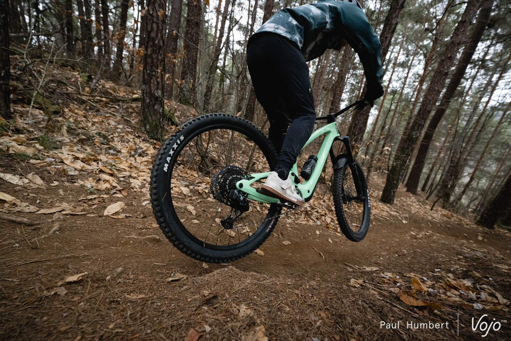 La suspension n’est pas étrangère à ces sensations. Il existe plus sensible dans la lecture pure du terrain mais elle fait preuve d’une belle souplesse en début de course ce qui la rend très confortable sur les chocs un minimum marqués et la fin de course est parfaitement gérée puisqu’on a régulièrement exploité tout le débattement sans jamais sentir de talonnage. Entre les deux, le milieu de course apparaît un peu plus discret mais c’est aussi ce qui rend le vélo facile à piloter et il a tout de même suffisamment de « pop » pour offrir des sensations naturelles sur les appels de sauts. Les pilotes les plus pointus le trouveront peut-être un poil creux mais pour l’essentiel des pratiquants ce n’est pas une si mauvaise chose, d’autant qu’avec la fin de course réussie on garde toujours le contrôle.