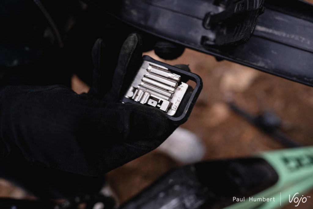 Allez, on rouvre une dernière fois le chapitre « Intégration » pour évoquer les divers outils cachés un peu partout sur le vélo. C’est tendance, ça permet de rouler sans sac tout en ayant de quoi réparer et ça ne casse pas la ligne du vélo donc c’est généralement bien vu et sur cet Unplugged comme sur les autres Bold, c’est réparti d’une extrémité à l’autre de la machine.