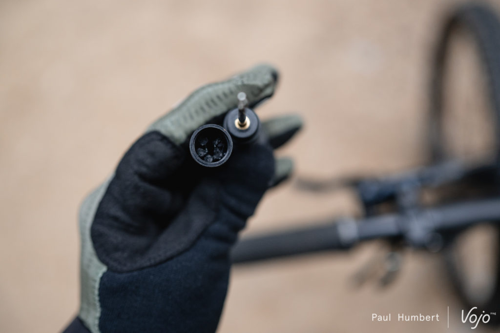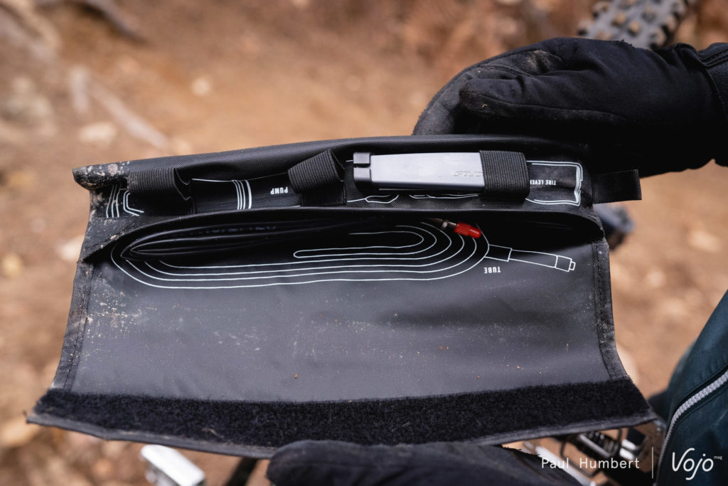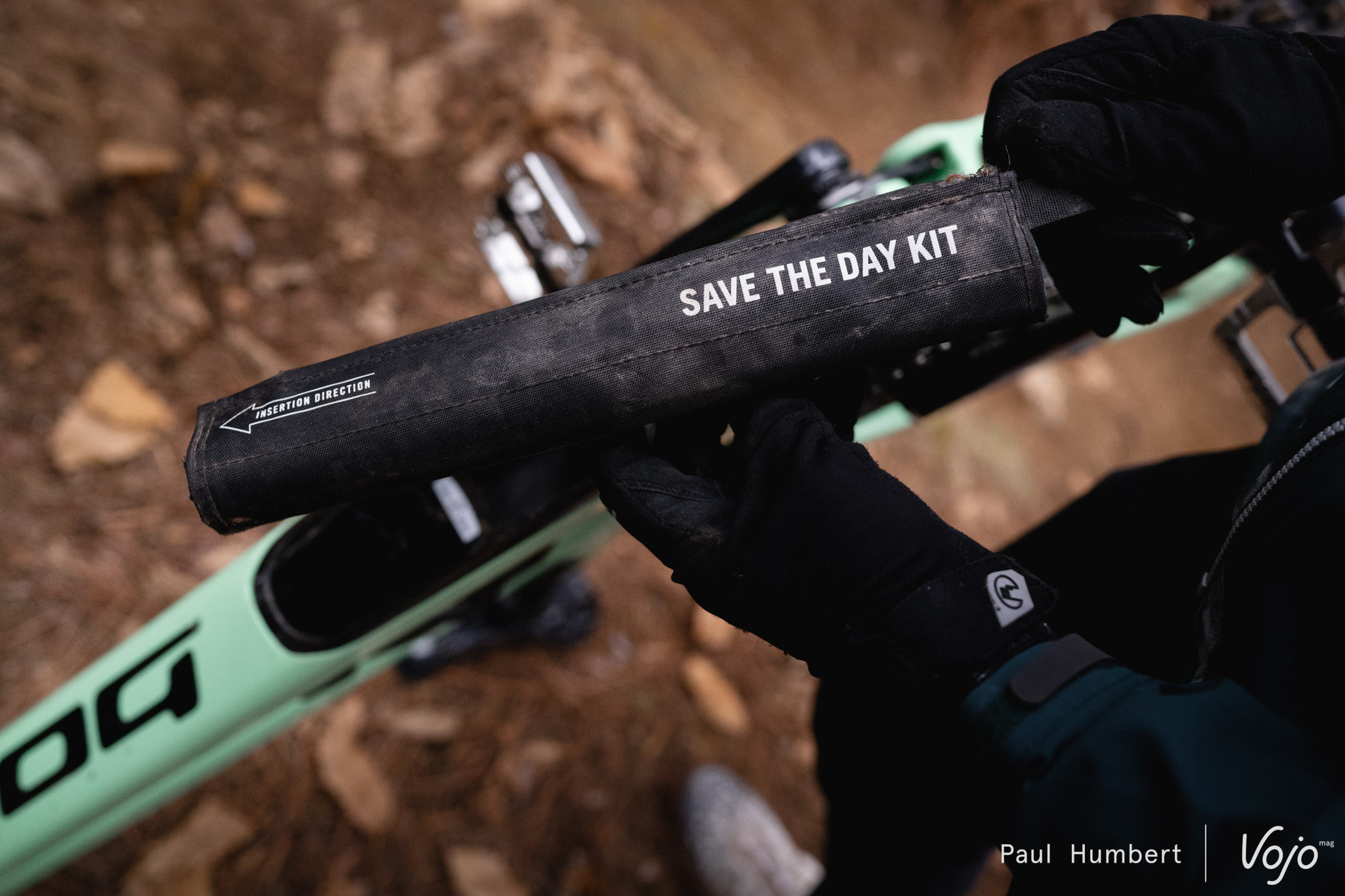 Sur l’axe de roue arrière, le levier est amovible (il est juste fermement clipsé) et cache trois clés : une T25, une T30 et une 6 mm hexagonale. Comme Scott, Bold utilise beaucoup de vis Torx et ces trois-là peuvent déjà faire beaucoup de choses sur le vélo. Un peu plus vers l’avant, dans la trappe qui donne accès à l’amortisseur, on a le Save The Day Kit : une pompe, une chambre à air et deux démonte-pneus pour gérer les… crevaisons, quoi d’autre ?