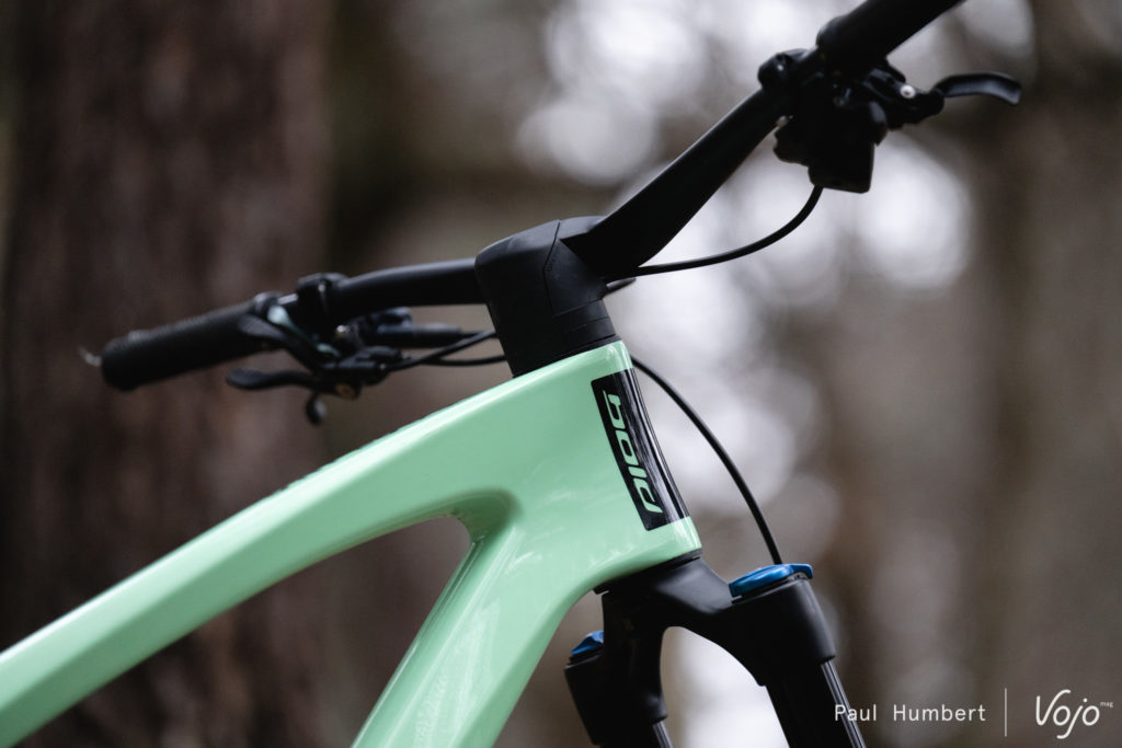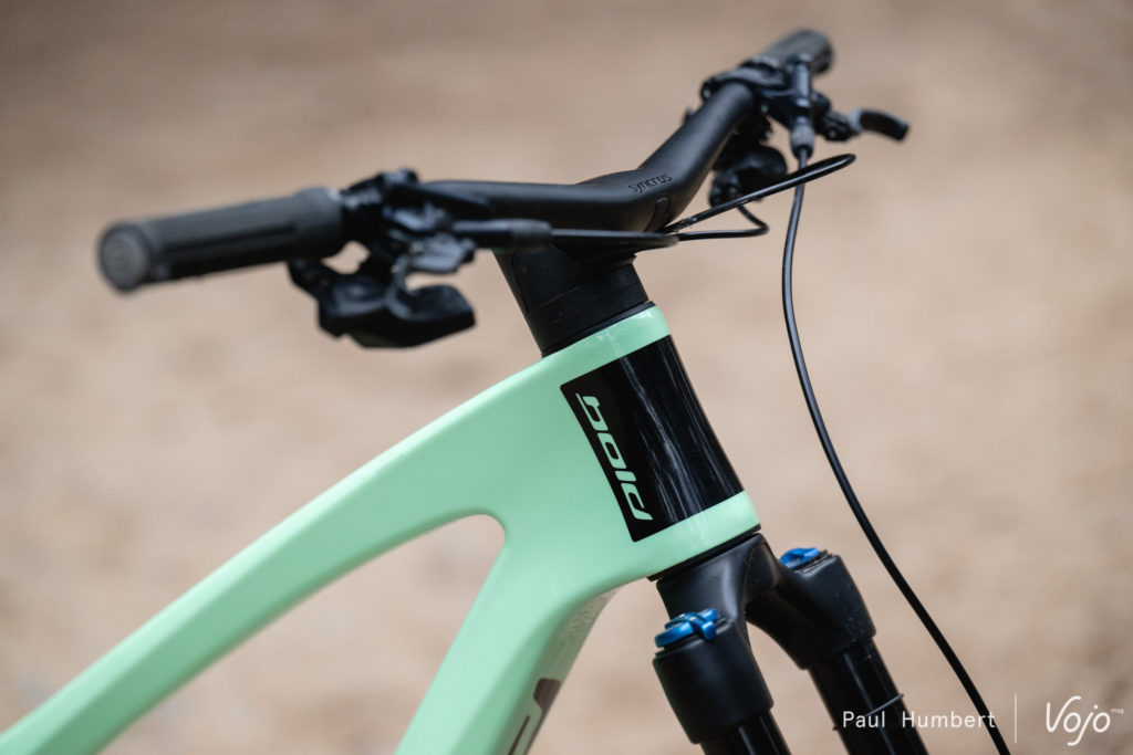 Les gaines et Durits restantes (tige de selle télescopique, blocage d’amortisseur, frein arrière) passent elles en interne, via le jeu de direction évidemment. Nouvelle marotte des constructeurs, ce choix technique est amplement critiquable pour son côté malcommode lorsqu’on veut faire des réglages ou entretenir son vélo, mais Bold est peut-être la seule marque à qui il serait malhonnête de le reprocher. Le credo de la marque est de pousser l’intégration au maximum et elle s’y tient, c’est cohérent. D’ailleurs, sur le même thème et puisqu’on parlait de haut de gamme un peu plus haut, notez que tous les Unplugged 2e génération sont montés avec le poste de pilotage en une pièce Syncros Hixon iC. Aucun vélo n’est vendu avec un ensemble cintre-potence classique.
