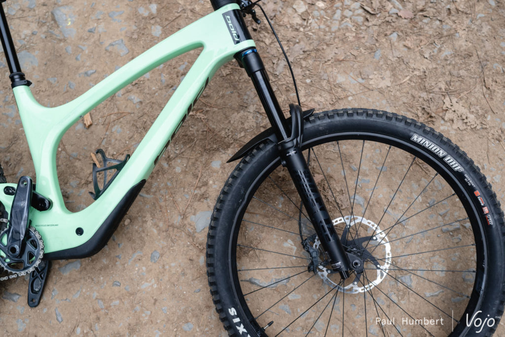 Pour finir, notez qu’avec cet angle de direction de 63,2° combiné à un stack dans la moyenne haute du segment, l’Unplugged est plus à l’aise lorsqu’il y a un minimum de pente. Lorsque le terrain est trop plat il peut être difficile de charger suffisamment la roue avant et le vélo tend alors au sous-virage… mais qui choisit un vélo en 160/170 mm pour rouler sur du faux plat ? Retourner les coupelles du jeu de direction pour passer à 64,5° d’angle permet probablement de corriger un peu cela mais nous n’avons pas encore pu essayer cette configuration.
