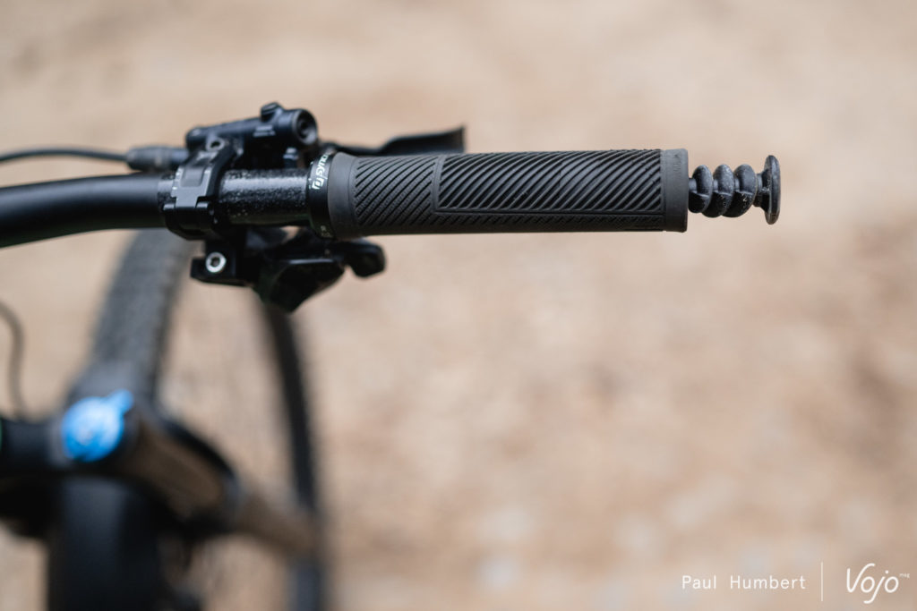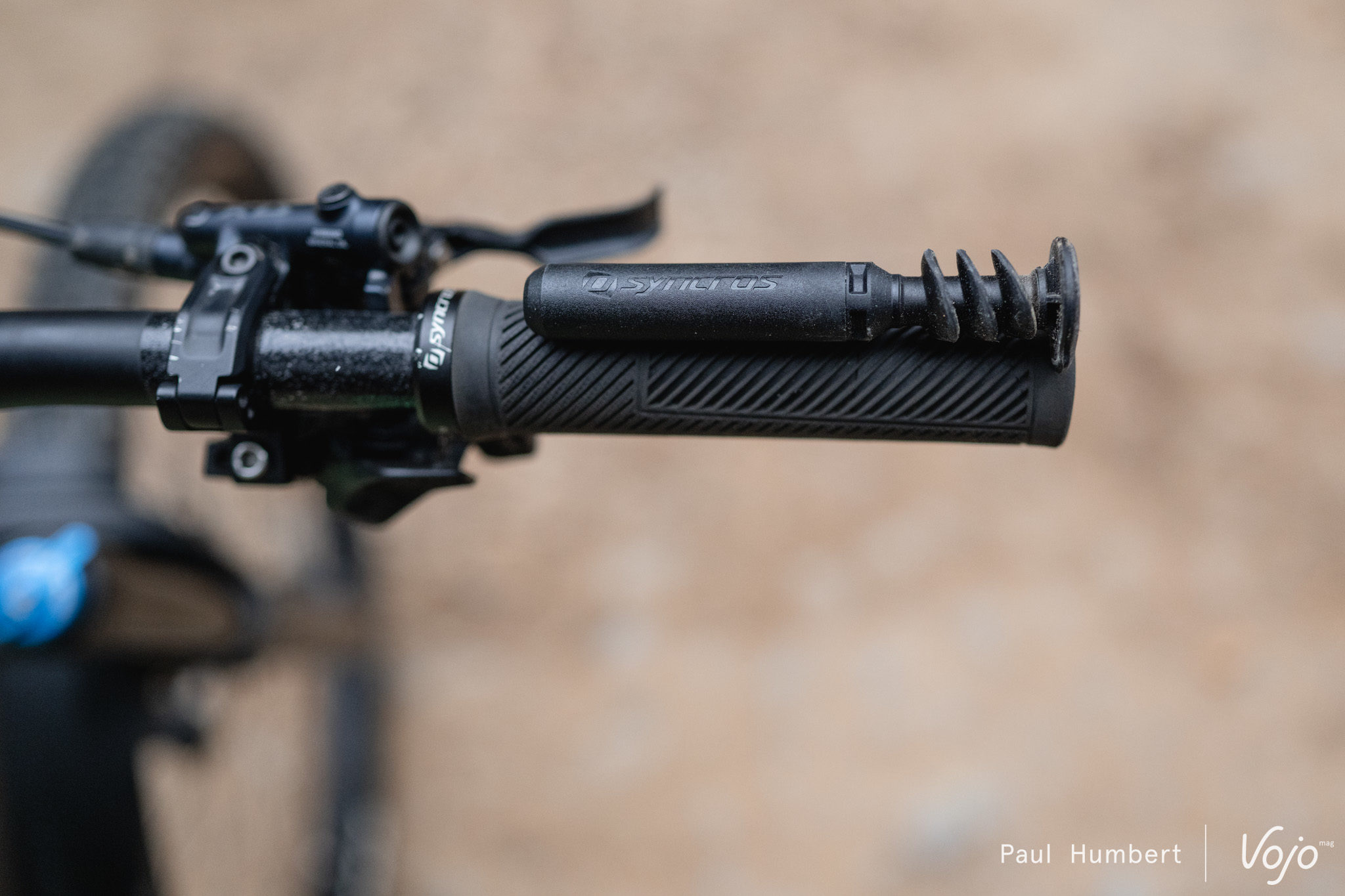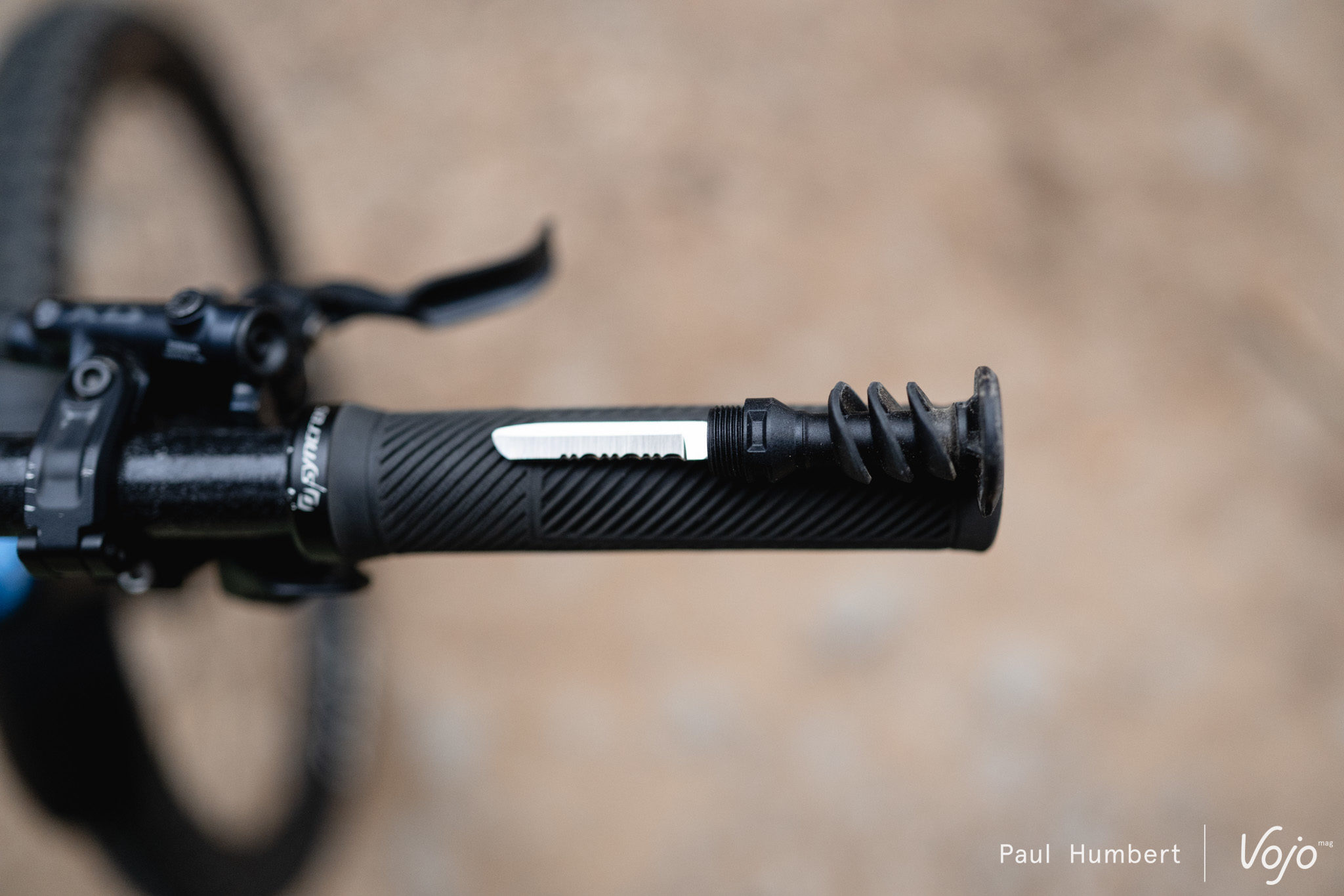Enfin, notre modèle est équipé du kit de réparation tubeless Syncros, conçu pour se glisser dans le cintre et s’intégrer parfaitement avec les poignées de la même marque grâce à leur petite encoche pour faciliter la sortie du cintre. Aiguille et mèche d’un côté, couteau de l’autre pour couper l’excédent une fois la mèche en place, c’est une addition bien pratique aux outils déjà présents.