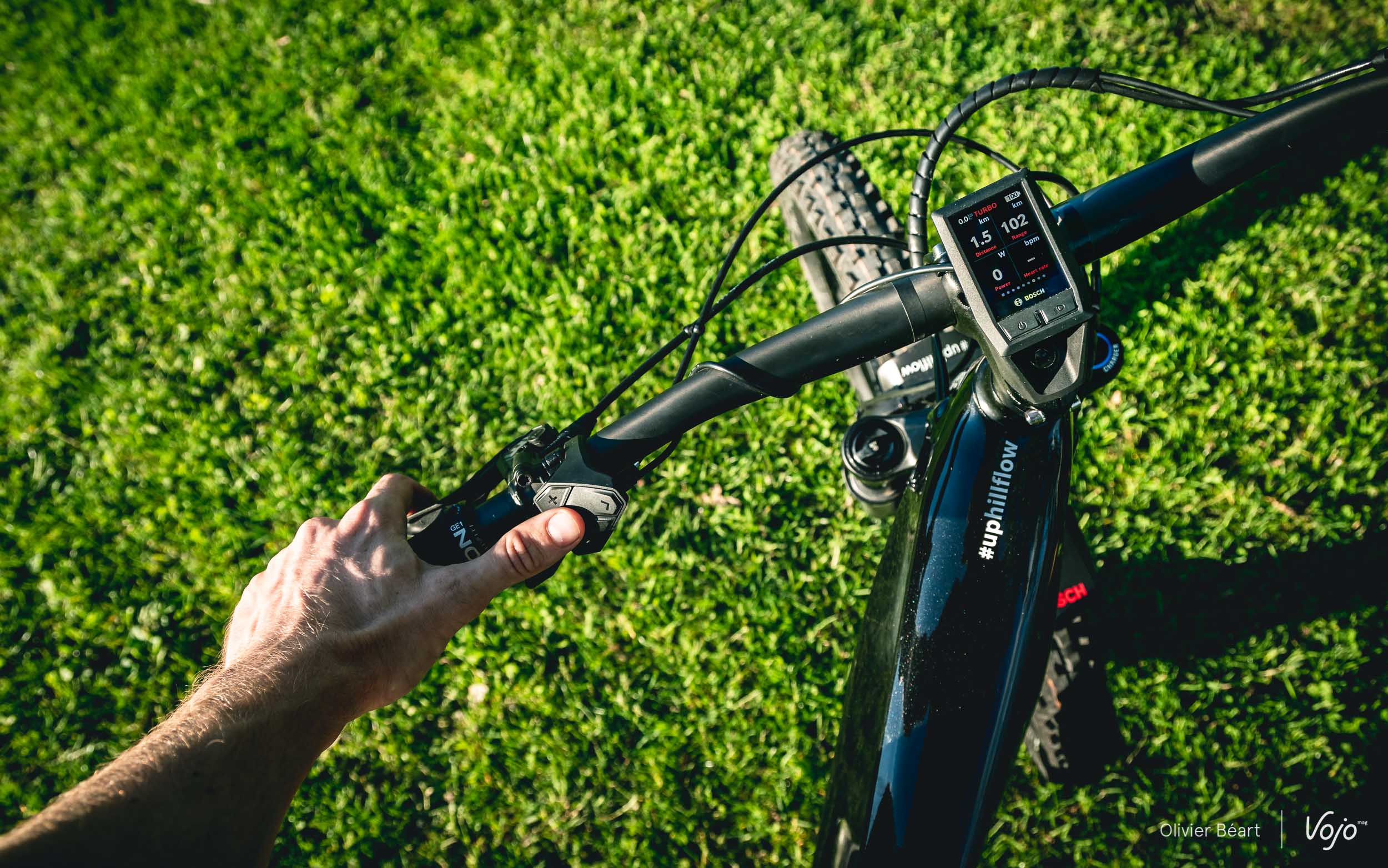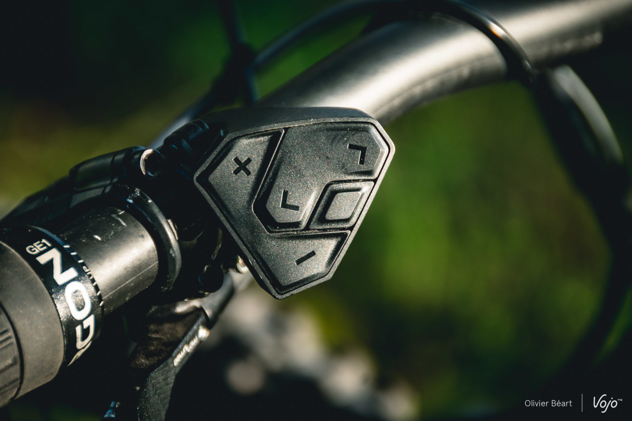 Le nouveau Kiox est combiné à une nouvelle commande permettant à la fois de faire varier l’assistance et de naviguer dans les menus du Kiox qui affichent des informations telles que le kilométrage, l’autonomie, la cadence, etc. Ces pages sont personnalisables. Comme nous le verrons lors de notre test, cette commande agréable à l’œil et bien finie est par contre perfectible au niveau de l’ergonomie, du moins pour un usage vtt.